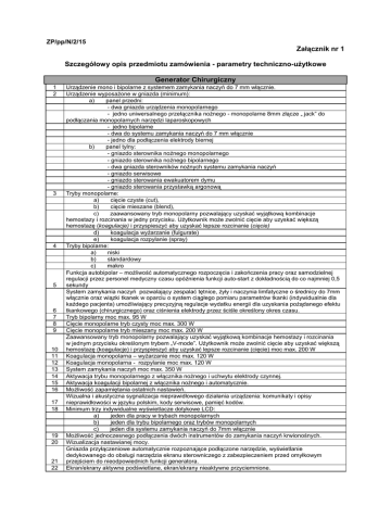 ZP/pp/N/2/15 Załącznik nr 1 Szczegółowy opis przedmiotu zamówienia - parametry techniczno-uŜytkowe Generator Chirurgiczny 1 2 3 4 5 6 7 8 9 10 11 12 13 14 15 16 17 18 19 20 21 22 Urządzenie mono i bipolarne z systemem zamykania naczyń do 7 mm włącznie. Urządzenie wyposaŜone w gniazda (minimum): a) panel przedni: - dwa gniazda urządzenia monopolarnego - jedno uniwersalnego przełącznika noŜnego - monopolarne 8mm złącze „ jack” do podłączania monopolarnych narzędzi laparoskopowych - jedno bipolarne - dwa do systemu zamykania naczyń do 7 mm włącznie - jedno dla podłączenia elektrody biernej b) panel tylny: - gniazdo sterownika noŜnego monopolarnego - gniazdo sterownika noŜnego bipolarnego - dwa gniazda sterowników noŜnych systemu zamykania naczyń - gniazdo serwisowe - gniazdo sterowania ewakuatorem dymu - gniazdo sterowania przystawką argonową Tryby monopolarne: a) cięcie czyste (cut), b) cięcie mieszane (blend), c) zaawansowany tryb monopolarny pozwalający uzyskać wyjątkową kombinacje hemostazy i rozcinania w jedny przycisku. UŜytkownik moŜe zwolnić cięcie aby uzyskać większą hemostazę (koagulacje) i przyspieszyć aby uzyskać lepsze rozcinanie (cięcie) d) koagulacja wyŜarzanie (fulgurate) e) koagulacja rozpylanie (spray) Tryby bipolarne: a) niski b) standardowy c) makro Funkcja autobipolar – moŜliwość automatycznego rozpoczęcia i zakończenia pracy oraz samodzielnej regulacji przez personel medyczny czasu opóźnienia funkcji auto-start z dokładnością do co najmniej 0,5 sekundy System zamykania naczyń pozwalający zespalać tętnice, Ŝyły i naczynia limfatyczne o średnicy do 7mm włącznie oraz wiązki tkanek w oparciu o system ciągłego pomiaru parametrów tkanki (indywidualnie dla kaŜdego pacjenta) umoŜliwiający precyzyjną regulacje wydatku energii dla uzyskania poŜądanego efektu tkankowego (chirurgicznego) oraz ciśnienia elektrody przez ściśle określony okres czasu. Tryb bipolarny moc max. 95 W Cięcie monopolarne tryb czysty moc max. 300 W Cięcie monopolarne tryb mieszany moc max. 200 W Zaawansowany tryb monopolarny pozwalający uzyskać wyjątkową kombinacje hemostazy i rozcinania w jednym przycisku określonym trybem „V-mode”. UŜytkownik moŜe zwolnić cięcie aby uzyskać większą hemostazę (koagulacje) i przyspieszyć aby uzyskać lepsze rozcinanie (cięcie) moc max. 200 W Koagulacja monopolarna – wyŜarzanie moc max. 120 W Koagulacja monopolarna - rozpylanie moc max. 120 W System zamykania naczyń moc max. 350 W Aktywacja trybu monopolarnego z włącznika noŜnego i uchwytu elektrody czynnej. Aktywacja koagulacji bipolarnej z włącznika noŜnego i automatycznie. MoŜliwość zapamiętania ostatnich nastawień. Wizualna i akustyczna sygnalizacja nieprawidłowego działania urządzenia: komunikaty i opisy nieprawidłowości w języku polskim, kody serwisowe, pamięć kodów. Minimum trzy indywidualne wyświetlacze dotykowe LCD: a) jeden dla pracy w trybach monopolarnych b) jeden dla trybu bipolarnego oraz trybów monopolarnych c) jeden dla systemu zamykania naczyń do 7mm włącznie MoŜliwość jednoczesnego podłączenia dwóch instrumentów do zamykania naczyń krwionośnych. Wizualizacja nastawianej mocy. Gniazda przyłączeniowe automatycznie rozpoznające podłączone narzędzie, wyświetlanie dedykowanego do obsługi narzędzia ekranu sterowniczego z zabezpieczeniem przed omyłkowym przejściem do nieodpowiednich funkcji generatora. Ekran/ekrany aktywne podświetlane, ekran/ekrany nieaktywne przyciemnione. 23 24 25 26 27 28 29 30 31 32 33 34 35 36 37 38 39 40 44 MoŜliwość ustawiania mocy zaawansowanego trybu monopolarnego ze sterylnego pola. MoŜliwość bezpłatnej aktualizacji oprogramowania w urządzeniu przez uŜytkownika (update) Aparat z zabezpieczeniem przed impulsem defibrylacji zgodnie z normą IEC 60601-2-2 Urządzenie wyposaŜone w system zabezpieczenia pacjenta przed poparzeniem w polu przylegania płytki biernej - automatyczny, adaptywny system bezpieczeństwa dla elektrody powrotnej w zakresie min 5135Ohm W razie złej aplikacji elektrody powrotnej, aparat alarmuje o stanie zagroŜenia – sygnałem dźwiękowym zgodnie z normą 60601-2-2 - 65 dBA (bez moŜliwości zewnętrznej regulacji) i wizualnie za pomocą wyświetlanych na ekranach komunikatach. W konsekwencji przerywana jest praca aparatu. Wózek montaŜowy ze stali kwasoodpornej, dla elektrokoagulacji z systemem zamykania naczyń, min cztery półki, szuflada, uchwyty na przewody sieciowe, blokada minimum dwóch kółek. Trzy przyciskowy włącznik noŜny monopolarny do cięcia, koagulacji i trybu „V-mode” pozwalającym uzyskać jednoczesne cięcia z koagulacją przy zachowaniu minimalnego rozprzestrzenienia termicznego, kompatybilny z generatorem Valleylab Force Triad. MoŜliwość wykonywania zabiegów artroskopowych z kompatybilnymi elektrodami monopolarnymi. Współpraca z resektoskopem firmy STORZ uzyskując przy tym tryb resekcji bipolarnej. Kompatybilność z wpinaną jednorazową nakładką Typ: LS3112, pasująca do kleszczyków wielorazowych kompatybilnych z systemem zamykania naczyń do 7 mm włacznie (LigaSure), aktywacja noŜna i ręczna kompatybilna z generatorami Valleylab. Kompatybilność z posiadanymi wielorazowymi elektrodami monopolarnmi, typ:E2100 Kompatybilność z posiadanym wielorazowym kablem typ:E0560 do płytki biernej typ:HRA5 Kompatybilność z posiadanymi wielorazowymi kleszczykami typ: LS3110 do jednorazowej nakładki pracującej w systemie zamykania naczyń do 7mm włącznie (Liga Sure) oraz generatorem Force Triad. Automatyczny test urządzenia po uruchomieniu. Informacja o poprawnym podłączeniu elektrody biernej na wyświetlaczu urządzenia. Zabezpieczenie przeciwporaŜeniowe Klasa I CF (normy IEC 60601-1 drugie wydanie oraz IEC 60601-2-2 trzecie wydanie) Zabezpieczenie przed przeciąŜeniem aparatu oraz w przypadku przejścia z zasilania prądem zmiennym na zasilanie z awary