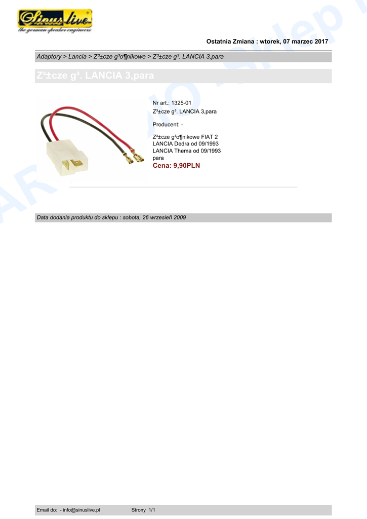 e l k -S i p Ostatnia Zmiana : wtorek, 07 marzec 2017 Adaptory > Lancia > Z³±cze g³o¶nikowe > Z³±cze g³. LANCIA 3,para Z³±cze g³. LANCIA 3,para O I D Nr art.: 1325-01 Z³±cze g³. LANCIA 3,para Producent: - A U A R Z³±cze g³o¶nikowe FIAT 2 LANCIA Dedra od 09/1993 LANCIA Thema od 09/1993 para Cena: 9,90PLN Data dodania produktu do sklepu : sobota, 26 wrzesieñ 2009 Email do: - [email protected] Strony 1/1