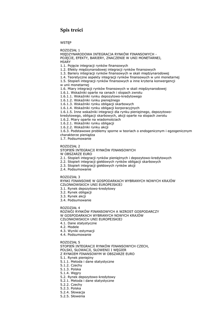 Spis treści WSTĘP ROZDZIAŁ 1 MIĘDZYNARODOWA INTEGRACJA RYNKÓW FINANSOWYCH POJĘCIE, EFEKTY, BARIERY, ZNACZENIE W UNII MONETARNEJ, MIARY 1.1. Pojęcie integracji rynków finansowych 1.2. Efekty międzynarodowej integracji rynków finansowych 1.3. Bariery integracji rynków finansowych w skali międzynarodowej 1.4. Teoretyczne aspekty integracji rynków finansowych w unii monetarnej 1.5. Stopień integracji rynków finansowych a inne kryteria konwergencji w unii monetarnej 1.6. Miary integracji rynków finansowych w skali międzynarodowej 1.6.1. Wskaźniki oparte na cenach i stopach zwrotu 1.6.1.1. Wskaźniki rynku depozytowo-kredytowego 1.6.1.2. Wskaźniki rynku pieniężnego 1.6.1.3. Wskaźniki rynku obligacji skarbowych 1.6.1.4. Wskaźniki rynku obligacji korporacyjnych 1.6.1.5. Inne wskaźniki integracji dla rynku pieniężnego, depozytowokredytowego, obligacji skarbowych, akcji oparte na stopach zwrotu 1.6.2. Miary oparte na wiadomościach 1.6.2.1. Wskaźniki rynku obligacji 1.6.2.2. Wskaźniki rynku akcji 1.6.3. Podstawowe problemy sporne w teoriach o endogenicznym i egzogenicznym charakterze pieniądza 1.7. Podsumowanie ROZDZIAŁ 2 STOPIEŃ INTEGRACJI RYNKÓW FINANSOWYCH W OBSZARZE EURO 2.1. Stopień integracji rynków pieniężnych i depozytowo-kredytowych 2.2. Stopień integracji giełdowych rynków obligacji skarbowych 2.3. Stopień integracji giełdowych rynków akcji 2.4. Podsumowanie ROZDZIAŁ 3 RYNKI FINANSOWE W GOSPODARKACH WYBRANYCH NOWYCH KRAJÓW CZŁONKOWSKICH UNII EUROPEJSKIEJ 3.1. Rynek depozytowo-kredytowy 3.2. Rynek obligacji 3.3. Rynek akcji 3.4. Podsumowanie ROZDZIAŁ 4 ROZWÓJ RYNKÓW FINANSOWYCH A WZROST GOSPODARCZY W GOSPODARKACH WYBRANYCH NOWYCH KRAJÓW CZŁONKOWSKICH UNII EUROPEJSKIEJ 4.1. Dane statystyczne 4.2. Modele 4.3. Wyniki estymacji 4.4. Podsumowanie ROZDZIAŁ 5 STOPIEŃ INTEGRACJI RYNKÓW FINANSOWYCH CZECH, POLSKI, SŁOWACJI, SŁOWENII I WĘGIER Z RYNKIEM FINANSOWYM W OBSZARZE EURO 5.1. Rynek pieniężny 5.1.1. Metoda i dane statystyczne 5.1.2. Czechy 5.1.3. Polska 5.1.4. Węgry 5.2. Rynek depozytowo-kredytowy 5.2.1. Metoda i dane statystyczne 5.2.2. Czechy 5.2.3. Polska 5.2.4. Słowacja 5.2.5. Słowenia 5.2.6. Węgry 5.3. Giełdowy rynek obligacji skarbowych 5.3.1. Metoda i dane statystyczne 5.3.2. Czechy 5.3.3. Polska 5.3.4. Słowacja 5.3.5. Słowenia 5.3.6. Węgry 5.4. Giełdowy rynek akcji 5.4.1. Metoda i dane statystyczne 5.4.2. Czechy 5.4.3. Polska 5.4.4. Słowacja 5.4.5. Słowenia 5.4.6. Węgry 5.5. Podsumowanie ROZDZIAŁ 6 INTEGRACJA RYNKÓW FINANSOWYCH Z RYNKIEM FINANSOWYM W OBSZARZE EURO A WZROST GOSPODARCZY W WYBRANYCH NOWYCH KRAJACH CZŁONKOWSKICH UNII EUROPEJSKIEJ 6.1. Wyniki wybWSTĘP ROZDZIAŁ 1 MIĘDZYNARODOWA INTEGRACJA RYNKÓW FINANSOWYCH POJĘCIE, EFEKTY, BARIERY, ZNACZENIE W UNII MONETARNEJ, MIARY 1.1. Pojęcie integracji rynków finansowych 1.2. Efekty międzynarodowej integracji rynków finansowych 1.3. Bariery integracji rynków finansowych w skali międzynarodowej 1.4. Teoretyczne aspekty integracji rynków finansowych w unii monetarnej 1.5. Stopień integracji rynków finansowych a inne kryteria konwergencji w unii monetarnej 1.6. Miary integracji rynków finansowych w skali międzynarodowej 1.6.1. Wskaźniki oparte na cenach i stopach zwrotu 1.6.1.1. Wskaźniki rynku depozytowo-kredytowego 1.6.1.2. Wskaźniki rynku pieniężnego 1.6.1.3. Wskaźniki rynku obligacji skarbowych 1.6.1.4. Wskaźniki rynku obligacji korporacyjnych 1.6.1.5. Inne wskaźniki integracji dla rynku pieniężnego, depozytowokredytowego, obligacji skarbowych, akcji oparte na stopach zwrotu 1.6.2. Miary oparte na wiadomościach 1.6.2.1. Wskaźniki rynku obligacji 1.6.2.2. Wskaźniki rynku akcji 1.6.3. Podstawowe problemy sporne w teoriach o endogenicznym i egzogenicznym charakterze pieniądza 1.7. Podsumowanie ROZDZIAŁ 2 STOPIEŃ INTEGRACJI RYNKÓW FINANSOWYCH W OBSZARZE EURO 2.1. Stopień integracji rynków pieniężnych i depozytowo-kredytowych 2.2. Stopień integracji giełdowych rynków obligacji skarbowych 2.3. Stopień integracji giełdowych rynków akcji 2.4. Podsumowanie ROZDZIAŁ 3 RYNKI FINANSOWE W GOSPODARKACH WYBRANYCH NOWYCH KRAJÓW CZŁONKOWSKICH UNII EUROPEJSKIEJ 3.1. Rynek depozytowo-kredytowy 3.2. Rynek obligacji 3.3. Rynek akcji 3.4. Podsumowanie ROZDZIAŁ 4 ROZWÓJ RYNKÓW FINANSOWYCH A WZROST GOSPODARCZY W GOSPODARKACH WYBRANYCH NOWYCH KRAJÓW CZŁONKOWSKICH UNII EUROPEJSKIEJ 4.1. Dane statystyczne 4.2. Modele 4.3. Wyniki estymacji 4.4. Podsumowanie ROZDZIAŁ 5 STOPIEŃ INTEGRACJI RYNKÓW FINANSOWYCH CZECH, POLSKI, SŁOWACJI, SŁOWENII I WĘGIER Z RYNKIEM FINANSOWYM W OBSZARZE EURO 5.1. Rynek pieniężny 5.1.1. Metoda i dane statystyczne 5.1.2. Czechy 5.1.3. Polska 5.1.4. Węgry 5.2. Rynek depozytowo-kredytowy 5.2.1. Metoda i dane statystyczne 5.2.2. Czechy 5.2.3. Polska 5.2.4. Słowacja 5.2.5. Słowenia 5.2.6. Węgry 5.3. Giełdowy rynek obligacji skarbowych 5.3.1. Metoda i dane statystyczne 5.3.2. Czechy 5.3.3. Polska 5.3.4. Słowacja 5.3.5. Słowenia 5.3.6. Węgry 5.4. Giełdowy rynek akcji 5.4.1. Metoda i dane statystyczne 5.4.2. Czechy 5.4.3. Polska 5.4.4. Słowacja 5.4.5. Słowenia 5.4.6. Węgry 5.5. Podsumowanie ROZDZIAŁ 6 INTEGRACJA RYNKÓW FINANSOWYCH Z RYNKIEM FINANSOWYM W OBSZARZE EURO A WZROST GOSPODARCZY W WYBRANYCH NOWYCH KRAJACH CZŁONKOWSKICH UNII EUROPEJSKIEJ 6.1. Wyniki wybranych badań empirycznych 6.2. Analiza wpływu integracji rynków finansowych na wzrost gospodarczy w badanej grupie krajów 6.2.1. Dane statystyczne 6.2.2. Modele 6.2.3. Wyniki estymacji 6.3. Podsumowanie ZAKOŃCZENIE BIBLIOGRAFIA SPIS RYSUNKÓW SPIS TABEL ranych badań empirycznych 6.2. Analiza wpływu integracji rynków finansowych na wzrost gospodarczy w badanej grupie krajów 6.2.1. Dane statystyczne 6.2.2. Modele 6.2.3. Wyniki estymacji 6.3. Podsumowanie ZAKOŃCZENIE BIBLIOGRAFIA SPIS SPIS TABEL RYSUNKÓW