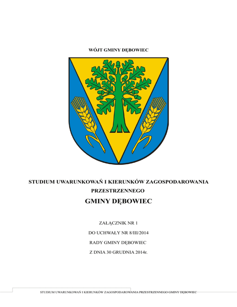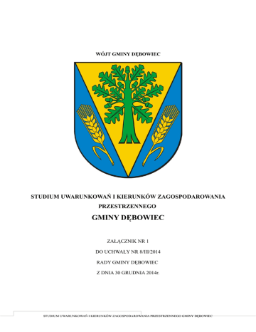 WÓJT GMINY DĘBOWIEC STUDIUM UWARUNKOWAŃ I KIERUNKÓW ZAGOSPODAROWANIA PRZESTRZENNEGO GMINY DĘBOWIEC ZAŁĄCZNIK NR 1 DO UCHWAŁY NR 8/III/2014 RADY GMINY DĘBOWIEC Z DNIA 30 GRUDNIA 2014r. STUDIUM UWARUNKOWAŃ I KIERUNKÓW ZAGOSPODAROWANIA PRZESTRZENNEGO GMINY DĘBOWIEC ZESPÓŁ AUTORSKI: mgr inż. arch. Adam Nowak (KT-020) mgr inż. arch. Dorota Biernacka Nowak (KT-148) mgr inż. Krzysztof Sikora (KT-467) mgr inż. Marek Nowicki inż. Maciek Płatek STUDIUM UWARUNKOWAŃ I KIERUNKÓW ZAGOSPODAROWANIA PRZESTRZENNEGO GMINY DĘBOWIEC SPIS TREŚCI ROZDZIAŁ STR. WPROWADZENIA 1. 1.1. 1.2. 1.3. 1.4. 1.5. WPROWADZENIE PODSTAWY FORMALNO – PRAWNE OPRACOWANIA STUDIUM ZAKRES MERYTORYCZNY I TOK SPORZĄDZANIA STUDIUM CEL STUDIUM ZAŁOŻENIA STUDIUM KONSTRUKCJA STUDIUM 10 10 10 12 13 14 UWARUNKOWANIA 2. UWARUNKOWANIA ZAGOSPODAROWANIA PRZESTRZENNEGO 2.1. DOTYCHCZASOWE PRZEZNACZENIE, ZAGOSPODAROWANIE I 17 17 UZBROJENIE TERENU, STAN ŁADU PRZESTRZENNEGO I WYMOGI JEGO OCHRONY 2.1.1. POŁOŻENIE GMINY DĘBOWIEC 2.1.2. STRUKTURA FUNKCJONALNO – PRZESTRZENNA, DOTYCHCZASOWE ZAGOSPODAROWANIE TERENÓW GMINY DĘBOWIEC 2.2. STAN ŚRODOWISKA, W TYM STAN ROLNICZEJ I LEŚNEJ 17 21 23 PRZESTRZENI PRODUKCYJNEJ, WIELKOŚĆ I JAKOŚĆ ZASOBÓW WODNYCH ORAZ WYMOGI OCHRONY ŚRODOWISKA, PRZYRODY I 2.2.1. 2.2.2. 2.2.3. 2.2.4. 2.2.4.1. 2.2.4.2. 2.2.4.3. 2.2.5. 2.2.6. 2.2.7. 2.2.8. 2.2.8.1. 2.2.8.2. 2.2.9. 2.2.10. 2.2.11. 2.2.12. 2.3. KRAJOBRAZU KULTUROWEGO POŁOŻENIE GEOGRAFICZNO – PRZYRODNICZE UKSZTAŁTOWANIE POWIERZCHNI TERENU – GEOMORFOLOGIA BUDOWA GEOLOGICZNA I TEKTONICZNA WODY POWIERZCHNIOWE I PODZIEMNE WODY POWIERZCHNIOWE WODY PODZIEMNE UJĘCIA WÓD PODZIEMNYCH OBSZARY SIECI NATURA 2000 POMNIKI PRZYRODY OŻYWIONEJ OBSZARY PRZYRODNICZO CENNE STAN ROLNICZEJ I LEŚNEJ PRZESTRZENI PRODUKCYJNEJ STAN ROLNICZEJ PRZESTRZENI PRODUKCYJNEJ STAN LEŚNEJ PRZESTRZENI PRODUKCYJNEJ CHARAKTERYSTYKA I UŻYTKOWANIE GLEB STOPIEŃ SKAŻENIA GLEB ZŁOŻA SUROWCÓW MINERALNYCH, GÓRNICTWO ZAGROŻENIA ŚRODOWISKA STAN DZIEDZICTWA KULTUROWEGO I ZABYTKÓW ORAZ DÓBR 23 23 24 24 24 25 26 26 26 27 31 31 32 32 33 36 37 38 KULTURY WSPÓŁCZESNEJ 2.3.1. OBIEKTY I OBSZARY WPISANE DO REJESTRU ZABYTKÓW 2.3.2. OBIEKTY I OBSZARY ZNAJDUJĄCE SIĘ W GMINNEJ EWIDENCJI 39 40 ZABYTKÓW 2.3.3. STANOWISKA ARCHEOLOGICZNE 2.3.4. MIEJSCA PAMIĘCI 2.4. WARUNKI I JAKOŚĆ ŻYCIA MIESZKAŃCÓW, W TYM OCHRONA ICH 45 46 46 ZDROWIA 2.4.1. LUDNOŚĆ I DEMOGRAFIA 2.4.2. ZASOBY MIESZKANIOWE I STANDARDY ZAMIESZKANIA 46 50 STUDIUM UWARUNKOWAŃ I KIERUNKÓW ZAGOSPODAROWANIA PRZESTRZENNEGO GMINY DĘBOWIEC 2.4.3. 2.4.4. 2.4.5. 2.4.6. 2.4.7. 2.5. 2.6. 2.7. EDUKACJA RYNEK PRACY I BEZROBOCIE OCHRONA ZDROWIA I OPIEKA SPOŁECZNA KULTURA SPORT, REKREACJA I TURYSTYKA ZAGROŻENIA BEZPIECZEŃSTWA LUDNOŚCI I JEJ MIENIA POTRZEBY I MOŻLIWOŚCI ROZWOJU GMINY WYSTĘPOWANIE OBIEKTÓW I TERENÓW CHRONIONYCH NA 50 50 52 52 53 53 54 56 PODSTAWIE PRZEPISÓW ODRĘBNYCH 2.8. WYSTĘPOWANIE OBSZARÓW NATURALNYCH ZAGROŻEŃ 57 GEOLOGICZNYCH 2.9. WYSTĘPOWANIE UDOKUMENTOWANYCH ZŁÓŻ KOPALIN, 57 ZASOBÓW WÓD PODZIEMNYCH ORAZ UDOKUMENTOWANYCH KOMPLEKSÓW PODZIEMNEGO SKŁADOWANIA DWUTLENKU WĘGLA 2.10. WYSTĘPOWANIE TERENÓW GÓRNICZYCH WYZNACZONYCH NA 57 PODSTAWIE PRZEPISÓW ODRĘBNYCH 2.11. STAN SYSTEMÓW KOMUNIKACJI I INFRASTRUKTURY 58 TECHNICZNEJ, W TYM STOPNIA UPORZĄDKOWANIA GOSPODARKI WODNO-ŚCIEKOWEJ, ENERGETYCZNEJ ORAZ GOSPODARKI ODPADAMI STAN SYSTEMU KOMUNIKACYJNEGO STAN INFRASTRUKTURY TECHNICZNEJ INFRASTRUKTURA WODOCIĄGOWA I KANALIZACYJNA INFRASTRUKTURA ELEKTROENERGETYCZNA INFRASTRUKTURA GAZOWNICZA STAN GOSPODARKI ODPADAMI ZADANIA SŁUŻĄCE REALIZACJI PONADLOKALNYCH CELÓW 58 60 60 60 61 61 62 PUBLICZNYCH 2.13. ZAMIERZENIA GMIN SASIEDNICH W ZAKRESIE PLANOWANIA 62 PRZESTRZENNEGO 2.14. WYMAGANIA DOTYCZĄCYCH OCHRONY 63 2.11.1. 2.11.2. 2.12.1.1. 2.12.1.3. 2.12.1.4. 2.11.3. 1.12. PRZECIWPOWODZIOWEJ KIERUNKI 3. KIERUNKI ZAGOSPODAROWANIA PRZESTRZENNEGO 3.1. KIERUNKI ZMIAN W STRUKTURZE PRZESTRZENNEJ GMINY ORAZ 65 65 W PRZEZNACZENIU TERENÓW STRATEGIA ROZWOJU GMINY DĘBOWIEC WIZJA ROZWOJU GMINY KIERUNKI ZMIAN W PRZEZNACZENIU TERENÓW KIERUNKI I WSKAŹNIKI DOTYCZĄCE ZAGOSPODAROWANIA 65 66 67 68 3.1.1. 3.1.2. 3.1.3. 3.2. ORAZ UŻYTKOWANIA TERENÓW, W TYM TERENY WYŁĄCZONE SPOD ZABUDOWY 3.3. OBSZARY ORAZ ZASADY OCHRONY ŚRODOWISKA I JEGO ZASOBÓW, OCHRONY PRZYRODY, KRAJOBRAZU KULTUROWEGO I UZDROWISK STUDIUM UWARUNKOWAŃ I KIERUNKÓW ZAGOSPODAROWANIA PRZESTRZENNEGO GMINY DĘBOWIEC 82 3.3.1. OBSZARY O WARTOŚCIACH PRZYRODNICZYCH WSKAZANE DO 82 OCHRONY 3.3.2. USTALENIA DOTYCZĄCE OCHRONY ŚRODOWISKA 3.3.3. STREFY OCHRONY SANITARNEJ OD CMENTARZY 3.4. OBSZARY I ZASADY OCHRONY DZIEDZICTWA KULTUROWEGO I 83 85 85 ZABYTKÓW ORAZ DÓBR KULTURY WSPÓŁCZESNEJ 3.4.1. OBIEKTY I OBSZARY WPISANE DO REJESTRU ZABYTKÓW 3.4.2. OBIEKTY I OBSZARY UJĘTE W GMINNEJ EWIDENCJI ZABYTKÓW 3.4.3. STANOWISKA ARCHEOLOGICZNE UJĘTE W GMINNEJ EWIDENCJI 85 86 92 ZABYTKÓW 3.4.4. ZASADY OCHRONY ZABYTKÓW UJĘTYCH W GMINNEJ EWIDENCJI 92 ZABYTKÓW 3.4.5. MIEJSCA PAMIĘCI 3.5. KIERUNKI ROZWOJU SYSTEMÓW KOMUNIKACJI I 93 93 3.5.1. 3.5.2. 3.5.2.1. 3.5.2.2. 3.5.2.3. 3.5.2.4. 3.5.2.5. 3.5.2.6. 3.5.2.7. INFRASTRUKTURY TECHNICZNEJ KIERUNKI ROZWOJU SYSTEMU KOMUNIKACJI KIERUNKI ROZWOJU INFRASTRUKTURY TECHNICZNEJ ENERGETYKA GAZOWNICTWO WODOCIĄGI KANALIZACJA CIEPŁOWNICTWO OBSŁUGA TELEKOMUNIKACYJNA OBSZARY ROZMIESZCZENIA URZĄDZEŃ WYTWARZAJĄCYCH 93 94 94 94 95 95 96 97 97 ENERGIĘ Z ODNAWIALNYCH ŹRÓDEŁ ENERGII 3.5.2.8. GOSPODARKA ODPADAMI 3.6. OBSZARY NA, KTÓRYCH ROZMIESZCZONE BĘDĄ INWESTYCJE 97 98 CELU PUBLICZNEGO O ZNACZENIU LOKALNYM 3.7. OBSZARY NA, KTÓRYCH ROZMIESZCZONE BĘDĄ INWESTYCJE 98 CELU PUBLICZNEGO O ZNACZENIU PONADLOKALNYM, ZGODNIE Z USTALENIAMI PLANU ZAGOSPODAROWANIA PRZESTRZENNEGO WOJEWÓDZTWA I USTALENIAMI PROGRAMÓW, O KTÓRYCH MOWA W ART. 48 UST.1 3.8. OBSZARY DLA KTÓRYCH OBOWIAZKOWE JEST SPORZADZENIE 100 MIEJSCOWEGO PLANU ZAGOSPODAROWANIA PRZESTRZENNEGO NA PODSTAWIE PRZEPISÓW ODRĘBNYCH, W TYM OB