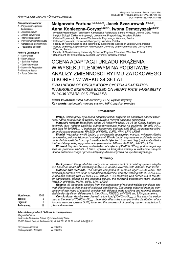 ARTYKUŁ ORYGINALNY / ORIGINAL ARTICLE Zaangażowanie Autorów A – Przygotowanie projektu badawczego B – Zbieranie danych C – Analiza statystyczna D – Interpretacja danych E – Przygotowanie manuskryptu F – Opracowanie piśmiennictwa G – Pozyskanie funduszy Author’s Contribution A – Study Design B – Data Collection C – Statistical Analysis D – Data Interpretation E – Manuscript Preparation F – Literature Search G – Funds Collection Medycyna Sportowa / Polish J Sport Med © MEDSPORTPRESS, 2015; 3(4); Vol. 31, 121-127 DOI: 10.5604/1232406X.1178558 Małgorzata Fortuna1(A,B,D,E,F), Jacek Szczurowski2(B,C,D), Anna Konieczna-Gorysz3(B,E,F), Iwona Demczyszak4(B,E,F) 1 Wydział Przyrodniczo-Techniczny, Karkonoska Państwowa Szkoła Wyższa, Jelenia Góra, Polska Instytut Biologii, Zakład Antropologii, Uniwersytet Przyrodniczy, Wrocław, Polska Katedra Fizjoterapii, Akademia Wychowania Fizycznego, Wrocław, Polska 4 Katedra Fizjoterapii, Uniwersytet Medyczny, Wrocław, Polska 1 Faculty of Natural Science and Technology, Karkonosze College in Jelenia Gora, Poland 2 Institute of Biology, Department of Anthropology, University of Environmental and Life Sciences, Wroclaw, Poland 3 Faculty of Physiotherapy, University School of Physical Education, Wroclaw, Poland 4 Department of Physiotherapy, Medical University, Wroclaw, Poland 2 3 OCENA ADAPTACJI UKŁADU KRĄŻENIA W WYSIŁKU TLENOWYM NA PODSTAWIE ANALIZY ZMIENNOŚCI RYTMU ZATOKOWEGO U KOBIET W WIEKU 34-36 LAT EVALUATION OF CIRCULATORY SYSTEM ADAPTATION IN AEROBIC EXERCISE BASED ON HEART RATE VARIABILITY IN 34-36 YEARS OLD FEMALES Słowa kluczowe: układ autonomiczny, HRV, wysiłek fizyczny Key words: autonomic nervous system, HRV, physical exercise Streszczenie Wstęp. Celem pracy była ocena adaptacji układu krążenia na podstawie analizy zmienności rytmu zatokowego w wysiłku tlenowym o różnym poziomie obciążenia. Materiał i metody. Badaniami objęto 33 kobiety w wieku 34-36 lat. Osoby badane wykonywały dwa rodzaje wysiłków submaksymalnych: marsz na poziomie 30-40% HRmax oraz bieg 70-80%HRmax. U badanych rejestrowano podczas prób EKG, na podstawie którego analizowano parametry: RMSSD, pNN50%, VLF%, HF%, LF%, LF/HF. Wyniki. Wszystkie wyniki badań, w porównaniu spoczynku i marszu, wykazały różnice na wysokim poziomie istotności statystycznej. Wyniki badań uzyskane na podstawie porównania dwóch wysiłków fizycznych o różnych obciążeniach (marszu i biegu) wykazały różnice istotne statystycznie przy porównaniu parametrów: HRśrednie, RMSSD, pNN50%, LF%. Wnioski. Wysiłek tlenowy o niewielkim obciążeniu (30-40% HRmax), podobnie jak wysiłek na poziomie 70-80% HRmax, wpływa na korzystne zmiany w rozkładzie napięcia układu autonomicznego i proces adaptacji układu krążenia do wysiłku fizycznego. Summary Word count: Tables: Figures: References: 4741 2 0 11 Background. The goal of the study was an assessment of circulatory system adaptation based on heart rate variability analysis in aerobic exercise with different load levels. Material and methods. The sample comprised 33 females aged 34-36 years. The subjects performed two kinds of submaximal exercise, namely: walking with 30-40% HRmax values and running with 70-80% HRmax values. ECG recording was carried out in the study participants. Based on the obtained values, the following parameters were studied: RMSSD, pNN50%, VLF%, HF%, LF%, LF/HF. Results. All the results obtained from the comparison of rest and walking conditions showed differences at high levels of statistical significance. The results obtained from the comparison of two types of physical exercise with different loads (walking and running) showed statistically significant differences in the HRmean, RMSSD, pNN50% and LF% parameters. Conclusions. Aerobic exercise with a low load (30-40% HRmax), like exercise performed at the level of 70-80% HRmax favorably affects the changes in the distribution of autonomic nervous system (ANS) tone and the process of circulatory system adaptation to physical exercise. Adres do korespondencji / Address for correspondence Małgorzata Fortuna Karkonoska Państwowa Szkoła Wyższa w Jeleniej Górze 58-503 Jelenia Góra, ul. Lwówecka 18, tel. +48 601 45 82 18, e-mail: [email protected] Otrzymano / Received Zaakceptowano / Accepted xx.xx.200x r. xx.xx.200x r. 121 Fortuna M. i wsp. Analiza HRV w wysiłku tlenowym u kobiet Wstęp Background Analiza rytmu zatokowego (HRV) wykonana na podstawie zapisu elektrokardiograficznego (EKG), jest jedną z wykorzystywanych metod oceny regulacji układu krążenia. Metodą tą oceniany jest m.in. wpływ zmienności rozkładu napięcia układu autonomicznego na pracę serca [1]. Zwiększone napięcie części współczulnej układu autonomicznego działa chronotropowo i inotropowo na serce oraz obkurcza łożysko naczyniowe, co powoduje podwyższenie wartości ciśnienia tętniczego krwi. Zwiększenie napięcia części antagonistycznej ma działanie przeciwne. Na podstawie wielu przeprowadzonych badań podaje się, że podwyższeniu napięcia części przywspółczulnej towarzyszy zwykle obniżenie aktywności współczulnej i odwrotnie. Wiadome jest, że systematyczny trening tlenowy może korzystnie wpływać na równowagę współczulno- przywspółczulną, a badanie HRV stanowi podstawową ocenę tej równowagi. Pod wpływem treningu tlenowego można uzyskać efekt podwyższenia napięcia spoczynkowego części przywspółczulnej układu autonomicznego, czemu towarzyszy również efekt bradykardii spoczynkowej. Zgodnie z prawem Franka-Starlinga, następuje poprawa wydolności mięśnia serca i układu naczyniowego, co również przekłada się na lepszą adaptację układu krążenia podczas obciążeń pracą fizyczną. Przyczynia się to m.in. do wykonania większej objętości pracy oraz tolerowania głębszych zmian zmęczeniowych [2]. Dowiedziono również, że HRV może być wykorzystywany jako mier