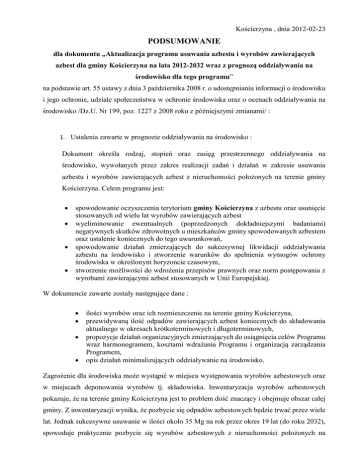Kościerzyna , dnia 2012-02-23 PODSUMOWANIE dla dokumentu „Aktualizacja programu usuwania azbestu i wyrobów zawierających azbest dla gminy Kościerzyna na lata 2012-2032 wraz z prognozą oddziaływania na środowisko dla tego programu” na podstawie art. 55 ustawy z dnia 3 października 2008 r. o udostępnianiu informacji o środowisku i jego ochronie, udziale społeczeństwa w ochronie środowiska oraz o ocenach oddziaływania na środowisko /Dz.U. Nr 199, poz. 1227 z 2008 roku z późniejszymi zmianami/ : 1. Ustalenia zawarte w prognozie oddziaływania na środowisko : Dokument określa rodzaj, stopień oraz zasięg przestrzennego oddziaływania na środowisko, wywołanych przez zakres realizacji zadań i działań w zakresie usuwania azbestu i wyrobów zawierających azbest z nieruchomości położonych na terenie gminy Kościerzyna. Celem programu jest: spowodowanie oczyszczenia terytorium gminy Kościerzyna z azbestu oraz usunięcie stosowanych od wielu lat wyrobów zawierających azbest wyeliminowanie ewentualnych (poprzedzonych dokładniejszymi badaniami) negatywnych skutków zdrowotnych u mieszkańców gminy spowodowanych azbestem oraz ustalenie koniecznych do tego uwarunkowań, spowodowanie działań zmierzających do sukcesywnej likwidacji oddziaływania azbestu na środowisko i stworzenie warunków do spełnienia wymogów ochrony środowiska w określonym horyzoncie czasowym, stworzenie możliwości do wdrożenia przepisów prawnych oraz norm postępowania z wyrobami zawierającymi azbest stosowanych w Unii Europejskiej. W dokumencie zawarte zostały następujące dane : ilości wyrobów oraz ich rozmieszczenie na terenie gminy Kościerzyna, przewidywaną ilość odpadów zawierających azbest koniecznych do składowania aktualnego w okresach krótkoterminowych i długoterminowych, propozycje działań organizacyjnych zmierzających do osiągnięcia celów Programu wraz harmonogramem, kosztami wdrażania Programu i organizacją zarządzania Programem, opis działań minimalizujących oddziaływanie na środowisko. Zagrożenie dla środowiska może wystąpić w miejscu występowania wyrobów azbestowych oraz w miejscach deponowania wyrobów tj. składowiska. Inwentaryzacja wyrobów azbestowych pokazuje, że na terenie gminy Kościerzyna jest to problem dość znaczący i obejmuje obszar całej gminy. Z inwentaryzacji wynika, że pozbycie się odpadów azbestowych będzie trwać przez wiele lat. Jednak sukcesywne usuwanie w ilości około 35 Mg na rok przez okres 19 lat (do roku 2032), spowoduje praktycznie pozbycie się wyrobów azbestowych z nieruchomości położonych na terenie gminy Kościerzyna. Coroczne zutylizowanie około 35 Mg odpadów nie stanowi większego problemu lub zagrożenia. Odpady azbestowe są szczególnie niebezpieczne dla zdrowia ludzi poprzez właściwości rakotwórcze w przypadku wdychania azbestu. Prawidłowa gospodarka odpadami azbestowymi przyczyni się do ograniczenia negatywnego oddziaływania. Zaznaczyć należy, że wyroby zawierające azbest nie są szkodliwe dla środowiska przyrodniczego. Usuwanie azbestu nie ma wpływu na : zasoby przyrodnicze, krajobraz, obszary ochronne, stan czystości wód powierzchniowych i głębinowych, klimat, zasoby naturalne, zabytki, dobra materialne Negatywny wpływ jaki stwierdzono, czyli dla ludzi i powietrza będzie zminimalizowany na skutek realizacji programu poprzez : prawidłowe prowadzenie prac rozbiórkowych, pozbycie się azbestu z nieruchomości, właściwe zagospodarowanie odpadów azbestowych. Realizacja założeń programu wpłynie pozytywnie na środowisko naturalne i nie stwierdza się możliwości zaistnienia skumulowanego oddziaływania. Wszystkie wyprodukowane odpady zostaną przewiezione na składowiska poza obszar gminy Kościerzyna. Z kolei pracy budowlane przy demontażu płyt azbestowych będą prowadzone z zachowaniem wysokich norm ochronnych. Część odpadów azbestowych zinwentaryzowano na obszarach objętych formami ochrony przyrody. 2. Organ uzyskał opinie następujących organów , które zostały uwzględnione: Regionalnego Dyrektora Ochrony Środowiska w Gdańsku RDOŚ-Gd-WOO411.1.2012.MCZ.3. z 16-02-2012 roku (data wpływu 21.02.2012 r.) Pomorskiego Wojewódzkiego Inspektora Sanitarnego w Gdańsku SE-NS- 80.9022.490.23.2012.LK z dnia 6-02-2012 (data wpływu 9-02-20012 r.) 3. nie zgłoszono żadnych uwag i wniosków w ramach postępowania z udziałem społeczeństwa, 4. nie przeprowadzono postepowania transgranicznego gdyż nie stwierdzono takiego oddziaływania; 5. monitoring skutków będzie prowadzony poprzez kontrole nieruchomości na których usunięto wyroby zawierające azbest, dokumentacje związaną z przekazaniem odpadów azbestowych do utylizacji , dokumentację zdjęciową obiektów z których usunięto azbest z wykorzystaniem bazy azbestowej prowadzonej przez Ministerstwo Gospodarki. Częstotliwość monitoringu – roczna inwentaryzacja usuniętych odpadów azbestowych, w której zawarte będą dane tj. aktualna ilość azbestu zinwentaryzowana na nieruchomościach, ilość odpadów przekazanych do unieszkodliwienia w danym roku.
