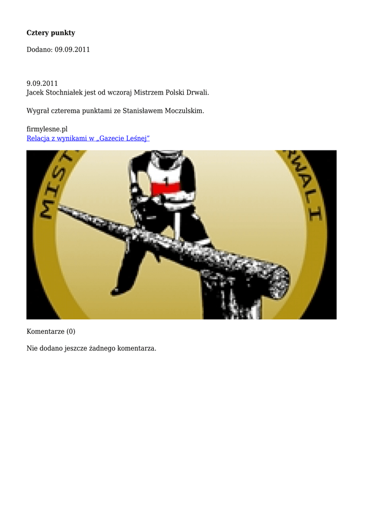Cztery punkty Dodano: 09.09.2011 9.09.2011 Jacek Stochniałek jest od wczoraj Mistrzem Polski Drwali. Wygrał czterema punktami ze Stanisławem Moczulskim. firmylesne.pl Relacja z wynikami w „Gazecie Leśnej” Komentarze (0) Nie dodano jeszcze żadnego komentarza.