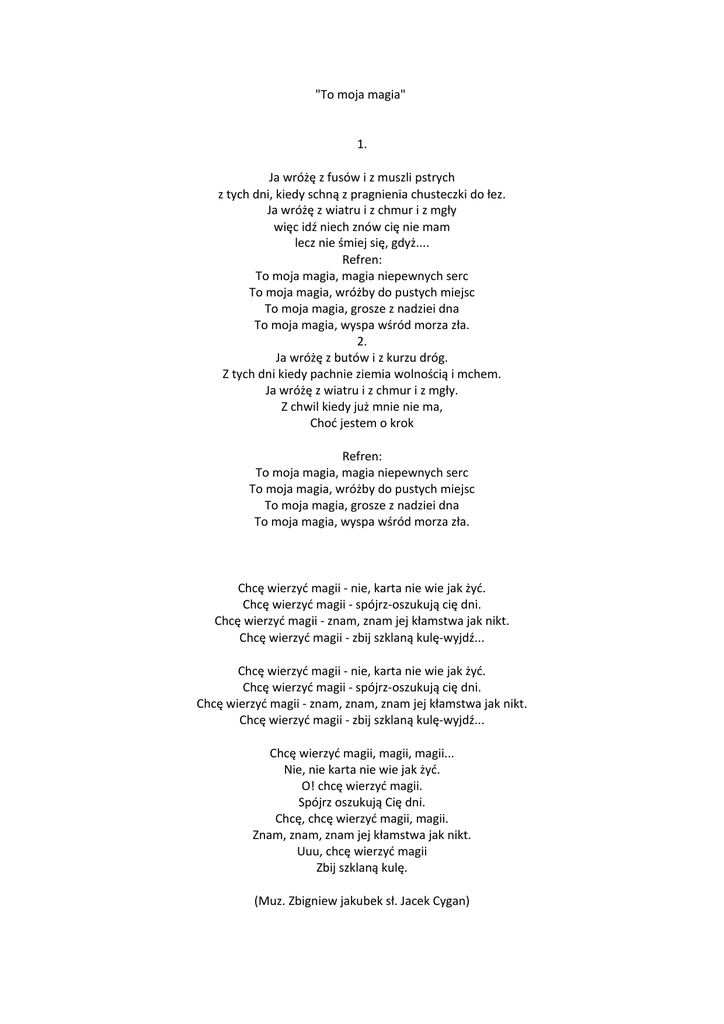 "To moja magia" 1. Ja wróżę z fusów i z muszli pstrych z tych dni, kiedy schną z pragnienia chusteczki do łez. Ja wróżę z wiatru i z chmur i z mgły więc idź niech znów cię nie mam lecz nie śmiej się, gdyż.... Refren: To moja magia, magia niepewnych serc To moja magia, wróżby do pustych miejsc To moja magia, grosze z nadziei dna To moja magia, wyspa wśród morza zła. 2. Ja wróżę z butów i z kurzu dróg. Z tych dni kiedy pachnie ziemia wolnością i mchem. Ja wróżę z wiatru i z chmur i z mgły. Z chwil kiedy już mnie nie ma, Choć jestem o krok Refren: To moja magia, magia niepewnych serc To moja magia, wróżby do pustych miejsc To moja magia, grosze z nadziei dna To moja magia, wyspa wśród morza zła. Chcę wierzyć magii - nie, karta nie wie jak żyć. Chcę wierzyć magii - spójrz-oszukują cię dni. Chcę wierzyć magii - znam, znam jej kłamstwa jak nikt. Chcę wierzyć magii - zbij szklaną kulę-wyjdź... Chcę wierzyć magii - nie, karta nie wie jak żyć. Chcę wierzyć magii - spójrz-oszukują cię dni. Chcę wierzyć magii - znam, znam, znam jej kłamstwa jak nikt. Chcę wierzyć magii - zbij szklaną kulę-wyjdź... Chcę wierzyć magii, magii, magii... Nie, nie karta nie wie jak żyć. O! chcę wierzyć magii. Spójrz oszukują Cię dni. Chcę, chcę wierzyć magii, magii. Znam, znam, znam jej kłamstwa jak nikt. Uuu, chcę wierzyć magii Zbij szklaną kulę. (Muz. Zbigniew jakubek sł. Jacek Cygan)
