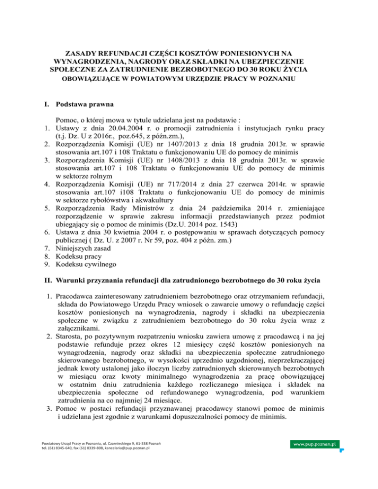 ZASADY REFUNDACJI CZĘŚCI KOSZTÓW PONIESIONYCH NA WYNAGRODZENIA, NAGRODY ORAZ SKŁADKI NA UBEZPIECZENIE SPOŁECZNE ZA ZATRUDNIENIE BEZROBOTNEGO DO 30 ROKU ŻYCIA OBOWIĄZUJĄCE W POWIATOWYM URZĘDZIE PRACY W POZNANIU I. Podstawa prawna 1. 2. 3. 4. 5. 6. 7. 8. 9. Pomoc, o której mowa w tytule udzielana jest na podstawie : Ustawy z dnia 20.04.2004 r. o promocji zatrudnienia i instytucjach rynku pracy (t.j. Dz. U z 2016r., poz.645, z późn.zm.), Rozporządzenia Komisji (UE) nr 1407/2013 z dnia 18 grudnia 2013r. w sprawie stosowania art.107 i 108 Traktatu o funkcjonowaniu UE do pomocy de minimis Rozporządzenia Komisji (UE) nr 1408/2013 z dnia 18 grudnia 2013r. w sprawie stosowania art.107 i 108 Traktatu o funkcjonowaniu UE do pomocy de minimis w sektorze rolnym Rozporządzenia Komisji (UE) nr 717/2014 z dnia 27 czerwca 2014r. w sprawie stosowania art.107 i108 Traktatu o funkcjonowaniu UE do pomocy de minimis w sektorze rybołówstwa i akwakultury Rozporządzenia Rady Ministrów z dnia 24 października 2014 r. zmieniające rozporządzenie w sprawie zakresu informacji przedstawianych przez podmiot ubiegający się o pomoc de minimis (Dz.U. 2014 poz. 1543) Ustawa z dnia 30 kwietnia 2004 r. o postępowaniu w sprawach dotyczących pomocy publicznej ( Dz. U. z 2007 r. Nr 59, poz. 404 z późn. zm.) Niniejszych zasad Kodeksu pracy Kodeksu cywilnego II. Warunki przyznania refundacji dla zatrudnionego bezrobotnego do 30 roku życia 1. Pracodawca zainteresowany zatrudnieniem bezrobotnego oraz otrzymaniem refundacji, składa do Powiatowego Urzędu Pracy wniosek o zawarcie umowy o refundację części kosztów poniesionych na wynagrodzenia, nagrody i składki na ubezpieczenia społeczne w związku z zatrudnieniem bezrobotnego do 30 roku życia wraz z załącznikami. 2. Starosta, po pozytywnym rozpatrzeniu wniosku zawiera umowę z pracodawcą i na jej podstawie refunduje przez okres 12 miesięcy część kosztów poniesionych na wynagrodzenia, nagrody oraz składki na ubezpieczenia społeczne zatrudnionego skierowanego bezrobotnego, w wysokości uprzednio uzgodnionej, nieprzekraczającej jednak kwoty ustalonej jako iloczyn liczby zatrudnionych skierowanych bezrobotnych w miesiącu oraz kwoty minimalnego wynagrodzenia za pracę obowiązującej w ostatnim dniu zatrudnienia każdego rozliczanego miesiąca i składek na ubezpieczenia społeczne od refundowanego wynagrodzenia, pod warunkiem zatrudnienia na co najmniej 24 miesiące. 3. Pomoc w postaci refundacji przyznawanej pracodawcy stanowi pomoc de minimis i udzielana jest zgodnie z warunkami dopuszczalności pomocy de minimis. Powiatowy Urząd Pracy w Poznaniu, ul. Czarnieckiego 9, 61-538 Poznań tel. (61) 8345-640, fax (61) 8339-808, [email protected] 4. Refundacja nie zostanie przyznana za zatrudnienie bezrobotnego, który w okresie 6 miesięcy przed dniem rejestracji w Powiatowym Urzędzie Pracy był zatrudniony lub wykonywał inną pracę zarobkową lub odbywał staż bądź przygotowanie zawodowe dorosłych u wnioskującego pracodawcy. 5. Wniosek o zawarcie umowy o refundację części kosztów wynagrodzenia i składek za zatrudnienie bezrobotnego do 30 roku życia może być uwzględniony w przypadku, gdy wnioskodawcą jest: 1) podmiot prowadzący działalność gospodarczą w rozumieniu przepisów ustawy z dnia 2 lipca 2004r. o swobodzie działalności gospodarczej (Dz. U. z 2016r., poz.2255) przez okres co najmniej 6 miesięcy bezpośrednio poprzedzających dzień złożenia wniosku, przy czym do wskazanego okresu prowadzenia działalności gospodarczej nie wlicza się okresu jej zawieszenia 2) przedszkole lub szkoła – prowadzące działalność na podstawie ustawy z dnia 7 września 1991 r. o systemie oświaty (Dz. U. z 2004 r. Nr 256, poz. 2572, z późn. zm) przez okres co najmniej 6 miesięcy bezpośrednio poprzedzających dzień złożenia wniosku 3) producent rolny – posiadający gospodarstwo rolne w rozumieniu przepisów ustawy z dnia 15 listopada1984r. o podatku rolnym (Dz.U. z 2016 r., poz. 1579) lub prowadzący dział specjalny produkcji rolnej w rozumieniu przepisów ustawy z dnia 26 lipca 1991 r. o podatku dochodowym od osób fizycznych (Dz.U. z 2016 r., poz. 2048) oraz przepisów ustawy z dnia 15 lutego 1992 r. o podatku dochodowym od osób prawnych (Dz.U. z 2016 r., poz. 1933), przez okres co najmniej 6 miesięcy bezpośrednio poprzedzających dzień złożenia wniosku 6. Wniosek o zawarcie umowy o refundację części kosztów wynagrodzenia i składek na ubezpieczenia za zatrudnienie bezrobotnego do 30 roku życia może być uwzględniony w przypadku, gdy wnioskodawca: 1) nie zalega w dniu złożenia wniosku z wypłacaniem wynagrodzeń pracownikom oraz opłacaniem należnych składek na ubezpieczenia społeczne, ubezpieczenia zdrowotne, Fundusz Pracy, Fundusz Gwarantowanych Świadczeń Pracowniczych oraz Fundusz Emerytur Pomostowych, 2) w okresie 6 miesięcy przed złożeniem wniosku nie zmniejszył zatrudnienia z przyczyn zakładu pracy, 3) nie zalega w dniu złożenia wniosku z opłacaniem innych danin publicznych, 4) nie posiada w dniu złożenia wniosku nieuregulowanych w terminie zobowiązań cywilnoprawnych, 5) nie był karany w okresie 2 lat przed dniem złożenia wniosku za przestępstwo przeciwko obrotowi gospodarczemu, w rozumieniu ustawy z dnia 6 czerwca 1997 r. – Kodeks karny (tj. Dz. U. z 2016 r., poz.1137) lub ustawy z dnia 28 października 2002 r. o odpowiedzialności podmiotów zbiorowych za czyny zabronione pod groźbą kary (t. j. Dz. U. z 2016 r., poz. 1541), 6) złożył wniosek kompletny i prawidłowo sporządzony, łącznie z dokumentami niezbędnymi do jego oceny, 7. Zawarcie umowy o refundację części kosztów poniesionych na wynagrodzenia, nagrody oraz składki na ubezpieczenia społeczne za zatrudnienie bezrobotnego do 30 roku życia, oznacza zgodę Pracodawcy na podanie do publicznej wiadomości tego faktu, zgodnie z art. 59b ustawy. Powiatowy Urząd Pracy w Poznaniu, ul. Czarnieckiego 9, 61-