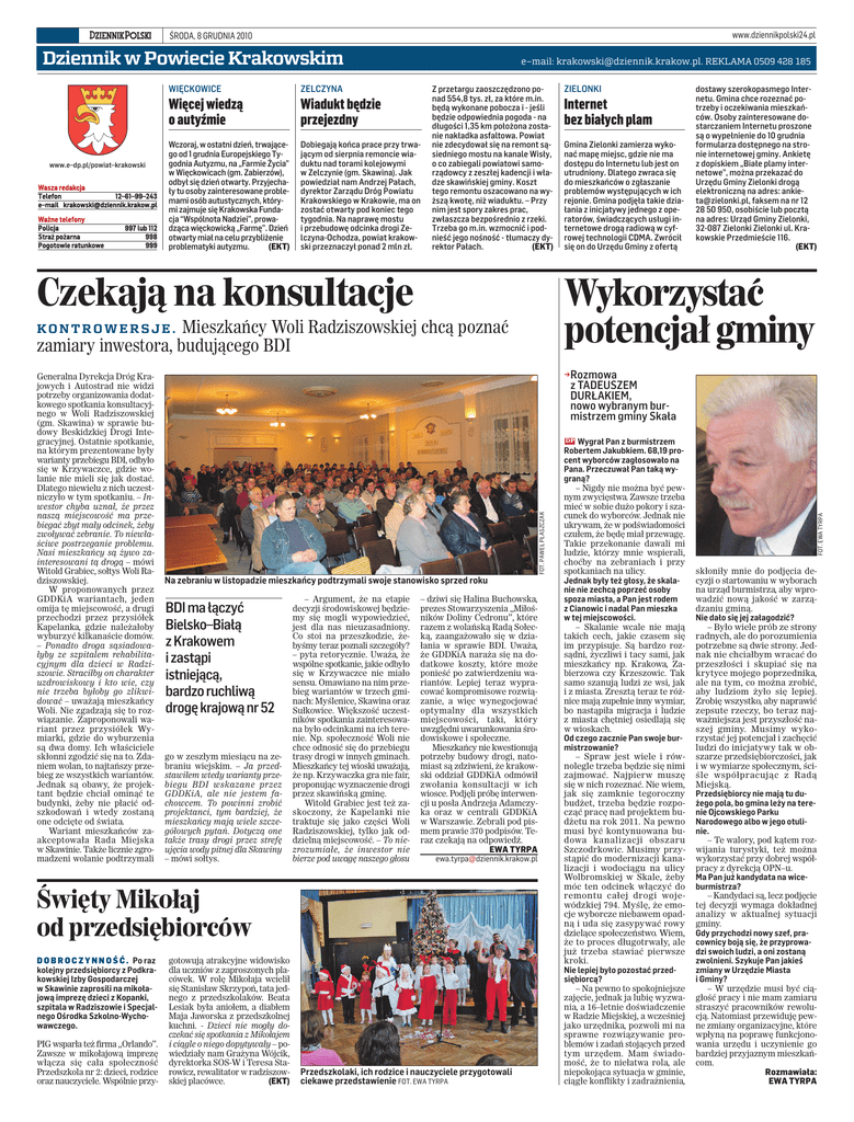 www.dziennikpolski24.pl ŚRODA, 8 GRUDNIA 2010 Dziennik w Powiecie Krakowskim Wasza redakcja Telefon 12–61–99–243 e–mail [email protected] Ważne telefony Policja Straż pożarna Pogotowie ratunkowe 997 lub 112 998 999 WIĘCKOWICE ZELCZYNA Więcej wiedzą o autyźmie Wiadukt będzie przejezdny Wczoraj, w ostatni dzień, trwającego od 1 grudnia Europejskiego Tygodnia Autyzmu, na „Farmie Życia” w Więckowicach (gm. Zabierzów), odbył się dzień otwarty. Przyjechały tu osoby zainteresowane problemami osób autustycznych, którymi zajmuje się Krakowska Fundacja “Wspólnota Nadziei”, prowadząca więckowicką „Farmę”. Dzień otwarty miał na celu przybliżenie problematyki autyzmu. (EKT) Dobiegają końca prace przy trwającym od sierpnia remoncie wiaduktu nad torami kolejowymi w Zelczynie (gm. Skawina). Jak powiedział nam Andrzej Pałach, dyrektor Zarządu Dróg Powiatu Krakowskiego w Krakowie, ma on zostać otwarty pod koniec tego tygodnia. Na naprawę mostu i przebudowę odcinka drogi Zelczyna-Ochodza, powiat krakowski przeznaczył ponad 2 mln zł. Z przetargu zaoszczędzono ponad 554,8 tys. zł, za które m.in. będą wykonane pobocza i - jeśli będzie odpowiednia pogoda - na długości 1,35 km położona zostanie nakładka asfaltowa. Powiat nie zdecydował się na remont sąsiedniego mostu na kanale Wisły, o co zabiegali powiatowi samorządowcy z zeszłej kadencji i władze skawińskiej gminy. Koszt tego remontu oszacowano na wyższą kwotę, niż wiaduktu. – Przy nim jest spory zakres prac, zwłaszcza bezpośrednio z rzeki. Trzeba go m.in. wzmocnić i podnieść jego nośność - tłumaczy dyrektor Pałach. (EKT) Czekają na konsultacje Mieszkańcy Woli Radziszowskiej chcą poznać zamiary inwestora, budującego BDI PIG wsparła też firma „Orlando”. Zawsze w mikołajową imprezę włącza się cała społeczność Przedszkola nr 2: dzieci, rodzice oraz nauczyciele. Wspólnie przy- Gmina Zielonki zamierza wykonać mapę miejsc, gdzie nie ma dostępu do Internetu lub jest on utrudniony. Dlatego zwraca się do mieszkańców o zgłaszanie problemów występujących w ich rejonie. Gmina podjęła takie działania z inicjatywy jednego z operatorów, świadczących usługi internetowe drogą radiową w cyfrowej technologii CDMA. Zwrócił się on do Urzędu Gminy z ofertą FOT. PAWEŁ PŁASZCZAK →Rozmowa z TADEUSZEM DURŁAKIEM, nowo wybranym burmistrzem gminy Skała Na zebraniu w listopadzie mieszkańcy podtrzymali swoje stanowisko sprzed roku BDI ma łączyć Bielsko–Białą z Krakowem i zastąpi istniejącą, bardzo ruchliwą drogę krajową nr 52 go w zeszłym miesiącu na zebraniu wiejskim. – Ja przedstawiłem wtedy warianty przebiegu BDI wskazane przez GDDKiA, ale nie jestem fachowcem. To powinni zrobić projektanci, tym bardziej, że mieszkańcy mają wiele szczegółowych pytań. Dotyczą one także trasy drogi przez strefę ujęcia wody pitnej dla Skawiny – mówi sołtys. – Argument, że na etapie decyzji środowiskowej będziemy się mogli wypowiedzieć, jest dla nas nieuzasadniony. Co stoi na przeszkodzie, żebyśmy teraz poznali szczegóły? – pyta retorycznie. Uważa, że wspólne spotkanie, jakie odbyło się w Krzywaczce nie miało sensu. Omawiano na nim przebieg wariantów w trzech gminach: Myślenice, Skawina oraz Sułkowice. Większość uczestników spotkania zainteresowana było odcinkami na ich terenie. Np. społeczność Woli nie chce odnosić się do przebiegu trasy drogi w innych gminach. Mieszkańcy tej wioski uważają, że np. Krzywaczka gra nie fair, proponując wyznaczenie drogi przez skawińską gminę. Witold Grabiec jest też zaskoczony, że Kapelanki nie traktuje się jako części Woli Radziszowskiej, tylko jak oddzielną miejscowość. – To niezrozumiałe, że inwestor nie bierze pod uwagę naszego głosu – dziwi się Halina Buchowska, prezes Stowarzyszenia „Miłośników Doliny Cedronu”, które razem z wolańską Radą Sołecką, zaangażowało się w działania w sprawie BDI. Uważa, że GDDKiA naraża się na dodatkowe koszty, które może ponieść po zatwierdzeniu wariantów. Lepiej teraz wypracować kompromisowe rozwiązanie, a więc wynegocjować optymalny dla wszystkich miejscowości, taki, który uwzględni uwarunkowania środowiskowe i społeczne. Mieszkańcy nie kwestionują potrzeby budowy drogi, natomiast są zdziwieni, że krakowski oddział GDDKiA odmówił zwołania konsultacji w ich wiosce. Podjęli próbę interwencji u posła Andrzeja Adamczyka oraz w centrali GDDKiA w Warszawie. Zebrali pod pismem prawie 370 podpisów. Teraz czekają na odpowiedź. EWA TYRPA [email protected] Święty Mikołaj od przedsiębiorców D O B R O C Z Y N N O Ś Ć . Po raz kolejny przedsiębiorcy z Podkrakowskiej Izby Gospodarczej w Skawinie zaprosili na mikołajową imprezę dzieci z Kopanki, szpitala w Radziszowie i Specjalnego Ośrodka Szkolno-Wychowawczego. Internet bez białych plam dostawy szerokopasmego Internetu. Gmina chce rozeznać potrzeby i oczekiwania mieszkańców. Osoby zainteresowane dostarczaniem Internetu proszone są o wypełnienie do 10 grudnia formularza dostępnego na stronie internetowej gminy. Ankietę z dopiskiem „Białe plamy internetowe”, można przekazać do Urzędu Gminy Zielonki drogą elektroniczną na adres: [email protected], faksem na nr 12 28 50 950, osobiście lub pocztą na adres: Urząd Gminy Zielonki, 32-087 Zielonki Zielonki ul. Krakowskie Przedmieście 116. (EKT) Wykorzystać potencjał gminy KONTROWERSJE. Generalna Dyrekcja Dróg Krajowych i Autostrad nie widzi potrzeby organizowania dodatkowego spotkania konsultacyjnego w Woli Radziszowskiej (gm. Skawina) w sprawie budowy Beskidzkiej Drogi Integracyjnej. Ostatnie spotkanie, na którym prezentowane były warianty przebiegu BDI, odbyło się w Krzywaczce, gdzie wolanie nie mieli się jak dostać. Dlatego niewielu z nich uczestniczyło w tym spotkaniu. – Inwestor chyba uznał, że przez naszą miejscowość ma p