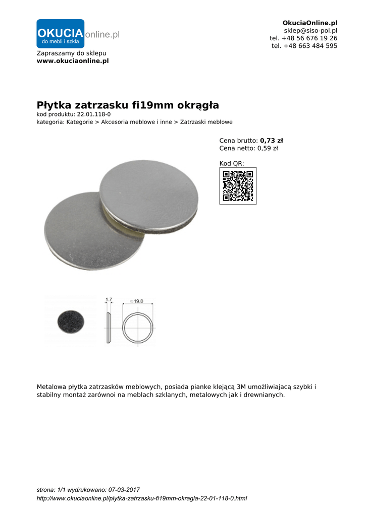OkuciaOnline.pl [email protected] tel. +48 56 676 19 26 tel. +48 663 484 595 Zapraszamy do sklepu www.okuciaonline.pl Płytka zatrzasku fi19mm okrągła kod produktu: 22.01.118-0 kategoria: Kategorie > Akcesoria meblowe i inne > Zatrzaski meblowe Cena brutto: 0,73 zł Cena netto: 0,59 zł Kod QR: Metalowa płytka zatrzasków meblowych, posiada pianke klejącą 3M umożliwiajacą szybki i stabilny montaż zarównoi na meblach szklanych, metalowych jak i drewnianych. strona: 1/1 wydrukowano: 07-03-2017 http://www.okuciaonline.pl/plytka-zatrzasku-fi19mm-okragla-22-01-118-0.html