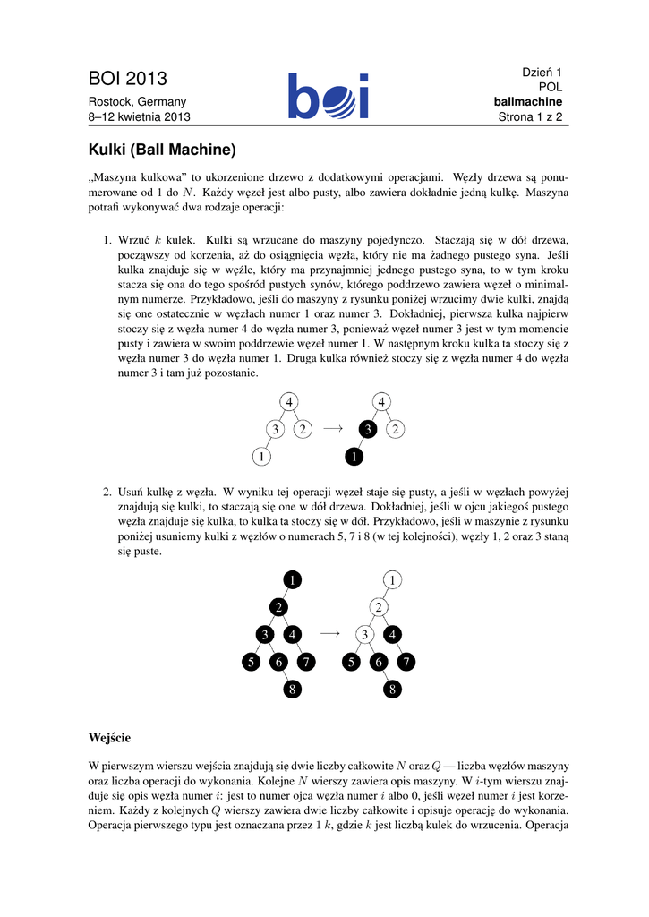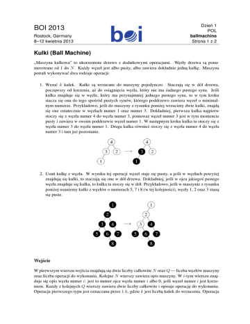 BOI 2013 Rostock, Germany 8–12 kwietnia 2013 b i Dzień 1 POL ballmachine Strona 1 z 2 Kulki (Ball Machine) „Maszyna kulkowa” to ukorzenione drzewo z dodatkowymi operacjami. W˛ezły drzewa sa˛ ponumerowane od 1 do N . Każdy w˛ezeł jest albo pusty, albo zawiera dokładnie jedna˛ kulk˛e. Maszyna potrafi wykonywać dwa rodzaje operacji: 1. Wrzuć k kulek. Kulki sa˛ wrzucane do maszyny pojedynczo. Staczaja˛ si˛e w dół drzewa, poczawszy ˛ od korzenia, aż do osiagni˛ ˛ ecia w˛ezła, który nie ma żadnego pustego syna. Jeśli kulka znajduje si˛e w w˛eźle, który ma przynajmniej jednego pustego syna, to w tym kroku stacza si˛e ona do tego spośród pustych synów, którego poddrzewo zawiera w˛ezeł o minimalnym numerze. Przykładowo, jeśli do maszyny z rysunku poniżej wrzucimy dwie kulki, znajda˛ si˛e one ostatecznie w w˛ezłach numer 1 oraz numer 3. Dokładniej, pierwsza kulka najpierw stoczy si˛e z w˛ezła numer 4 do w˛ezła numer 3, ponieważ w˛ezeł numer 3 jest w tym momencie pusty i zawiera w swoim poddrzewie w˛ezeł numer 1. W nast˛epnym kroku kulka ta stoczy si˛e z w˛ezła numer 3 do w˛ezła numer 1. Druga kulka również stoczy si˛e z w˛ezła numer 4 do w˛ezła numer 3 i tam już pozostanie. 2. Usuń kulk˛e z w˛ezła. W wyniku tej operacji w˛ezeł staje si˛e pusty, a jeśli w w˛ezłach powyżej znajduja˛ si˛e kulki, to staczaja˛ si˛e one w dół drzewa. Dokładniej, jeśli w ojcu jakiegoś pustego w˛ezła znajduje si˛e kulka, to kulka ta stoczy si˛e w dół. Przykładowo, jeśli w maszynie z rysunku poniżej usuniemy kulki z w˛ezłów o numerach 5, 7 i 8 (w tej kolejności), w˛ezły 1, 2 oraz 3 stana˛ si˛e puste. Wejście W pierwszym wierszu wejścia znajduja˛ si˛e dwie liczby całkowite N oraz Q — liczba w˛ezłów maszyny oraz liczba operacji do wykonania. Kolejne N wierszy zawiera opis maszyny. W i-tym wierszu znajduje si˛e opis w˛ezła numer i: jest to numer ojca w˛ezła numer i albo 0, jeśli w˛ezeł numer i jest korzeniem. Każdy z kolejnych Q wierszy zawiera dwie liczby całkowite i opisuje operacj˛e do wykonania. Operacja pierwszego typu jest oznaczana przez 1 k, gdzie k jest liczba˛ kulek do wrzucenia. Operacja b i BOI 2013 Rostock, Germany 8–12 kwietnia 2013 Dzień 1 POL ballmachine Strona 2 z 2 drugiego typu jest oznaczana przez 2 x, gdzie x to numer w˛ezła, z którego usuwamy kulk˛e. Możesz założyć, że wszystkie operacje sa˛ poprawne, tzn. że nigdy nie wrzucamy wi˛ecej kulek niż jest pustych w˛ezłów oraz nigdy nie usuwamy kulki z pustego w˛ezła. Wyjście Dla każdej operacji pierwszego typu wypisz numer w˛ezła, w którym zatrzymała si˛e ostatnia wrzucona kulka. Dla operacji drugiego typu wypisz liczb˛e kulek, które spadły po jej wykonaniu. Ograniczenia Zachodzi N, Q ≤ 100 000. W testach wartych 25 punktów każdy w˛ezeł ma zero lub dwóch synów. Co wi˛ecej, wszystkie w˛ezły nieposiadajace ˛ synów znajduja˛ si˛e w tej samej odległości od korzenia. W testach wartych 30 punktów operacje b˛eda˛ wykonywane w taki sposób, że żadna kulka nie stoczy si˛e wskutek wykonania operacji drugiego typu. W testach wartych 40 punktów wykonywana jest tylko jedna operacja pierwszego typu. Jest to zarazem pierwsza wykonywana operacja. Te trzy grupy testów sa˛ parami rozłaczne. ˛ Przykład Wejście Wyjście 8 0 1 2 2 3 3 4 6 1 2 2 2 1 3 2 2 4 8 5 7 8 Ograniczenia Limit czasu: 1 sek na test Limit pami˛eci: 128 MB na test