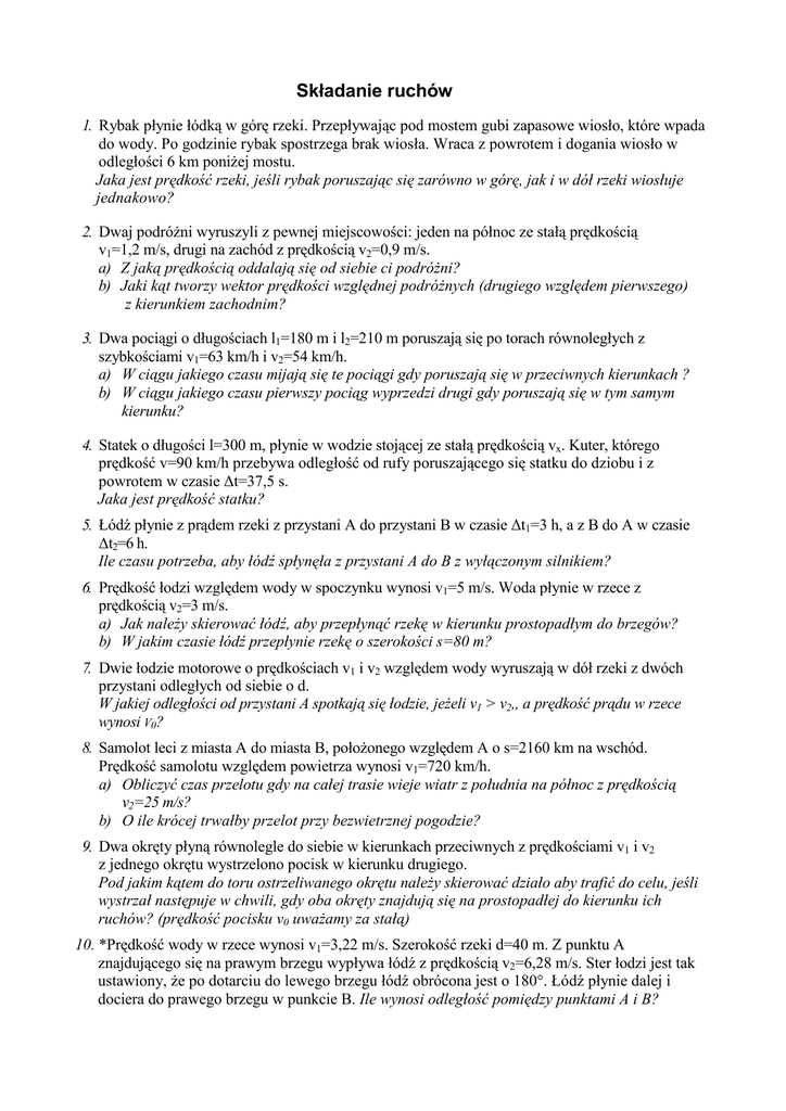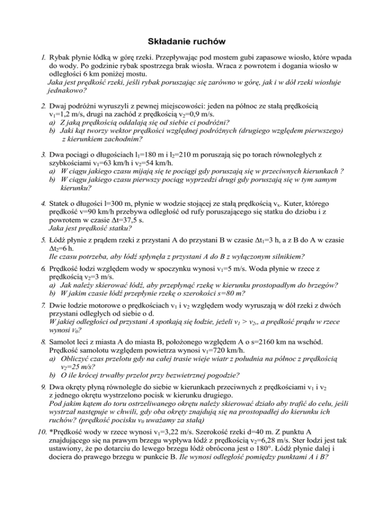 Składanie ruchów 1. Rybak płynie łódką w górę rzeki. Przepływając pod mostem gubi zapasowe wiosło, które wpada do wody. Po godzinie rybak spostrzega brak wiosła. Wraca z powrotem i dogania wiosło w odległości 6 km poniżej mostu. Jaka jest prędkość rzeki, jeśli rybak poruszając się zarówno w górę, jak i w dół rzeki wiosłuje jednakowo? 2. Dwaj podróżni wyruszyli z pewnej miejscowości: jeden na północ ze stałą prędkością v1=1,2 m/s, drugi na zachód z prędkością v2=0,9 m/s. a) Z jaką prędkością oddalają się od siebie ci podróżni? b) Jaki kąt tworzy wektor prędkości względnej podróżnych (drugiego względem pierwszego) z kierunkiem zachodnim? 3. Dwa pociągi o długościach l1=180 m i l2=210 m poruszają się po torach równoległych z szybkościami v1=63 km/h i v2=54 km/h. a) W ciągu jakiego czasu mijają się te pociągi gdy poruszają się w przeciwnych kierunkach ? b) W ciągu jakiego czasu pierwszy pociąg wyprzedzi drugi gdy poruszają się w tym samym kierunku? 4. Statek o długości l=300 m, płynie w wodzie stojącej ze stałą prędkością vx. Kuter, którego prędkość v=90 km/h przebywa odległość od rufy poruszającego się statku do dziobu i z powrotem w czasie ∆t=37,5 s. Jaka jest prędkość statku? 5. Łódź płynie z prądem rzeki z przystani A do przystani B w czasie ∆t1=3 h, a z B do A w czasie ∆t2=6 h. Ile czasu potrzeba, aby łódź spłynęła z przystani A do B z wyłączonym silnikiem? 6. Prędkość łodzi względem wody w spoczynku wynosi v1=5 m/s. Woda płynie w rzece z prędkością v2=3 m/s. a) Jak należy skierować łódź, aby przepłynąć rzekę w kierunku prostopadłym do brzegów? b) W jakim czasie łódź przepłynie rzekę o szerokości s=80 m? 7. Dwie łodzie motorowe o prędkościach v1 i v2 względem wody wyruszają w dół rzeki z dwóch przystani odległych od siebie o d. W jakiej odległości od przystani A spotkają się łodzie, jeżeli v1 > v2,, a prędkość prądu w rzece wynosi V0? 8. Samolot leci z miasta A do miasta B, położonego względem A o s=2160 km na wschód. Prędkość samolotu względem powietrza wynosi v1=720 km/h. a) Obliczyć czas przelotu gdy na całej trasie wieje wiatr z południa na północ z prędkością v2=25 m/s? b) O ile krócej trwałby przelot przy bezwietrznej pogodzie? 9. Dwa okręty płyną równolegle do siebie w kierunkach przeciwnych z prędkościami v1 i v2 z jednego okrętu wystrzelono pocisk w kierunku drugiego. Pod jakim kątem do toru ostrzeliwanego okrętu należy skierować działo aby trafić do celu, jeśli wystrzał następuje w chwili, gdy oba okręty znajdują się na prostopadłej do kierunku ich ruchów? (prędkość pocisku v0 uważamy za stałą) 10. *Prędkość wody w rzece wynosi v1=3,22 m/s. Szerokość rzeki d=40 m. Z punktu A znajdującego się na prawym brzegu wypływa łódź z prędkością v2=6,28 m/s. Ster łodzi jest tak ustawiony, że po dotarciu do lewego brzegu łódź obrócona jest o 180°. Łódź płynie dalej i dociera do prawego brzegu w punkcie B. Ile wynosi odległość pomiędzy punktami A i B?