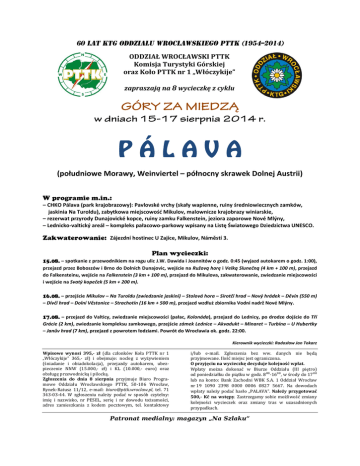 ODDZIAŁ WROCŁAWSKI PTTK Komisja Turystyki Górskiej oraz Koło PTTK nr 1 „Włóczykije” zapraszają na 8 wycieczkę z cyklu (południowe Morawy, Weinviertel – północny skrawek Dolnej Austrii) – CHKO Pálava (park krajobrazowy): Pavlovské vrchy (skały wapienne, ruiny średniowiecznych zamków, jaskinia Na Turoldu), zabytkowa miejscowość Mikulov, malownicze krajobrazy winiarskie, – rezerwat przyrody Dunajovické kopce, ruiny zamku Falkenstein, jeziora zaporowe Nové Mlýny, – Lednicko-valtický areál – kompleks pałacowo-parkowy wpisany na Listę Światowego Dziedzictwa UNESCO. Zájezdní hostinec U Zajíce, Mikulov, Náměstí 3. – spotkanie z przewodnikiem na rogu ulic J.W. Dawida i Joannitów o godz. 0:45 (wyjazd autokarem o godz. 1:00), przejazd przez Boboszów i Brno do Dolních Dunajovic, wejście na Ružovą horę i Velką Slunečną (4 km + 100 m), przejazd do Falkensteinu, wejście na Falkenstein (3 km + 100 m), przejazd do Mikulova, zakwaterowanie, zwiedzanie miejscowości i wejście na Svatý kopeček (5 km + 200 m). – przejście Mikulov – Na Turoldu (zwiedzanie jaskini) – Stolová hora – Sirotčí hrad – Nový hrádek – Děvín (550 m) – Dívčí hrad – Dolní Věstonice – Strachotín (16 km + 500 m), przejazd wzdłuż zbiornika Vodní nadrž Nové Mlýny. – przejazd do Valticy, zwiedzanie miejscowości (pałac, Kolonáda), przejazd do Lednicy, po drodze dojście do Tří Grácie (2 km), zwiedzanie kompleksu zamkowego, przejście zámek Lednice – Akvadukt – Minaret – Turbína – U Hubertky – Janův hrad (7 km), przejazd z powrotem łodziami. Powrót do Wrocławia ok. godz. 22:00. Kierownik wycieczki: Radosław Jan Tokarz Wpisowe wynosi 395,- zł (dla członków Koła PTTK nr 1 „Włóczykije” 365,- zł) i obejmuje: nocleg z wyżywieniem (śniadanie i obiadokolacja), przejazdy autokarem, ubezpieczenie NNW (15.000,- zł) i KL (10.000,- euro) oraz obsługę przewodnicką i pilocką. Zgłoszenia do dnia 8 sierpnia przyjmuje Biuro Programowe Oddziału Wrocławskiego PTTK, 50-106 Wrocław, Rynek-Ratusz 11/12, e-mail: [email protected], tel. 71 343-03-44. W zgłoszeniu należy podać w sposób czytelny: imię i nazwisko, nr PESEL, serię i nr dowodu tożsamości, adres zamieszkania z kodem pocztowym, tel. kontaktowy i/lub e-mail. Zgłoszenia bez ww. danych nie będą przyjmowane. Ilość miejsc jest ograniczona. O przyjęciu na wycieczkę decyduje kolejność wpłat. Wpłaty można dokonać w Biurze Oddziału (III piętro) od poniedziałku do piątku w godz. 8⁰⁰-16⁰⁰, w środy do 17⁰⁰ lub na konto: Bank Zachodni WBK S.A. 1 Oddział Wrocław nr 19 1090 2398 0000 0006 0827 5667. Na dowodach wpłaty należy podać hasło „PALAVA”. Należy przygotować 500,- Kč na wstępy. Zastrzegamy sobie możliwość zmiany kolejności wycieczek oraz zmiany tras w uzasadnionych przypadkach. Patronat medialny: magazyn „Na Szlaku”