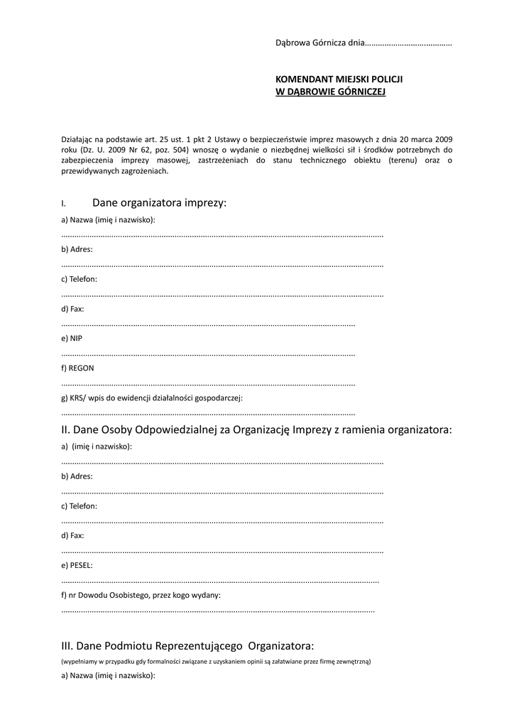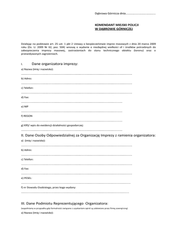 Dąbrowa Górnicza dnia……………………….………… KOMENDANT MIEJSKI POLICJI W DĄBROWIE GÓRNICZEJ Działając na podstawie art. 25 ust. 1 pkt 2 Ustawy o bezpieczeństwie imprez masowych z dnia 20 marca 2009 roku (Dz. U. 2009 Nr 62, poz. 504) wnoszę o wydanie o niezbędnej wielkości sił i środków potrzebnych do zabezpieczenia imprezy masowej, zastrzeżeniach do stanu technicznego obiektu (terenu) oraz o przewidywanych zagrożeniach. I. Dane organizatora imprezy: a) Nazwa (imię i nazwisko): .................................................................................................................................................... b) Adres: .................................................................................................................................................... c) Telefon: .................................................................................................................................................... d) Fax: ....................................................................................................................................... e) NIP ....................................................................................................................................... f) REGON ....................................................................................................................................... g) KRS/ wpis do ewidencji działalności gospodarczej: ....................................................................................................................................... II. Dane Osoby Odpowiedzialnej za Organizację Imprezy z ramienia organizatora: a) (imię i nazwisko): .................................................................................................................................................... b) Adres: .................................................................................................................................................... c) Telefon: .................................................................................................................................................... d) Fax: .................................................................................................................................................... e) PESEL: .................................................................................................................................................. f) nr Dowodu Osobistego, przez kogo wydany: ................................................................................................................................................ III. Dane Podmiotu Reprezentującego Organizatora: (wypełniamy w przypadku gdy formalności związane z uzyskaniem opinii są załatwiane przez firmę zewnętrzną) a) Nazwa (imię i nazwisko): .................................................................................................................................................... b) Adres: .................................................................................................................................................... c) Telefon: .................................................................................................................................................... d) Fax: ....................................................................................................................................... e) PESEL: ....................................................................................................................................... f) nr Dowodu Osobistego, przez kogo wydany: ....................................................................................................................................... g) NIP: ....................................................................................................................................... h) REGON: ....................................................................................................................................... i) Upoważnienie określające zakres reprezentowania organizatora imprezy: załącznik nr ........... IV. Informacje o imprezie masowej: a) pełna nazwa imprezy: .................................................................................................................................................... b) impreza 1. jednorazowa * 2. imprezy dla których opracowano terminarz * 3. cykl imprez w okresie jednego roku * * niepotrzebne skreślić c) Rodzaj imprezy 1. sportowa 2. artystyczna 3. rozrywkowa * niepotrzebne skreślić d) charakterystyka imprezy ( koncert, turniej tańca itp.): .................................................................................................................................................... .................................................................................................................................................... e) termin imprezy: od dnia do dnia .......................................................................... f) czas trwania imprezy: od godziny do godziny ............................................................... g) liczbie miejsc udostępnionych dla osób na imprezie masowej, .............................................................. h) informacja o odpłatności za wstęp na imprezę: ............................................................................................................................................................................ i) informacja o działalności dodatkowej (handlowej, usługowej, gastronomicznej w tym sprzedaży alkoholu): ............................................................................................................................................................................ V. Dodatkowe informacje o służbie informacyjnej i porządkowej organizatora imprezy masowej oraz zabezpieczeniu medycznym: a) Służby inf