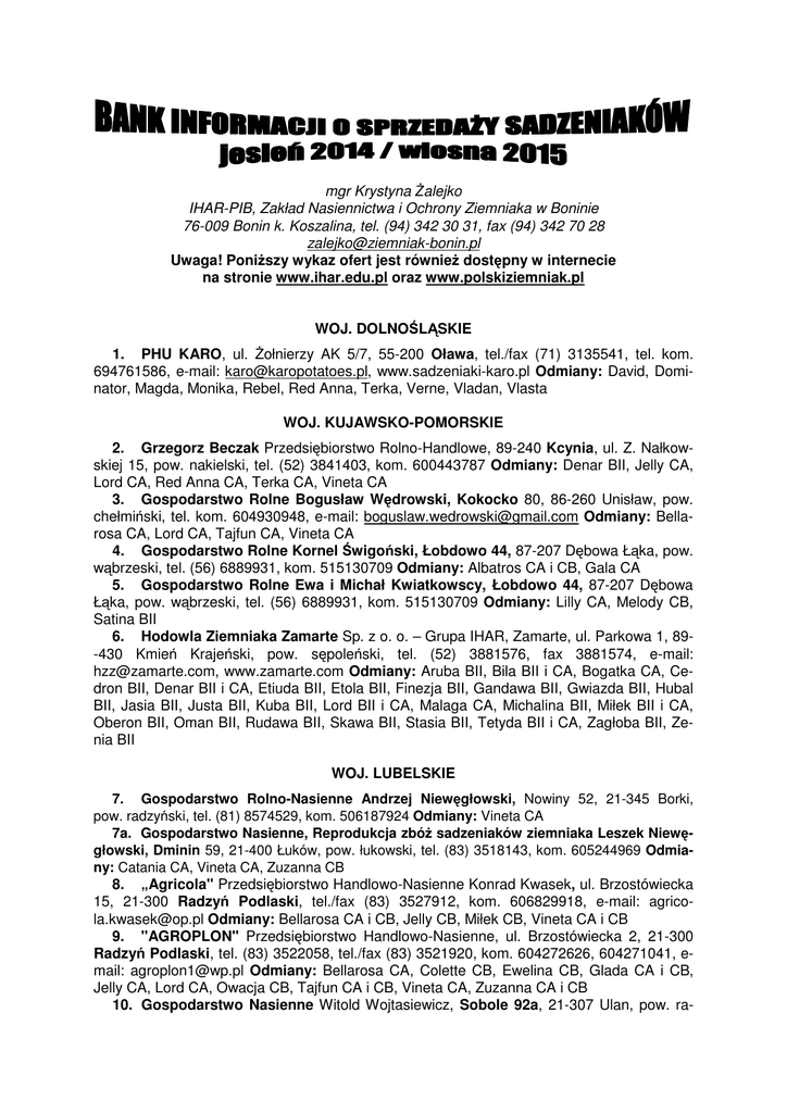 mgr Krystyna Żalejko IHAR-PIB, Zakład Nasiennictwa i Ochrony Ziemniaka w Boninie 76-009 Bonin k. Koszalina, tel. (94) 342 30 31, fax (94) 342 70 28 [email protected] Uwaga! Poniższy wykaz ofert jest również dostępny w internecie na stronie www.ihar.edu.pl oraz www.polskiziemniak.pl WOJ. DOLNOŚLĄSKIE 1. PHU KARO, ul. Żołnierzy AK 5/7, 55-200 Oława, tel./fax (71) 3135541, tel. kom. 694761586, e-mail: [email protected], www.sadzeniaki-karo.pl Odmiany: David, Dominator, Magda, Monika, Rebel, Red Anna, Terka, Verne, Vladan, Vlasta WOJ. KUJAWSKO-POMORSKIE 2. Grzegorz Beczak Przedsiębiorstwo Rolno-Handlowe, 89-240 Kcynia, ul. Z. Nałkowskiej 15, pow. nakielski, tel. (52) 3841403, kom. 600443787 Odmiany: Denar BII, Jelly CA, Lord CA, Red Anna CA, Terka CA, Vineta CA 3. Gospodarstwo Rolne Bogusław Wędrowski, Kokocko 80, 86-260 Unisław, pow. chełmiński, tel. kom. 604930948, e-mail: [email protected] Odmiany: Bellarosa CA, Lord CA, Tajfun CA, Vineta CA 4. Gospodarstwo Rolne Kornel Świgoński, Łobdowo 44, 87-207 Dębowa Łąka, pow. wąbrzeski, tel. (56) 6889931, kom. 515130709 Odmiany: Albatros CA i CB, Gala CA 5. Gospodarstwo Rolne Ewa i Michał Kwiatkowscy, Łobdowo 44, 87-207 Dębowa Łąka, pow. wąbrzeski, tel. (56) 6889931, kom. 515130709 Odmiany: Lilly CA, Melody CB, Satina BII 6. Hodowla Ziemniaka Zamarte Sp. z o. o. – Grupa IHAR, Zamarte, ul. Parkowa 1, 89-430 Kmień Krajeński, pow. sępoleński, tel. (52) 3881576, fax 3881574, e-mail: [email protected], www.zamarte.com Odmiany: Aruba BII, Bila BII i CA, Bogatka CA, Cedron BII, Denar BII i CA, Etiuda BII, Etola BII, Finezja BII, Gandawa BII, Gwiazda BII, Hubal BII, Jasia BII, Justa BII, Kuba BII, Lord BII i CA, Malaga CA, Michalina BII, Miłek BII i CA, Oberon BII, Oman BII, Rudawa BII, Skawa BII, Stasia BII, Tetyda BII i CA, Zagłoba BII, Zenia BII WOJ. LUBELSKIE 7. Gospodarstwo Rolno-Nasienne Andrzej Niewęgłowski, Nowiny 52, 21-345 Borki, pow. radzyński, tel. (81) 8574529, kom. 506187924 Odmiany: Vineta CA 7a. Gospodarstwo Nasienne, Reprodukcja zbóż sadzeniaków ziemniaka Leszek Niewęgłowski, Dminin 59, 21-400 Łuków, pow. łukowski, tel. (83) 3518143, kom. 605244969 Odmiany: Catania CA, Vineta CA, Zuzanna CB 8. „Agricola" Przedsiębiorstwo Handlowo-Nasienne Konrad Kwasek, ul. Brzostówiecka 15, 21-300 Radzyń Podlaski, tel./fax (83) 3527912, kom. 606829918, e-mail: [email protected] Odmiany: Bellarosa CA i CB, Jelly CB, Miłek CB, Vineta CA i CB 9. "AGROPLON" Przedsiębiorstwo Handlowo-Nasienne, ul. Brzostówiecka 2, 21-300 Radzyń Podlaski, tel. (83) 3522058, tel./fax (83) 3521920, kom. 604272626, 604271041, email: [email protected] Odmiany: Bellarosa CA, Colette CB, Ewelina CB, Glada CA i CB, Jelly CA, Lord CA, Owacja CB, Tajfun CA i CB, Vineta CA, Zuzanna CA i CB 10. Gospodarstwo Nasienne Witold Wojtasiewicz, Sobole 92a, 21-307 Ulan, pow. ra- dzyński, tel. (83) 3518264, kom. 507821387 Odmiany: Jelly CA, Vineta CA, Zuzanna CA 11. Gospodarstwo Rolne Andrzej Gajda, Sobole 93, 21-307 Ulan, pow. radzyński, tel. (83) 3518267, 506149799 Odmiany: Bellarosa CA, Jelly CA i CB, Vineta CA i CB 12. Gospodarstwo Rolne. Marcin Goławski, Kopina 19, 21-421 Tuchowicz, tel. kom. 504782466, 507458132 Odmiany: Ametyst CA, Bellarosa CB, Cekin CA, Owacja CB, Vineta CA, Vineta CB 13. Gospodarstwo Rolne Zbigniew Śpiewak Sobole 92, 21-307 Ulan Majorat, pow. radzyński, tel. (83) 3517879 kom. 605374245 Odmiany: Jelly CA, Lord CA, Vineta CA 14. Gospodarstwo Rolno-Nasienne Piotr Świerzkowski, Rozwadów 30, 21-307 Ulan-Majorat, pow. Radzyń Podlaski, tel. kom. 504501030 Odmiany: Catania CA, Tajfun CB 15. "Marpol" Sp. z o.o. Przedsiębiorstwo Nasienno-Handlowe, 21-400 Łuków, ul. Warszawska 81, tel. (25) 7982909, kom. 693060969 Odmiany: Bellarosa CB, Irga CB, Lord CA, Miłek CB, Owacja CB, Vineta CA i CB 16. Gospodarstwo Nasienne Sławomir Nowacki, Sobole 85, 21-307 Ulan, pow. radzyński, tel. 511691481 Odmiany: Bellarosa CA, Vineta CA, Zuzanna CB WOJ. LUBUSKIE 17. Henryk Wardęga Lubiewko 8, 66-520 Dobiegniew, pow. strzelecko-drezdenecki, tel. (95) 7611567, kom. 662086014 Odmiany: Jelly CA, Lord CA, Vineta CA i CB WOJ. ŁÓDZKIE 18. Centrala Nasienna sp. z o.o. w Sieradzu, ul. POW 30, 98-200 Sieradz, tel. (43) 8271331, fax (43) 8271359, (43) 8263039 (sklep); Filia Łask, ul. Żeromskiego 74, 98-200 Łask, tel./fax (43) 6752209, (43) 8238347 (sklep, 664143229) Odmiany: Arielle, Bellarosa, Bila, Bryza, Colette, Denar, Impala, Irga, Jelly, Lord, Miłek, Natascha, Owacja, Riviera, Sante, Satina, Tajfun, Tetyda, Vineta, Viviana i inne odmiany hodowli krajowych i zagranicznych 19. Firma Handlowa „ANPOL” Marek Frączkowski, ul. Polna 33, 95-040 Koluszki, tel. (44) 7141840 (sklep), (44) 7141697, kom. 601593874, 509824613, www.anpol-koluszki.xt.pl, e-mail: [email protected] Odmiany: Irga, Lord, Miłek, Owacja, Tajfun, Vineta 20. Firma Nasienna GRANUM J. Manias, S. Menc, J. Szymański Sp. j. Wodzierady 81, 98-105 Wodzierady, pow. łaski, tel. (43) 6773126, 6773520, fax (43) 6759953, e-mail: [email protected], www.granumfn.pl Odmiany: Adora CA, Arielle CA, Asterix CA, Augusta CA, Avanti CA, Bellarosa CA, Bellini CA, Belmonda CA, Bila BII, Bryza CA, Carrera CA, Catania CA, Colette CA, Cyprian CA, Dali CA, Denar BII i CA, Gala CA, Gwiazda BII i CA, Impala CA, Innovator CA, Irga CA, Jelly CA, Lilly CA, Lord BII i CA, Michalina BII i CA, Miłek BII, Nandina CA, Natascha CA, Owacja CA, Primadonna CA, Red Fantasy CA, Red Lady CA, Red Sonia CA, Riviera CA, Sagitta CA, Satina CA i CB, Stasia BII, Tajfun CA, Victoria CA, Vineta CA, Viviana CA, Volumia CA 21. Firma Nasienna „SIERNAS” S.C. Z. Baliński, K. Bednarek, H. Wzgarda, Kościerzyn 77, 98-285 Wróblew, pow. sieradzki, tel./fax (43) 8264487, 501244387, 801244825, fax (43) 8404871 Odmiany: Arielle CA, Bellarosa CB, Carrera CA, Cyprian CA, Denar BII i CA, Gwiazda BII i CA, Lord BII i CA, Michalina BII i CA, Miłek BII i CA, Owacja CA, Riviera CA, Stasia BII i CA, Tajfun CA, Vineta CA,