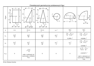 Charakterysyki geometryczne podstawowych figur b JZ0 b⋅h b⋅h 12 h⋅b 12 3 Dr inż. Bożena Litewka Y0 = Ygl 1 ⋅b⋅h 2 3 b⋅h 36 h⋅b 36 h ⋅b 72 sc 4⋅r 3⋅ Z0 = Zgl r Z0 4⋅r 3⋅ Z0 = Zgl b 2 b 2 1 ⋅b⋅h 2 h⋅b 48 3 3 ⋅r 2 ⋅r 2 ⋅r 4 ⋅r 4 4  2 ⋅r 4   8 − ⋅r 4 8 9⋅  4 ⋅r 8 4  0,05488⋅r   0,05488⋅r 4  0 0 4  4 − ⋅r 4 16 9⋅ ± 0 2  4 − ⋅r 4 16 9⋅ 0,1098⋅r 4 2 znak w zależności od usytowania w układzie Y0Z0 Y0 4⋅r 3⋅ r Z0 = Zgl b⋅h 36 3 sc r r sc h 3 b 3 Y0 = Ygl sc Z0 2 ⋅b 3 ± 0 h h sc 2 JY0Z0 Y0 = Ygl 2 ⋅h 3 2 ⋅h 3 Y0 h 3 Z0 = Zgl b 2 3 JY0 h Y0 = Ygl h 2 sc b 2 A b r Figura h 2 b  4 1 − ⋅r 4 9⋅ 8 ±0,01647⋅r 4 znak w zależności od usytowania w układzie Y0Z0