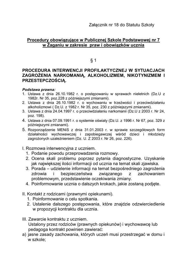 Załącznik nr 18 do Statutu Szkoły Procedury obowiązujące w Publicznej Szkole Podstawowej nr 7 w Żaganiu w zakresie praw i obowiązków ucznia §1 PROCEDURA INTERWENCJI PROFILAKTYCZNEJ W SYTUACJACH ZAGROŻENIA NARKOMANIĄ, ALKOHOLIZMEM, NIKOTYNIZMEM I PRZESTEPCZOŚCIĄ. Podstawa prawna: 1. Ustawa z dnia 26.10.1982 r. o postępowaniu w sprawach nieletnich (Dz.U z 1982r. Nr 35, poz.228 z późniejszymi zmianami). 2. Ustawa z dnia 26.10.1982 r. o wychowaniu w trzeźwości i przeciwdziałaniu alkoholizmowi ( Dz.U. z 1982 r. Nr 35, poz. 230 z późniejszymi zmianami). 3. Ustawa z dnia 24.04.1997 r. o przeciwdziałaniu narkomanii (Dz.U z 2003 r. Nr 24, poz. 198). 4. Ustawa z dnia 07.09.1991 r. o systemie oświaty (Dz.U. z 1996 r. Nr 67, poz. 329 z późniejszymi zmianami). 5. Rozporządzenie MENiS z dnia 31.01.2003 r. w sprawie szczegółowych form działalności wychowawczej i zapobiegawczej wśród dzieci i młodzieży zagrożonych uzależnieniem (Dz. U. Z 2003 r. Nr 26, poz. 226). I. Rozmowa interwencyjna z uczniem. 1. Podanie powodu przeprowadzenia rozmowy. 2. Ocena skali problemu poprzez pytania diagnostyczne. Uzyskanie jak największej ilości informacji od ucznia na temat skali zjawiska. 3. Porada – udzielenie informacji na temat bezpośredniego zagrożenia zdrowia i bezpieczeństwa związanego z zachowaniem problemowym, przedstawienie oczekiwania zmiany. 4. Poinformowanie ucznia o dalszych krokach, jakie zostaną podjęte. II. Kontakt z rodzicami (prawnymi opiekunami). 1. Poinformowanie o celu spotkania. 2. Ustalenie dalszego postępowania, które znajdzie odzwierciedlenie w propozycji kontraktu dla ucznia. III. Zawarcie kontraktu z uczniem. Ustalony przez rodziców (prawnych opiekunów) i wychowawcę lub pedagoga kontrakt powinien zawierać: a) jasne zasady zachowania, których uczeń musi przestrzegać w domu i w szkole; b) konsekwencje, które poniesie uczeń w przypadku nieprzestrzegania ustalonych zasad; c) przywileje jakie odzyska postępując zgodnie z ustaleniami; d) czas trwania ustaleń; e) listę zachowań, które będą podlegały kontroli w domu i w szkole; f) formy współpracy i częstotliwość kontaktów rodziców (prawnych opiekunów) i wychowawcy lub pedagoga g) uczeń podpisuje kontrakt, zobowiązują się do przestrzegania ustalonych zasad w obecności rodziców (prawnych opiekunów) i wychowawcy klasy lub pedagoga. IV. Nadzór nad wypełnianiem kontraktu przez ucznia sprawują rodzice (prawni opiekunowie) i wychowawca lub pedagog. V. Złamanie zasad kontraktu powoduje podjęcie przez szkołę innych działań przewidzianych prawem: 1. Zastosowanie określonych w Statucie Szkoły konsekwencji dyscyplinarnych, łącznie z możliwością przeniesienia ucznia do innej szkoły. 2. Zgłoszenie sprawy do sądu rodzinnego. VI. W przypadku ucznia, który przyszedł do szkoły pod wpływem alkoholu (0,5 ‰ alkoholu we krwi lub powyżej 0,25 mg alkoholu w 1 dm 3 wydychanego powietrza) lub środków odurzających, szkoła zapewnia niezbędną opiekę medyczną, a gdy zachodzi zagrożenie zdrowia lub życia – wzywa pogotowie. O zaistniałej sytuacji szkoła powiadamia rodziców (prawnych opiekunów). Jeśli uczeń jest agresywny wobec kolegów, nauczycieli, bądź swoim zachowaniem daje powód do zgorszenia albo zagraża życiu lub zdrowiu innych, szkoła zawiadamia również Policję. VII. Szkoła wzywa Policję w przypadku: 1. Znalezienia na terenie szkoły substancji psychoaktywnych. 2. Uzasadnionego podejrzenia posiadania przez ucznia substancji psychoaktywnych. 3. Popełnienia przez ucznia czynu karalnego. VIII.W klasie ucznia, który dopuścił się złamania obowiązujących zasad prowadzone są dodatkowe zajęcia profilaktyczne. IX. Uczeń potrzebujący pomocy specjalistycznej kierowany jest do odpowiednich instytucji. §2 PROCEDURA POSTĘPOWANIA W PRZYPADKU NARUSZENIA GODNOŚCI OSOBISTEJ UCZNIA Podstawa prawna: o Kodeks cywilny - §1 Art. 23, 24 ( Dz. U. 1964r. Nr 16 poz. 93) o Ustawa o systemie oświaty z dnia 7 września 1991r. - Art. 43.3 ( Dz. U. 1996r. Nr 67, poz. 329) o Karta Nauczyciela z dnia 26 stycznia 1982r. /z późniejszymi zmianami/ ( Dz. U. 1997r. Nr 56, poz. 357) o Rozporządzenie MEN z dnia 22 stycznia1998r. w sprawie komisji dyscyplinarnych dla nauczycieli i trybu postępowania dyscyplinarnego ( Dz. U. 1998r. Nr 15, poz. 64) 1. W przypadku uchybienia przez nauczyciela obowiązków wynikających z art. 6 Ustawy Karta Nauczyciela, a w rezultacie naruszenia godności osobistej ucznia, prowadzi się wewnątrzszkolne postępowanie wyjaśniające. 2. Dyrektor szkoły zapoznaje się z okolicznościami zdarzenia, prowadzi rozmowę wyjaśniającą z nauczycielem, uczniem, rodzicem (prawnym opiekunem). 3. Włącza w rozmowę wyjaśniającą wicedyrektora, pedagoga szkolnego i wychowawcę klasy. 4. Po ustaleniu stanu faktycznego i stwierdzeniu, że nastąpiło naruszenie godności osobistej ucznia, dyrektor ma prawo zastosować wobec nauczyciela konsekwencje w postaci: - upomnienia ustnego /przy pierwszym zdarzeniu/ - upomnienia pisemnego /przy powtórnym zdarzeniu/. 5. Po czynnościach wyjaśniających stwierdzających, że nie nastąpiło naruszenie godności osobistej ucznia, postępowanie zostaje zakończone, o czym zostają poinformowani zainteresowani. 6. Wszystkie czynności dokumentowane są protokołem, który składa się z wyjaśnień uczestników postępowania. 7. Jeżeli powyższa procedura potwierdza powtarzające się naruszenie godności osobistej ucznia, po dwukrotnym upomnieniu danego nauczyciela, przy kolejnym zdarzeniu dyrektor szkoły ma obowiązek skierować stosowne zawiadomienie do komisji dyscyplinarnej. 8. W przypadku ewidentnego naruszenia godności osobistej ucznia, niezwłocznie wszczyna się procedurę postępowania zgodnego z przepisami powszechnie obowiązującymi bez prowadzenia wyżej przedstawionego postępowania. §3 PROCEDURA POSTĘPOWANIA NAUCZYCIELA W PRZYPADKU AGRESYWNEGO ZACHOWANIA UCZNIA Podstawa prawna: o Roz