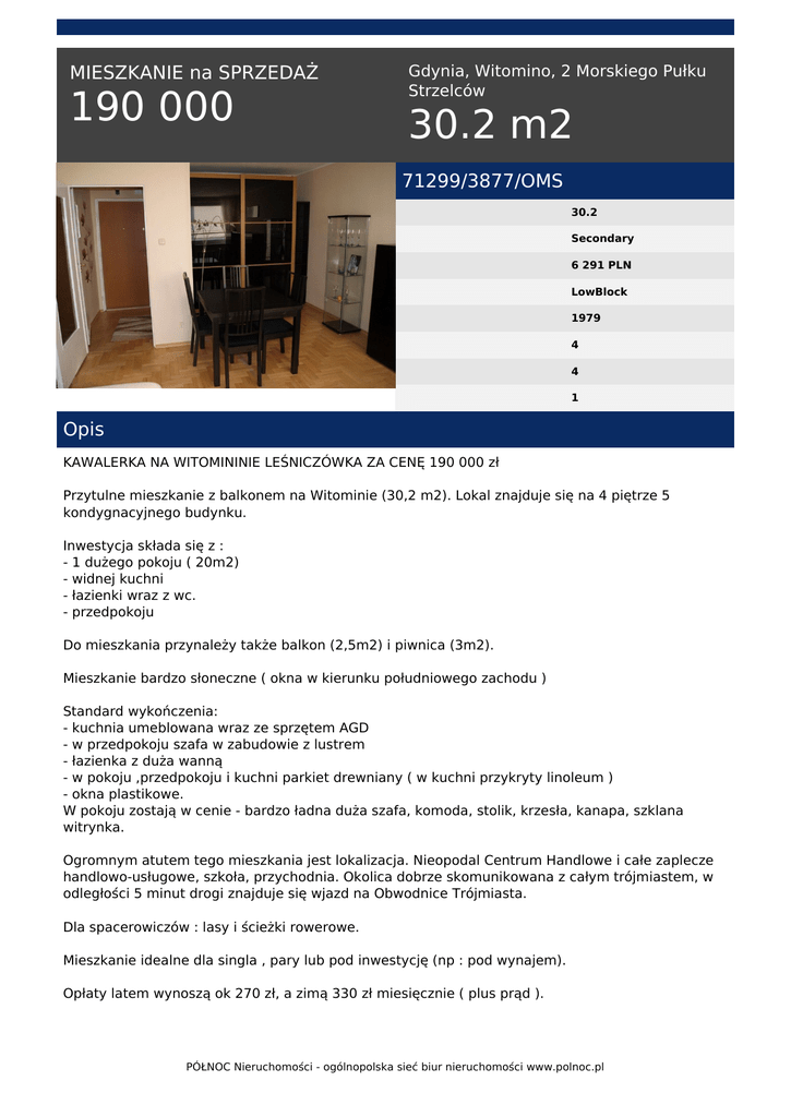 MIESZKANIE na SPRZEDAŻ 190 000 Gdynia, Witomino, 2 Morskiego Pułku Strzelców 30.2 m2 71299/3877/OMS 30.2 Secondary 6 291 PLN LowBlock 1979 4 4 1 Opis KAWALERKA NA WITOMININIE LEŚNICZÓWKA ZA CENĘ 190 000 zł Przytulne mieszkanie z balkonem na Witominie (30,2 m2). Lokal znajduje się na 4 piętrze 5 kondygnacyjnego budynku. Inwestycja składa się z : - 1 dużego pokoju ( 20m2) - widnej kuchni - łazienki wraz z wc. - przedpokoju Do mieszkania przynależy także balkon (2,5m2) i piwnica (3m2). Mieszkanie bardzo słoneczne ( okna w kierunku południowego zachodu ) Standard wykończenia: - kuchnia umeblowana wraz ze sprzętem AGD - w przedpokoju szafa w zabudowie z lustrem - łazienka z duża wanną - w pokoju ,przedpokoju i kuchni parkiet drewniany ( w kuchni przykryty linoleum ) - okna plastikowe. W pokoju zostają w cenie - bardzo ładna duża szafa, komoda, stolik, krzesła, kanapa, szklana witrynka. Ogromnym atutem tego mieszkania jest lokalizacja. Nieopodal Centrum Handlowe i całe zaplecze handlowo-usługowe, szkoła, przychodnia. Okolica dobrze skomunikowana z całym trójmiastem, w odległości 5 minut drogi znajduje się wjazd na Obwodnice Trójmiasta. Dla spacerowiczów : lasy i ścieżki rowerowe. Mieszkanie idealne dla singla , pary lub pod inwestycję (np : pod wynajem). Opłaty latem wynoszą ok 270 zł, a zimą 330 zł miesięcznie ( plus prąd ). PÓŁNOC Nieruchomości - ogólnopolska sieć biur nieruchomości www.polnoc.pl Mieszkanie posiada Księgę Wieczystą. Pomagamy bezpłatnie w uzyskaniu najkorzystniejszego kredytu na zakup w/w nieruchomości. U nas nie płacisz prowizji ! Polecam i zapraszam na prezentację. Więcej ofert znajdziesz na naszej stronie www.polnoc.pl * UWAGA! Zamieszczone na naszych stronach oferty nie stanowią oferty w rozumieniu Kodeksu Cywilnego, a dane w nich zawarte mają jedynie charakter informacyjny. Sławomir Dobrowolski tel. 600-893-004 email: [email protected] PÓŁNOC Nieruchomości - ogólnopolska sieć biur nieruchomości www.polnoc.pl Powered by TCPDF (www.tcpdf.org)