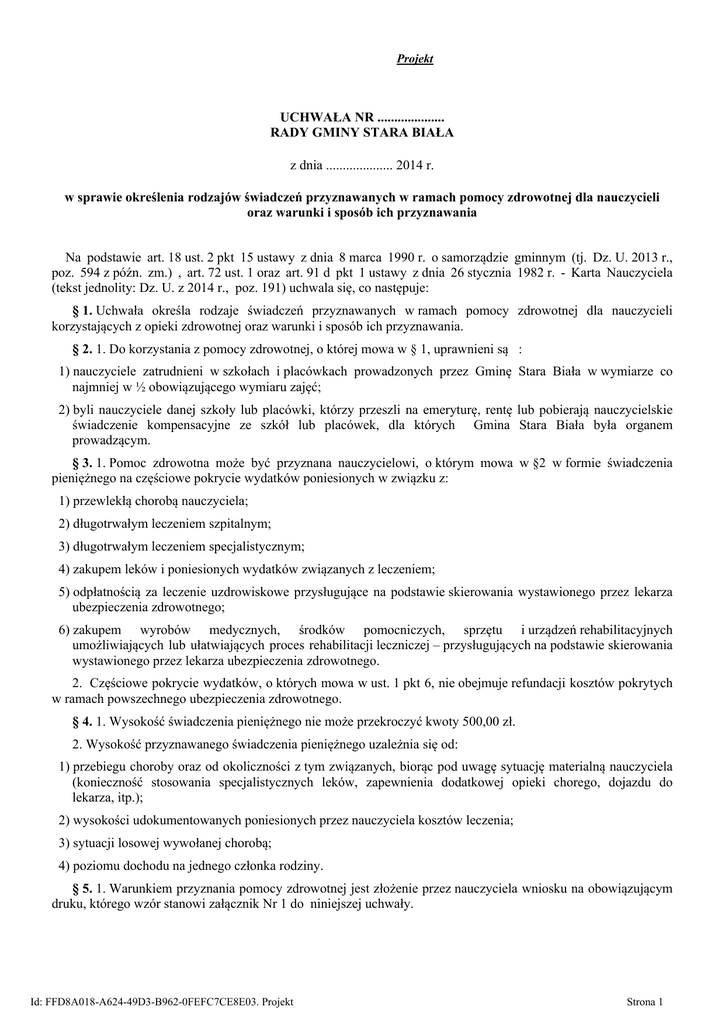 Projekt UCHWAŁA NR .................... RADY GMINY STARA BIAŁA z dnia .................... 2014 r. w sprawie określenia rodzajów świadczeń przyznawanych w ramach pomocy zdrowotnej dla nauczycieli oraz warunki i sposób ich przyznawania Na podstawie art. 18 ust. 2 pkt 15 ustawy z dnia 8 marca 1990 r. o samorządzie gminnym (tj. Dz. U. 2013 r., poz. 594 z późn. zm.) , art. 72 ust. 1 oraz art. 91 d pkt 1 ustawy z dnia 26 stycznia 1982 r. - Karta Nauczyciela (tekst jednolity: Dz. U. z 2014 r., poz. 191) uchwala się, co następuje: § 1. Uchwała określa rodzaje świadczeń przyznawanych w ramach pomocy zdrowotnej dla nauczycieli korzystających z opieki zdrowotnej oraz warunki i sposób ich przyznawania. § 2. 1. Do korzystania z pomocy zdrowotnej, o której mowa w § 1, uprawnieni są : 1) nauczyciele zatrudnieni w szkołach i placówkach prowadzonych przez Gminę Stara Biała w wymiarze co najmniej w ½ obowiązującego wymiaru zajęć; 2) byli nauczyciele danej szkoły lub placówki, którzy przeszli na emeryturę, rentę lub pobierają nauczycielskie świadczenie kompensacyjne ze szkół lub placówek, dla których Gmina Stara Biała była organem prowadzącym. § 3. 1. Pomoc zdrowotna może być przyznana nauczycielowi, o którym mowa w §2 w formie świadczenia pieniężnego na częściowe pokrycie wydatków poniesionych w związku z: 1) przewlekłą chorobą nauczyciela; 2) długotrwałym leczeniem szpitalnym; 3) długotrwałym leczeniem specjalistycznym; 4) zakupem leków i poniesionych wydatków związanych z leczeniem; 5) odpłatnością za leczenie uzdrowiskowe przysługujące na podstawie skierowania wystawionego przez lekarza ubezpieczenia zdrowotnego; 6) zakupem wyrobów medycznych, środków pomocniczych, sprzętu i urządzeń rehabilitacyjnych umożliwiających lub ułatwiających proces rehabilitacji leczniczej – przysługujących na podstawie skierowania wystawionego przez lekarza ubezpieczenia zdrowotnego. 2. Częściowe pokrycie wydatków, o których mowa w ust. 1 pkt 6, nie obejmuje refundacji kosztów pokrytych w ramach powszechnego ubezpieczenia zdrowotnego. § 4. 1. Wysokość świadczenia pieniężnego nie może przekroczyć kwoty 500,00 zł. 2. Wysokość przyznawanego świadczenia pieniężnego uzależnia się od: 1) przebiegu choroby oraz od okoliczności z tym związanych, biorąc pod uwagę sytuację materialną nauczyciela (konieczność stosowania specjalistycznych leków, zapewnienia dodatkowej opieki chorego, dojazdu do lekarza, itp.); 2) wysokości udokumentowanych poniesionych przez nauczyciela kosztów leczenia; 3) sytuacji losowej wywołanej chorobą; 4) poziomu dochodu na jednego członka rodziny. § 5. 1. Warunkiem przyznania pomocy zdrowotnej jest złożenie przez nauczyciela wniosku na obowiązującym druku, którego wzór stanowi załącznik Nr 1 do niniejszej uchwały. Id: FFD8A018-A624-49D3-B962-0FEFC7CE8E03. Projekt Strona 1 2. Wnioski o których mowa w ust. 1, zainteresowani nauczyciele wraz z wymaganą dokumentacją składają do Dyrektora Szkoły, który przedkłada je do rozpatrzenia powołanej przez Wójta Gminy Komisji Zdrowotnej . 3. Za datę złożenia wniosku przyjmuję się datę złożenia dokumentacji pozbawionej uchybień formalnych. 4. Do wniosku należy dołączyć następujące dokumenty: 1) zaświadczenie lekarskie potwierdzające leczenie związane z przewlekłą lub ciężką chorobą, leczenie specjalistyczne, konieczność stosowania protez, sprzętu rehabilitacyjnego, aparatury medycznej; 2) dokumenty potwierdzające poniesione koszty związane z leczeniem lub zakupem protez, sprzętu rehabilitacyjnego, aparatury medycznej; 3) oświadczenie o dochodach przypadających na jednego członka rodziny. 5. Wniosek o przyznanie nauczycielowi pomocy zdrowotnej może złożyć przełożony nauczyciela, przedstawiciel związków zawodowych, rada pedagogiczna szkoły, opiekun, jeżeli nauczyciel nie jest zdolny osobiście do czynności w tym zakresie. 6. Dyrektor szkoły przekazuje wnioski do Wójta Gminy w terminie 7 dni. § 6. 1. Środkami pieniężnymi przeznaczonymi na pomoc zdrowotną dla nauczycieli zarządza Wójt Gminy. 2. Środki , o których mowa w ust. 1, niewykorzystane w danym roku kalendarzowym nie przechodzą na rok następny. 3. W celu racjonalnego i jawnego gospodarowania środkami pieniężnymi przeznaczonymi na pomoc zdrowotną dla nauczycieli korzystających z opieki zdrowotnej, Wójt Gminy powołuje Komisję Zdrowotną, w skład której wchodzą: 1) przewodniczący-przedstawiciel organu prowadzącego szkoły; 2) członkowie: a) jeden przedstawiciel związków zawodowych zrzeszających nauczycieli na terenie gminy; b) dyrektorzy szkół, dla których organem prowadzącym jest Gmina Stara Biała. 4. Do zadań Komisji Zdrowotnej należy opiniowanie wniosków o przyznanie pomocy zdrowotnej. 5. Przy rozpatrywaniu wniosków nauczycieli Komisja Zdrowotna bierze pod uwagę nie tylko wysokość dodatkowych kosztów poniesionych przez nauczyciela w związku z przeprowadzeniem leczenia, ale również całokształt okoliczności wpływających na jego sytuację materialną. 6. Komisja Zdrowotna sporządza protokół ze swych prac. 7. Rozpatrywanie wniosków odbywa się dwa razy w roku, w miesiącu kwietniu i listopadzie. § 7. Pomoc zdrowotna może być przyznana nauczycielom, o których mowa w § 2, nie częściej niż raz na rok. § 8. Decyzję o przyznaniu pomocy zdrowotnej dla nauczycieli podejmuje Wójt Gminy w oparciu o opinię Komisji Zdrowotnej. § 9. Wykonanie Uchwały powierza się Wójtowi Gminy. § 10. Uchwała wchodzi w życie 14 dni po opublikowaniu w Dzienniku Urzędowym Województwa Mazowieckiego. Id: FFD8A018-A624-49D3-B962-0FEFC7CE8E03. Projekt Strona 2 Załącznik Nr 1 Do Uchwały Nr………….. Rady Gminy Stara Biała z dnia ………………… Wniosek o przyznanie pomocy zdrowotnej 1. Wnioskodawca (imię i nazwisko) …………………………………………………………………