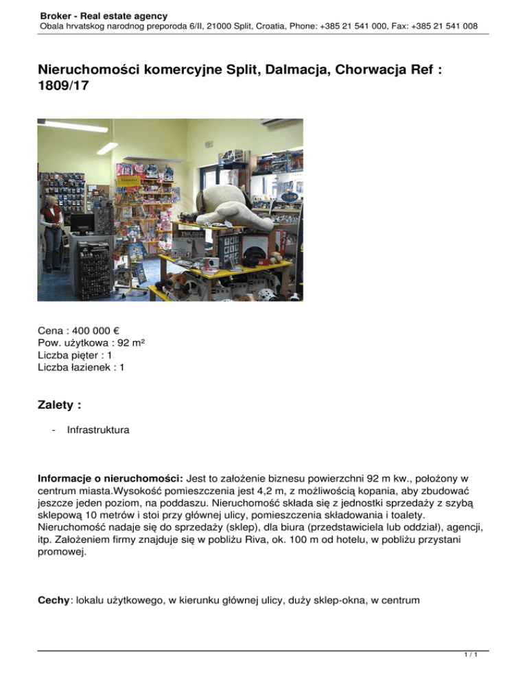 Broker - Real estate agency Obala hrvatskog narodnog preporoda 6/II, 21000 Split, Croatia, Phone: +385 21 541 000, Fax: +385 21 541 008 Nieruchomości komercyjne Split, Dalmacja, Chorwacja Ref : 1809/17 Cena : 400 000 € Pow. użytkowa : 92 m² Liczba pięter : 1 Liczba łazienek : 1 Zalety : - Infrastruktura Informacje o nieruchomości: Jest to założenie biznesu powierzchni 92 m kw., położony w centrum miasta.Wysokość pomieszczenia jest 4,2 m, z możliwością kopania, aby zbudować jeszcze jeden poziom, na poddaszu. Nieruchomość składa się z jednostki sprzedaży z szybą sklepową 10 metrów i stoi przy głównej ulicy, pomieszczenia składowania i toalety. Nieruchomość nadaje się do sprzedaży (sklep), dla biura (przedstawiciela lub oddział), agencji, itp. Założeniem firmy znajduje się w pobliżu Riva, ok. 100 m od hotelu, w pobliżu przystani promowej. Cechy: lokalu użytkowego, w kierunku głównej ulicy, duży sklep-okna, w centrum 1/1