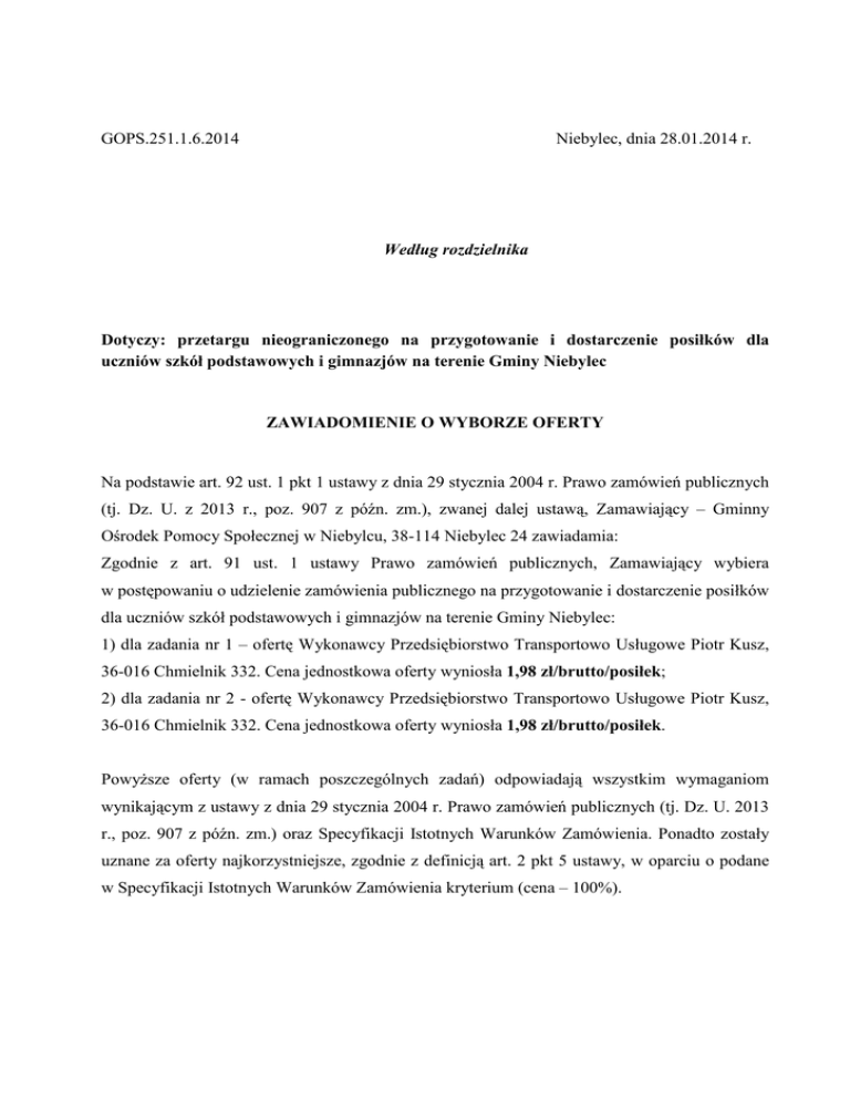 GOPS.251.1.6.2014 Niebylec, dnia 28.01.2014 r. Według rozdzielnika Dotyczy: przetargu nieograniczonego na przygotowanie i dostarczenie posiłków dla uczniów szkół podstawowych i gimnazjów na terenie Gminy Niebylec ZAWIADOMIENIE O WYBORZE OFERTY Na podstawie art. 92 ust. 1 pkt 1 ustawy z dnia 29 stycznia 2004 r. Prawo zamówień publicznych (tj. Dz. U. z 2013 r., poz. 907 z późn. zm.), zwanej dalej ustawą, Zamawiający – Gminny Ośrodek Pomocy Społecznej w Niebylcu, 38-114 Niebylec 24 zawiadamia: Zgodnie z art. 91 ust. 1 ustawy Prawo zamówień publicznych, Zamawiający wybiera w postępowaniu o udzielenie zamówienia publicznego na przygotowanie i dostarczenie posiłków dla uczniów szkół podstawowych i gimnazjów na terenie Gminy Niebylec: 1) dla zadania nr 1 – ofertę Wykonawcy Przedsiębiorstwo Transportowo Usługowe Piotr Kusz, 36-016 Chmielnik 332. Cena jednostkowa oferty wyniosła 1,98 zł/brutto/posiłek; 2) dla zadania nr 2 - ofertę Wykonawcy Przedsiębiorstwo Transportowo Usługowe Piotr Kusz, 36-016 Chmielnik 332. Cena jednostkowa oferty wyniosła 1,98 zł/brutto/posiłek. PowyŜsze oferty (w ramach poszczególnych zadań) odpowiadają wszystkim wymaganiom wynikającym z ustawy z dnia 29 stycznia 2004 r. Prawo zamówień publicznych (tj. Dz. U. 2013 r., poz. 907 z późn. zm.) oraz Specyfikacji Istotnych Warunków Zamówienia. Ponadto zostały uznane za oferty najkorzystniejsze, zgodnie z definicją art. 2 pkt 5 ustawy, w oparciu o podane w Specyfikacji Istotnych Warunków Zamówienia kryterium (cena – 100%). Informacja o wykonawcach, którzy złoŜyli oferty: Nazwa i adres Wykonawcy Lp. Cena oferty w zł Zadanie nr 1 Zadanie nr 2 - 3,30 1 Bar „Podkarpacki” Małgorzata Lis, 38-114 Niebylec 191 2 „U IZY” s.c., R. Ząbik, I. Domaradzka, 38-111 śyznów 305 3,40 - 3 GRAMAR Sp. z o.o., ul. Staroniwska 115, 35-101 Rzeszów 2,68 2,19 4 Przedsiębiorstwo Transportowo Usługowe Piotr Kusz, 36-016 Chmielnik 332 1,98 1,98 Punktacja przyznana ofertom w kaŜdym kryterium oceny ofert i łączna punktacja: Zadanie nr 1 Lp. Nr oferty 1 2 2 4 Punktacja w kryterium cena Łączna punktacja „U IZY” s.c., R. Ząbik, I. Domaradzka, 38-111 śyznów 305 58,24 58,24 Przedsiębiorstwo Transportowo Usługowe Piotr Kusz, 36-016 Chmielnik 332 100,00 100,00 Nazwa i siedziba Wykonawcy Zadanie nr 2 Lp. Nr oferty Nazwa i siedziba Wykonawcy Punktacja w kryterium cena Łączna punktacja 1 1 Bar „Podkarpacki” Małgorzata Lis, 38-114 Niebylec 191 60,00 60,00 2 4 Przedsiębiorstwo Transportowo Usługowe Piotr Kusz, 36-016 Chmielnik 332 100,00 100,00 Na podstawie art. 92 ust. 1 pkt 2 ustawy Zamawiający zawiadamia o wykonawcach, których oferty zostały odrzucone: Lp. 1 Nr oferty 3 Nazwa i siedziba Wykonawcy GRAMAR Sp. z o.o., ul. Staroniwska 115, 35-101 Rzeszów Uzasadnienie faktyczne i prawne Wykonawca został wykluczony z postępowania o udzielenie zamówienia publicznego. Zgodnie z art. 89 ust. 1 pkt 5 ustawy Zamawiający odrzucił ofertę, gdyŜ została złoŜona przez wykonawcę wykluczonego z udziału w postępowaniu o udzielenie zamówienia lub niezaproszonego do składania ofert Na podstawie art. 92 ust. 1 pkt 3 ustawy Zamawiający zawiadamia o wykonawcach, którzy zostali wykluczeni z postępowania: Lp. 1 Nr oferty 3 Nazwa i siedziba Wykonawcy GRAMAR Sp. z o.o., ul. Staroniwska 115, 35-101 Rzeszów Uzasadnienie faktyczne i prawne Zamawiający pismem nr GOPS.251.1.2.2014 z dnia 23.01.2014 r. wezwał Wykonawcę do uzupełnienia dokumentów potwierdzających spełnianie warunków udziału w postępowaniu o udzielenie zamówienia publicznego w trybie przetargu nieograniczonego na przygotowanie i dostarczenie posiłków dla uczniów szkół podstawowych i gimnazjów na terenie Gminy Niebylec, tj. w szczególności aktualnego zezwolenia właściwego terenowo sanepidu na przygotowanie i transport posiłków. Przedmiotowy dokument naleŜało złoŜyć w siedzibie Zamawiającego w terminie do dnia 28.01.2014 r. do godz. 10:00. W wyznaczonym powyŜej terminie Wykonawca nie przedłoŜył wymagane dokumentu, a tym samym nie wykazał spełniania warunków udziału w postępowaniu, w związku z czym na podstawie art. 24 ust. 2 pkt 4 ustawy został wykluczony z postępowania. Na podstawie art. 92 ust. 1 pkt 4 ustawy Zamawiający zawiadamia jednocześnie, iŜ umowa w sprawie zamówienia publicznego moŜe być zawarta w terminie nie krótszym niŜ 10 dni od dnia przesłania niniejszego zawiadomienia, tj. nie wcześniej niŜ w dniu 07.02.2014 r.
