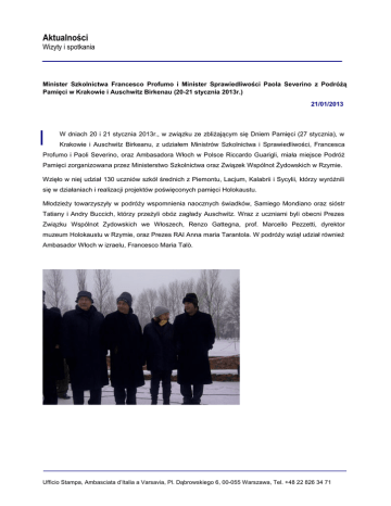 Aktualności Wizyty i spotkania Minister Szkolnictwa Francesco Profumo i Minister Sprawiedliwości Paola Severino z Podróżą Pamięci w Krakowie i Auschwitz Birkenau (20-21 stycznia 2013r.) 21/01/2013 I W dniach 20 i 21 stycznia 2013r., w związku ze zbliżającym się Dniem Pamięci (27 stycznia), w Krakowie i Auschwitz Birkeanu, z udziałem Ministrów Szkolnictwa i Sprawiedliwości, Francesca Profumo i Paoli Severino, oraz Ambasadora Włoch w Polsce Riccardo Guarigli, miała miejsce Podróż Pamięci zorganizowana przez Ministerstwo Szkolnictwa oraz Związek Wspólnot Żydowskich w Rzymie. Wzięło w niej udział 130 uczniów szkół średnich z Piemontu, Lacjum, Kalabrii i Sycylii, którzy wyróżnili się w działaniach i realizacji projektów poświęconych pamięci Holokaustu. Młodzieży towarzyszyły w podróży wspomnienia naocznych świadków, Samiego Mondiano oraz sióstr Tatiany i Andry Buccich, którzy przeżyli obóz zagłady Auschwitz. Wraz z uczniami byli obecni Prezes Związku Wspólnot Zydowskich we Włoszech, Renzo Gattegna, prof. Marcello Pezzetti, dyrektor muzeum Holokaustu w Rzymie, oraz Prezes RAI Anna maria Tarantola. W podróży wziął udział również Ambasador Włoch w izraelu, Francesco Maria Talò. Ufficio Stampa, Ambasciata d’Italia a Varsavia, Pl. Dąbrowskiego 6, 00-055 Warszawa, Tel. +48 22 826 34 71