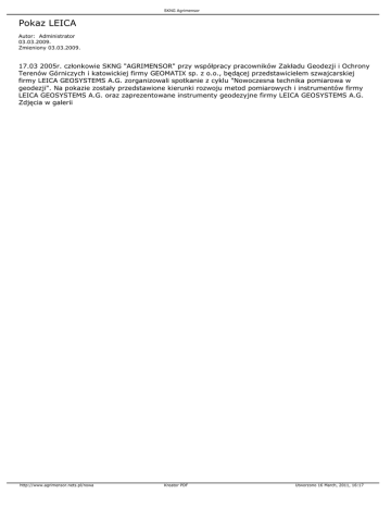 SKNG Agrimensor Pokaz LEICA Autor: Administrator 03.03.2009. Zmieniony 03.03.2009. 17.03 2005r. członkowie SKNG "AGRIMENSOR" przy współpracy pracowników Zakładu Geodezji i Ochrony Terenów Górniczych i katowickiej firmy GEOMATIX sp. z o.o., będącej przedstawicielem szwajcarskiej firmy LEICA GEOSYSTEMS A.G. zorganizowali spotkanie z cyklu "Nowoczesna technika pomiarowa w geodezji". Na pokazie zostały przedstawione kierunki rozwoju metod pomiarowych i instrumentów firmy LEICA GEOSYSTEMS A.G. oraz zaprezentowane instrumenty geodezyjne firmy LEICA GEOSYSTEMS A.G. Zdjęcia w galerii http://www.agrimensor.nets.pl/nowa Kreator PDF Utworzono 16 March, 2011, 16:17