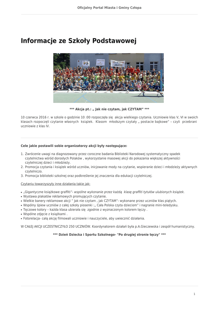 Oficjalny Portal Miasta i Gminy Człopa Informacje ze Szkoły Podstawowej *** Akcja pt.: „ Jak nie czytam, jak CZYTAM” *** 10 czerwca 2016 r. w szkole o godzinie 10 :00 rozpoczęła się akcja wielkiego czytania. Uczniowie klas V, VI w swoich klasach rozpoczęli czytanie własnych książek. Klasom młodszym czytały „ postacie bajkowe” – czyli przebrani uczniowie z klas IV. Cele jakie postawili sobie organizatorzy akcji były następujące: 1. Zwrócenie uwagi na diagnozowany przez coroczne badania Biblioteki Narodowej systematyczny spadek czytelnictwa wśród dorosłych Polaków , wykorzystanie masowej akcji do pokazania większej aktywności czytelniczej dzieci i młodzieży. 2. Promocja czytania i książek wśród uczniów, inicjowanie mody na czytanie, wspieranie dzieci i młodzieży aktywnych czytelniczo. 3. Promocja biblioteki szkolnej oraz podkreślenie jej znaczenia dla edukacji czytelniczej. Czytaniu towarzyszyły inne działania takie jak: ● ● ● ● ● ● ● „Gigantyczne książkowe graffiti”- wspólne wykonanie przez każdą klasę graffiti tytułów ulubionych książek. Wystawa plakatów reklamowych promujących czytanie. Wielkie banery reklamowe akcji ” Jak nie czytam , jak CZYTAM”- wykonane przez uczniów klas piątych. Wspólny śpiew uczniów z całej szkoły piosenki :„ Cała Polska czyta dzieciom” i nagranie mini-teledysku. Tęczowe kolory – każda klasa ubierała się zgodnie z wyznaczonym kolorem tęczy . Wspólne zdjęcie z książkami . Fotorelacja- całą akcję filmowali uczniowie i nauczyciele, aby uwiecznić działania. W CAŁEJ AKCJI UCZESTNICZYŁO 250 UCZNIÓW. Koordynatorem działań była p.A.Gieczewska i zespół humanistyczny. *** Dzień Dziecka i Sportu Szkolnego- "Po drugiej stronie tęczy" *** 1 Oficjalny Portal Miasta i Gminy Człopa Dzień 14 czerwca był dla uczniów dniem wolnym od zajęć dydaktycznych, ale nie od wspólnej zabawy, spotkań z kolegami z innych klas, czasem przeznaczonym na śpiew i taniec. Od rana dzieci brały udział w rozgrywkach sportowo-plastyczno-muzycznych. Rozwiązywały rebusy, krzyżówki i quizy z języka polskiego i matematyki. Uczyły się także , jak udzielać pierwszej pomocy. Najbardziej podobały się uczniom zajęcia przygotowane i poprowadzone przez aktorów teatru profilaktycznego -" Grupę T" z Torunia. Aktorzy dwoili się i troili, żeby jak najlepiej zabawić rozbrykanych uczniów. Była nauka tańca, wielkie mydlane bańki, różne gry i zabawy, np. z chustą animacyjną, dmuchanymi konikami, wielkimi balonami i kostkami do gry. Na zakończenie każde dziecko zjadło kiełbaskę z grilla przygotowaną dla niego przez Radę Rodziców. 2
