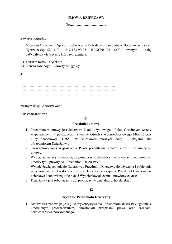 UMOWA DZIERŻAWY Nr………………………….. Zawarta pomiędzy: Miejskim Ośrodkiem Sportu i Rekreacji w Bolesławcu z siedzibą w Bolesławcu przy ul. Zgorzeleckiej 52, NIP: 612-183-99-05 REGON: 021412901- zwanym dalej „Wydzierżawiającym”, który reprezentują: 1) Dariusz Jośko – Dyrektor 2) Renata Kozinoga – Główny Księgowy a ………………………………………………………………………. ………………………………………………………………………. ………………………………………………………………………. ………………………………………………………………………. ………………………………………………………………………. zwanym dalej „Dzierżawcą” O następującej treści: §1 Przedmiot umowy 1. Przedmiotem umowy jest dzierżawa lokalu użytkowego - Pokoi Gościnnych wraz z wyposażeniem - położonego na terenie Ośrodka Wodno-Sportowego MOSiR przy ulicy Spacerowej 24-265 w Bolesławcu, zwanych dalej „Pokojami” lub „Przedmiotem Dzierżawy”. 2. Szczegółowy opis wyposażenia Pokoi przedstawia Załącznik Nr 1 do niniejszej umowy. 3. Wydzierżawiający oświadcza, że posiada umożliwiający mu zawarcie przedmiotowej umowy tytuł prawny do „Przedmiotu Dzierżawy”. 4. Wydzierżawiający oddaje Dzierżawcy Przedmiot Dzierżawy do używania i pobierania pożytków, na cel określony w ust. 5, a Dzierżawca przyjmuje Przedmiot Dzierżawy w dzierżawę i zobowiązuje się płacić Wydzierżawiającemu umówiony czynsz. 5. Dzierżawca jest zobowiązany do prowadzenie działalności hotelarskiej. §2 Używanie Przedmiotu Dzierżawy 1. Dzierżawca zobowiązuje się do wykorzystywania Przedmiotu dzierżawy zgodnie z umówionym przeznaczeniem, określonym przepisami prawa oraz zasadami bezpieczeństwa powszechnego. 2. Dzierżawca ma prawo dokonać nakładów zwiększających wartość Przedmiotu Dzierżawy wyłącznie za zgodą i w zakresie uzgodnionym każdorazowo w formie pisemnej z Wydzierżawiającym. 3. Bez zgody Wydzierżawiającego Dzierżawca nie może zmienić przeznaczenia Przedmiotu Dzierżawy. 4. Dzierżawca nie jest uprawniony do oddania Przedmiotu Dzierżawy w poddzierżawę do używania osobie trzeciej na innej podstawie tak w całości, jak i w części bez zgody Wydzierżawiającego. 5. Dzierżawca zobowiązuje się w trakcie całego okresu trwania dzierżawy utrzymać co najmniej dotychczasowy standard Pokoi. 6. Przekazanie Przedmiotu Dzierżawy nastąpi na podstawie protokołu przekazania. §3 Prawa i obowiązki Stron 1. Dzierżawca jest zobowiązany do: 1) organizowania prowadzonej przez siebie działalności w taki sposób aby w jak najmniejszym stopniu kolidowała ona z działaniami prowadzonymi przez Wydzierżawiającego na terenie Ośrodka. 2) utrzymania, we własnym zakresie i na koszt własny, porządku i czystości, w tym utrzymania zimowego Przedmiotu Dzierżawy; Dzierżawca jest zobowiązany w szczególności we własnym zakresie i na własny koszt zapewnić wywóz wytworzonych przez siebie odpadów komunalnych, na dowód czego zobowiązuje się przedłożyć kopię stosownej umowy z odbiorcą ww. odpadów, 3) dokonywania bieżących remontów i ponoszenia nakładów, których konieczność wynika z używania Przedmiotu Dzierżawy, 4) zapewnienia ochrony Przedmiotu Dzierżawy, 5) zapewnienia dostaw mediów (wody, energii elektrycznej, ciepła) poprzez zawarcie odpowiednich umów z dostawcami, a także przedstawienia kopii tych umów Wydzierżawiającemu, 6) utrzymania Przedmiotu Dzierżawy w stanie niepogorszony (z wyjątkiem zużycia będącego wynikiem prawidłowego używania) i przydatnym do użytku w tym w szczególności do obsługi, konserwacji, dokonywania napraw i przeglądów instalacji elektrycznych, teletechnicznych oraz wody i kanalizacji, a także urządzeń wchodzących w skład tych instalacji, 7) zawarcia w terminie do 14 dni od daty zawarcia niniejszej umowy ubezpieczenia przedmiotu Dzierżawy od wszelkiego ryzyka na kwotę co najmniej jeden milion zł.(słownie złotych: jeden milion) oraz posiadania i utrzymywania przez cały okres trwania umowy polisy ubezpieczeniowej obejmującej to ubezpieczenie, a nadto Dzierżawca zobowiązuje się, że dokona w tym samym terminie cesji wszelkich praw z umowy ubezpieczenia na Wydzierżawiającego. W przypadku przedłużania umowy ubezpieczenia na kolejne okresy Dzierżawca jest zobowiązany do przedkładania Wydzierżawiającemu nowych polis najpóźniej w dniu upływu okresu ważności dotychczasowej polisy, 2. Wydzierżawiający ma prawo do kontroli Przedmiotu Dzierżawy i sposobu wykonania niniejszej umowy pod kątem oceny jej należytego wykonywania. 3. Wydzierżawiający oświadcza, że zapoznał się z Przedmiotem Dzierżawy, jest w pełni świadomy jego stanu i nie zgłasza żadnych zastrzeżeń z tym związanych. §4 Czas obowiązywania umowy 1. 2. 3. 4. Umowa zostaje zawarta na czas oznaczony - 3lat. Umowa zostaje zawarta z dniem jej podpisania przez obie Strony. Umowa może zostać rozwiązana na zasadzie porozumienia stron w każdym czasie. Wydzierżawiający może wypowiedzieć niniejszą umowę ze skutkiem natychmiastowym w przypadku, gdy Dzierżawca: 1) zalega z zapłatą czynszu lub opłat za media za dwa kolejne okresy płatności. W takim przypadku Wydzierżawiający uprzedzi Dzierżawcę na piśmie o zamiarze wypowiedzenia umowy bez zachowania terminu wypowiedzenia, udzielając mu dodatkowego 14-dniowego terminu do zapłaty zaległego czynszu lub opłat za media, 2) oddał Przedmiot Dzierżawy lub jego część w poddzierżawę lub używania osobie trzeciej – bez uzyskania uprzedniej, pisemnej zgody wydzierżawiającego, 3) używa Przedmiotu Dzierżawy w sposób sprzeczny z umową lub przeznaczeniem, 4) dopuszcza się rażącego naruszenia innych, istotnych postanowień umowy lub braku wniesienia kaucji, 5) nie ubezpieczył przedmiotu Dzier