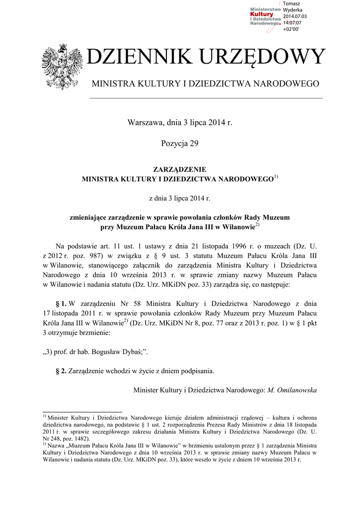 Tomasz Wyderka 2014.07.03 14:07:07 +02'00' DZIENNIK URZĘDOWY MINISTRA KULTURY I DZIEDZICTWA NARODOWEGO Warszawa, dnia 3 lipca 2014 r. Pozycja 29 ZARZĄDZENIE MINISTRA KULTURY I DZIEDZICTWA NARODOWEGO1) z dnia 3 lipca 2014 r. zmieniające zarządzenie w sprawie powołania członków Rady Muzeum przy Muzeum Pałacu Króla Jana III w Wilanowie2) Na podstawie art. 11 ust. 1 ustawy z dnia 21 listopada 1996 r. o muzeach (Dz. U. z 2012 r. poz. 987) w związku z § 9 ust. 3 statutu Muzeum Pałacu Króla Jana III w Wilanowie, stanowiącego załącznik do zarządzenia Ministra Kultury i Dziedzictwa Narodowego z dnia 10 września 2013 r. w sprawie zmiany nazwy Muzeum Pałacu w Wilanowie i nadania statutu (Dz. Urz. MKiDN poz. 33) zarządza się, co następuje: § 1. W zarządzeniu Nr 58 Ministra Kultury i Dziedzictwa Narodowego z dnia 17 listopada 2011 r. w sprawie powołania członków Rady Muzeum przy Muzeum Pałacu Króla Jana III w Wilanowie2) (Dz. Urz. MKiDN Nr 8, poz. 77 oraz z 2013 r. poz. 1) w § 1 pkt 3 otrzymuje brzmienie: „3) prof. dr hab. Bogusław Dybaś;”. § 2. Zarządzenie wchodzi w życie z dniem podpisania. Minister Kultury i Dziedzictwa Narodowego: M. Omilanowska ________________________ 1) Minister Kultury i Dziedzictwa Narodowego kieruje działem administracji rządowej – kultura i ochrona dziedzictwa narodowego, na podstawie § 1 ust. 2 rozporządzenia Prezesa Rady Ministrów z dnia 18 listopada 2011 r. w sprawie szczegółowego zakresu działania Ministra Kultury i Dziedzictwa Narodowego (Dz. U. Nr 248, poz. 1482). 1) Nazwa „Muzeum Pałacu Króla Jana III w Wilanowie” w brzmieniu ustalonym przez § 1 zarządzenia Ministra Kultury i Dziedzictwa Narodowego z dnia 10 września 2013 r. w sprawie zmiany nazwy Muzeum Pałacu w Wilanowie i nadania statutu (Dz. Urz. MKiDN poz. 33), które weszło w życie z dniem 10 września 2013 r.