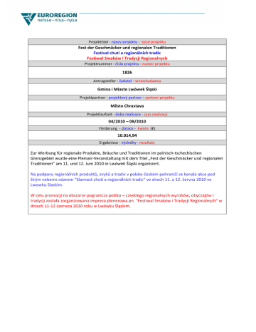 Projekttitel - název projektu - tytuł projektu Fest der Geschmäcker und regionalen Traditionen Festival chutí a regionálních tradic Festiwal Smaków i Tradycji Regionalnych Projektnummer - číslo projektu - numer projektu 1826 Antragsteller - žadatel - wnioskodawca Gmina i Miasto Lwówek Śląski Projektpartner - projektový partner – partner projektu Město Chrastava Projektlaufzeit - doba realizace - czas realizacji 04/2010 – 09/2010 Förderung - dotace - kwota (€) 10.014,94 Ergebnisse - výsledky - rezultaty Zur Werbung für regionale Produkte, Bräuche und Traditionen im polnisch-tschechischen Grenzgebiet wurde eine Pleinair-Veranstaltung mit dem Titel „Fest der Geschmäcker und regionalen Traditionen“ am 11. und 12. Juni 2010 in Lwówek Śląski organisiert. Na podporu regionálních produktů, zvyků a tradic v polsko-českém pohraničí se konala akce pod širým nebems názvem “Slavnost chutí a regionálních tradic“ ve dnech 11. a 12. června 2010 ve Lwowku Slaskim. W celu promocji na obszarze pogranicza polsko – czeskiego regionalnych wyrobów, obyczajów i tradycji została zorganizowana impreza plenerowa pn. "Festiwal Smaków i Tradycji Regionalnych" w dniach 11-12 czerwca 2010 roku w Lwówku Śląskim.