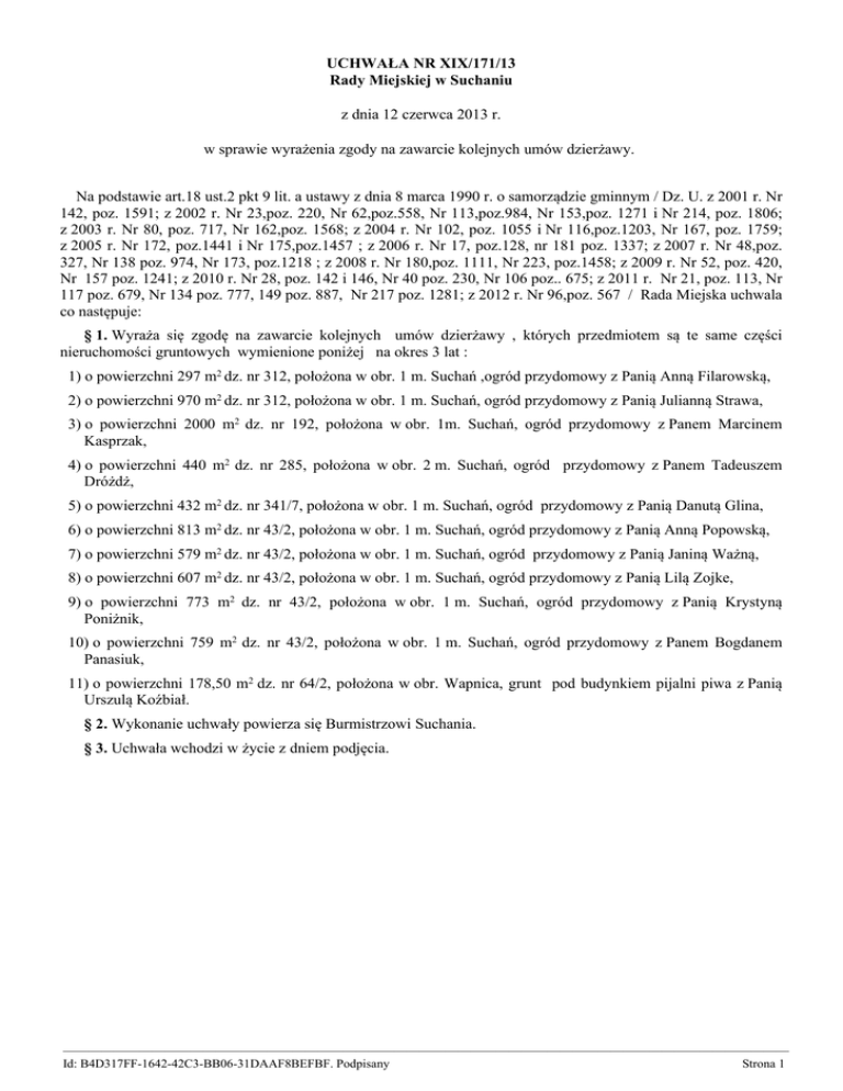UCHWAŁA NR XIX/171/13 Rady Miejskiej w Suchaniu z dnia 12 czerwca 2013 r. w sprawie wyrażenia zgody na zawarcie kolejnych umów dzierżawy. Na podstawie art.18 ust.2 pkt 9 lit. a ustawy z dnia 8 marca 1990 r. o samorządzie gminnym / Dz. U. z 2001 r. Nr 142, poz. 1591; z 2002 r. Nr 23,poz. 220, Nr 62,poz.558, Nr 113,poz.984, Nr 153,poz. 1271 i Nr 214, poz. 1806; z 2003 r. Nr 80, poz. 717, Nr 162,poz. 1568; z 2004 r. Nr 102, poz. 1055 i Nr 116,poz.1203, Nr 167, poz. 1759; z 2005 r. Nr 172, poz.1441 i Nr 175,poz.1457 ; z 2006 r. Nr 17, poz.128, nr 181 poz. 1337; z 2007 r. Nr 48,poz. 327, Nr 138 poz. 974, Nr 173, poz.1218 ; z 2008 r. Nr 180,poz. 1111, Nr 223, poz.1458; z 2009 r. Nr 52, poz. 420, Nr 157 poz. 1241; z 2010 r. Nr 28, poz. 142 i 146, Nr 40 poz. 230, Nr 106 poz.. 675; z 2011 r. Nr 21, poz. 113, Nr 117 poz. 679, Nr 134 poz. 777, 149 poz. 887, Nr 217 poz. 1281; z 2012 r. Nr 96,poz. 567 / Rada Miejska uchwala co następuje: § 1. Wyraża się zgodę na zawarcie kolejnych umów dzierżawy , których przedmiotem są te same części nieruchomości gruntowych wymienione poniżej na okres 3 lat : 1) o powierzchni 297 m2 dz. nr 312, położona w obr. 1 m. Suchań ,ogród przydomowy z Panią Anną Filarowską, 2) o powierzchni 970 m2 dz. nr 312, położona w obr. 1 m. Suchań, ogród przydomowy z Panią Julianną Strawa, 3) o powierzchni 2000 m2 dz. nr 192, położona w obr. 1m. Suchań, ogród przydomowy z Panem Marcinem Kasprzak, 4) o powierzchni 440 m2 dz. nr 285, położona w obr. 2 m. Suchań, ogród przydomowy z Panem Tadeuszem Dróżdż, 5) o powierzchni 432 m2 dz. nr 341/7, położona w obr. 1 m. Suchań, ogród przydomowy z Panią Danutą Glina, 6) o powierzchni 813 m2 dz. nr 43/2, położona w obr. 1 m. Suchań, ogród przydomowy z Panią Anną Popowską, 7) o powierzchni 579 m2 dz. nr 43/2, położona w obr. 1 m. Suchań, ogród przydomowy z Panią Janiną Ważną, 8) o powierzchni 607 m2 dz. nr 43/2, położona w obr. 1 m. Suchań, ogród przydomowy z Panią Lilą Zojke, 9) o powierzchni 773 m2 dz. nr 43/2, położona w obr. 1 m. Suchań, ogród przydomowy z Panią Krystyną Poniżnik, 10) o powierzchni 759 m2 dz. nr 43/2, położona w obr. 1 m. Suchań, ogród przydomowy z Panem Bogdanem Panasiuk, 11) o powierzchni 178,50 m2 dz. nr 64/2, położona w obr. Wapnica, grunt pod budynkiem pijalni piwa z Panią Urszulą Koźbiał. § 2. Wykonanie uchwały powierza się Burmistrzowi Suchania. § 3. Uchwała wchodzi w życie z dniem podjęcia. ————————————————————————————————————————————————————————— Id: B4D317FF-1642-42C3-BB06-31DAAF8BEFBF. Podpisany Strona 1