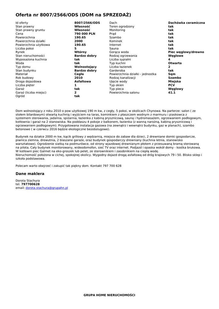Oferta nr 8007/2566/ODS (DOM na SPRZEDAŻ) Id oferty Stan prawny Stan prawny gruntu Cena Powierzchnia Powierzchnia działki Powierzchnia użytkowa Liczba pokoi Rynek Stan nieruchomości Wyposażona kuchnia Woda Typ domu Stan budynku Materiał Rok budowy Droga dojazdowa Liczba pięter Garaż Garaż (liczba miejsc) Ogród 8007/2566/ODS Własność Własność 790 000 PLN 190.65 2000 190.65 5 Wtórny Bardzo dobry tak tak Wolnostojący Bardzo dobry Cegła 2010 Asfaltowa 1 tak 2 tak Dach Teren ogrodzony Monitoring Prąd Szambo Kominek Internet Sauna Gorąca woda Rodzaj ogrzewania Liczba sypialni Typ kuchni Liczba łazienek Garderoba Powierzchnia działki - jednostka Rodzaj kanalizacji Ujęcie wody Typ okien Typ pieca Powierzchnia salonu Dachówka ceramiczna tak tak tak tak tak tak tak Piec węglowy/drewno Węglowe 4 Otwarta 2 tak Sqm Szambo Miejska PCV Węglowy 41.1 Dom wolnostojący z roku 2010 o pow użytkowej 190 m kw, z cegły, 5 pokoi, w okolicach Chynowa. Na parterze: salon ( ze stołem bilardowym) otwartą kuchnią i wyjściem na taras, kominkiem z płaszczem wodnym z marmuru i piaskowca z systemem sterowania, jadalnia, spiżarnia, łazienka z kabiną prysznicową, sauną i hydromasażem, ogrzewaniem podłogowym, kotłownia i garaż na 2 stanowiska. Na poddaszu 4 pokoje z balkonem, łazienka (z wanną narożną, kabiną prysznicową i ogrzewaniem podłogowym). Przygotowana instalacja gazowa (na zewnątrz i wewnątrz budynku, gaz w planach), szambo betonowe ( w czerwcu 2016 będzie ekologiczne bezobslugowe). Budynek na działce 2000 m kw, kącik grillowy z wędzarnią, miejsce do zabaw dla dzieci, 2 drewniane domki gospodarcze, piwnica ziemna, drewutnia, 2 blaszane garaże, oraz budynek gospodarczy drewniany (kuchnia letnia, stanowisko warsztatowe). Ogrodzenie siatką na podmurówce, od strony wjazdowej drewnianym płotem z przesuwaną bramą sterowaną na pilota. Cały budynek monitorowany, wideodomofon, sieć TV oraz internet. Podjazd i opaska wokół domy - kostka brukowa. W kotłowni piec Galmet na eko-groszek lub pelet, ze sterownikiem i zasobnikiem na ciepłą wodę. Nieruchomość położona w cichej, spokojnej okolicy. Wygodny dojazd drogą asfaltową od dróg krajowych 79 i 50. Blisko sklep i szkoła podstawowa. Polecam warto obejrzeć i zakupić tak piękny dom. Kontakt 797 700 628 Dane maklera Dorota Stachura tel. 797700628 email: [email protected] GRUPA HOME NIERUCHOMOŚCI Powered by TCPDF (www.tcpdf.org)