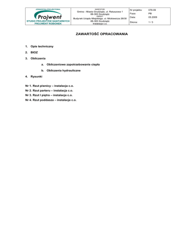 JEDNOSTKA PROJEKTOWA: INWESTOR: Gmina - Miasto Grudziądz, ul. Ratuszowa 1 86-300 Grudziądz OBIEKT: STUDIO PROJEKTÓW SANITARNYCH PROJWENT ROBIONEK Budynek Urzędu Miejskiego, ul. Mickiewicza 28/30 86-300 Grudziądz Instalacja c.o. ZAWARTOŚĆ OPRACOWANIA 1. Opis techniczny 2. BIOZ 3. Obliczenia a. Obliczeniowe zapotrzebowanie ciepła b. Obliczenia hydrauliczne 4. Rysunki Nr 1. Rzut piwnicy – instalacja c.o. Nr 2. Rzut parteru – instalacja c.o. Nr 3. Rzut I piętra – instalacja c.o. Nr 4. Rzut poddasza – instalacja c.o. Nr projektu: 076-09 Faza: PB Data: 05.2009 Strona: 1/3 JEDNOSTKA PROJEKTOWA: INWESTOR: Gmina - Miasto Grudziądz, ul. Ratuszowa 1 86-300 Grudziądz OBIEKT: STUDIO PROJEKTÓW SANITARNYCH PROJWENT ROBIONEK Budynek Urzędu Miejskiego, ul. Mickiewicza 28/30 86-300 Grudziądz Instalacja c.o. Nr projektu: 076-09 Faza: PB Data: 05.2009 Strona: 2/3 OPIS TECHNICZNY do projektu technicznego na budowę wewnętrznej instalacji c.o. w budynku Urzędu Miejskiego, ul. Mickiewicza 28/30 w Grudziądzu 1. Podstawa opracowania. - Zlecenie Inwestora – Gmina - Miasto Grudziądz ul. Ratuszowa 1 86-300 Grudziądz Uzgodnienia branżowe Uzgodnienia z Inwestorem Obowiązujące przepisy i normy II. Przedmiot i zakres opracowania. Przedmiotem opracowania jest projekt budowy instalacji c.o. III. Opis projektowanych rozwiązań. 1. Inwentaryzacja stanu istniejącego Na podstawie inwentaryzacji ustalono: W piwnicy znajduje się węzeł c.o. zasilany przez OPEC. Z węzła zasilana jest istniejąca instalacja c.o., która jest przestarzała i niewyregulowana. Powoduje to niedogrzanie znacznej części pomieszczeń. 2. Wewnętrzna instalacja c.o. Zaprojektowano instalację centralnego ogrzewania dwuprzewodową, z rozdziałem dolnym o parametrach obliczeniowych 75/60°C przygotowaną w istniejącym węźle cieplnym. Nośnikiem energii cieplnej będzie woda o parametrach zmiennych wg dostawcy ciepła – OPEC Grudziądz. Zapotrzebowanie ciepła dla pomieszczeń zostało obliczone na podstawie norm: - Temperatury zewnętrzne wg PN-82/B-02403, - Temperatury ogrzewanych pomieszczeń w budynku wg PN-82/B-02402, - Ochrona cieplna budynków PN-91/B-02020, - Obliczeniowe zapotrzebowanie ciepła pom. o kubaturze do 600 m3 wg PN-B-03406. - Opór cieplny i współczynnik przenikania ciepła PN-EN ISO 6946 Grzejniki W projekcie zastosowano grzejniki stalowe, płytowe 22KV/500, 33KV/500, 33KV/600. Grzejniki należy montować pod parapetami okiennymi i na ścianach bocznych. Grzejniki pod parapetami zostaną zainstalowane na specjalnych zestawach montażowych dostarczonych łącznie z grzejnikami. Wielkości grzejników zostały opisane w części graficznej projektu. Przewody Przewody instalacji centralnego ogrzewania na parterze, I piętrze i poddaszu wykonać z rur miedzianych odpowiadających normie PN-83/H-74200 bądź innych pod warunkiem zachowania wskazanych w projekcie parametrów technicznych. W pomieszczeniach piwnicznych przewody wykonać z rur stalowych oraz prowadzić je pod stropem. Spadki gałązek minimum 2%. Przy przejściach przewodów przez ściany należy montować tuleje ochronne. Tuleje ochronne muszą wystawać z każdej strony ściany i stropu po 2 cm, oraz należy je uszczelnić pianką poliuretanową lub kitem trwałoplastycznym. Kierunki spadków przewodów poziomych wykonać do najniższego miejsca, gdzie będą zainstalowane zawory spustowe. Na kondygnacji parteru, I piętra i poddasza podejścia do grzejników wykonać w bruzdach ściennych. Piony obudować obudową rozbieralną. W piwnicy podejścia do pionów i grzejników wykonać na ścianach. Odpowietrzenie Grzejniki posiadają wbudowany odpowietrznik, poprzez który nastąpi odpowietrzenie instalacji podczas jej rozruchu. Piony instalacji zostaną odpowietrzone w najwyższym punkcie poprzez zainstalowanie automatycznych odpowietrzników. JEDNOSTKA PROJEKTOWA: INWESTOR: Gmina - Miasto Grudziądz, ul. Ratuszowa 1 86-300 Grudziądz OBIEKT: STUDIO PROJEKTÓW SANITARNYCH PROJWENT ROBIONEK Budynek Urzędu Miejskiego, ul. Mickiewicza 28/30 86-300 Grudziądz Instalacja c.o. Nr projektu: 076-09 Faza: PB Data: 05.2009 Strona: 3/3 Przed zaworem odpowietrzającym należy zainstalować mufowe zawory kulowe. Odwodnienie Przewody poziome odwadniać należy w najniższym punkcie przewodów. Grzejniki zainstalowane poniżej przewodów zasilających będą odwadniane poprzez zainstalowane korki spustowe w tylnej części grzejnika. Izolacje Główne przewody rozprowadzające należy izolować termicznie izolacją rozbieralną. Podejścia do odbiorników bez izolacji. Przyjęto grubości izolacji wg PN-B-02421 z 2000 roku. Grubości izolacji należy przyjmować wg średnic przewodów: Średnica nominalna /mm/ DN15 DN20 DN 25 DN 32 DN 40 DN 50 DN 65 DN 80 Min. grubość izolacji /mm/ 20 20 20 30 30 40 40 40 Przed wykonaniem izolacji rury należy oczyścić z brudu i rdzy oraz zabezpieczyć przed korozją przez dwukrotne pomalowanie farbą antykorozyjną, zgodnie z instrukcją. Podstawowe dane techniczne izolacji: - wsp. przewodności cieplnej wg DIN 52613: 0,04 W/m*K przy średniej temp. 40°C, - odporność na temperaturę: +135°C, - klasyfikacja p.poż. B2 wg DIN 4102. - aprobata techniczna C.O.B.R.T.I. „INSTAL” Warszawa, nr AT/97-01-0072. Proponuje się izolację z pianki poliuretanowej. Przewody prowadzone w bruzdach ściennych układać w izolacji dla zapewnienia kompensacji przewodów. Regulacja instalacji Regulacja instalacji c.o. wg technologii węzła cieplnego oraz poprzez zawory regulacyjne pod pionami. Regulację instalacji centralnego ogrzewania w obrębie pomieszczeń zaprojektowano za pomocą nastaw wstępnych na zaworach grzejnikowych. Wielkość nastaw na zaworach grzejnikowych pokazano w części graficznej i obliczeniowej projektu. Próby i płukania instalacji Całą instalację centralnego ogrzewania należy poddać próbie ciśnieniowej na zimno na ciśnienie 0.4 MPa, oraz próbie na gorąco przy max. parametrach ro