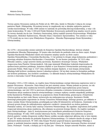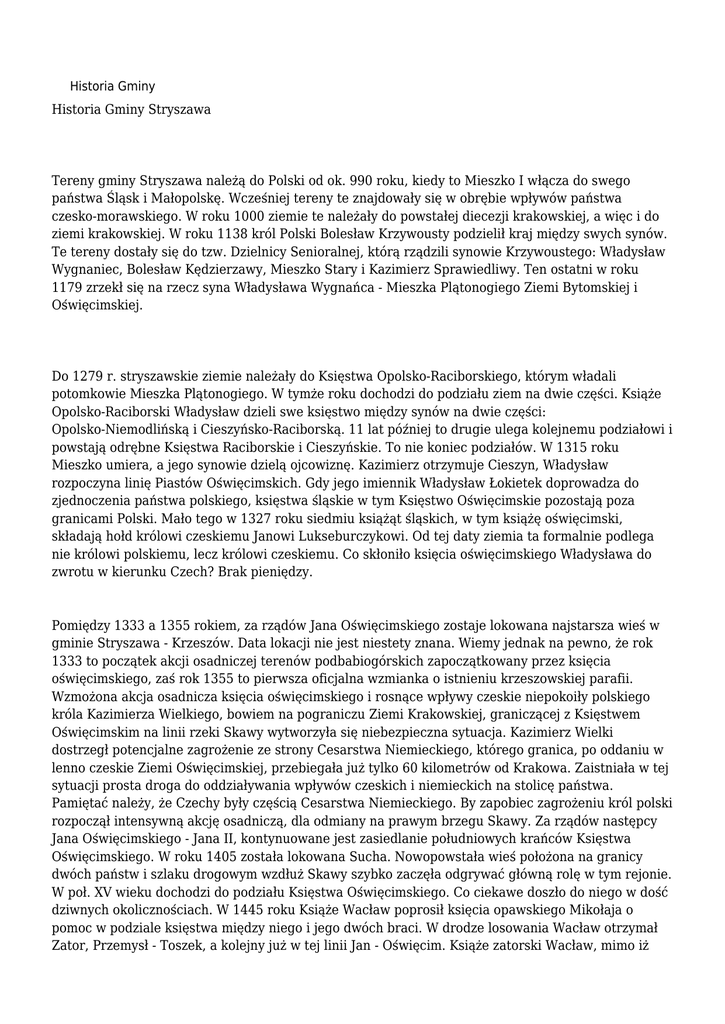 Historia Gminy Historia Gminy Stryszawa Tereny gminy Stryszawa należą do Polski od ok. 990 roku, kiedy to Mieszko I włącza do swego państwa Śląsk i Małopolskę. Wcześniej tereny te znajdowały się w obrębie wpływów państwa czesko-morawskiego. W roku 1000 ziemie te należały do powstałej diecezji krakowskiej, a więc i do ziemi krakowskiej. W roku 1138 król Polski Bolesław Krzywousty podzielił kraj między swych synów. Te tereny dostały się do tzw. Dzielnicy Senioralnej, którą rządzili synowie Krzywoustego: Władysław Wygnaniec, Bolesław Kędzierzawy, Mieszko Stary i Kazimierz Sprawiedliwy. Ten ostatni w roku 1179 zrzekł się na rzecz syna Władysława Wygnańca - Mieszka Plątonogiego Ziemi Bytomskiej i Oświęcimskiej. Do 1279 r. stryszawskie ziemie należały do Księstwa Opolsko-Raciborskiego, którym władali potomkowie Mieszka Plątonogiego. W tymże roku dochodzi do podziału ziem na dwie części. Książe Opolsko-Raciborski Władysław dzieli swe księstwo między synów na dwie części: Opolsko-Niemodlińską i Cieszyńsko-Raciborską. 11 lat później to drugie ulega kolejnemu podziałowi i powstają odrębne Księstwa Raciborskie i Cieszyńskie. To nie koniec podziałów. W 1315 roku Mieszko umiera, a jego synowie dzielą ojcowiznę. Kazimierz otrzymuje Cieszyn, Władysław rozpoczyna linię Piastów Oświęcimskich. Gdy jego imiennik Władysław Łokietek doprowadza do zjednoczenia państwa polskiego, księstwa śląskie w tym Księstwo Oświęcimskie pozostają poza granicami Polski. Mało tego w 1327 roku siedmiu książąt śląskich, w tym książę oświęcimski, składają hołd królowi czeskiemu Janowi Lukseburczykowi. Od tej daty ziemia ta formalnie podlega nie królowi polskiemu, lecz królowi czeskiemu. Co skłoniło księcia oświęcimskiego Władysława do zwrotu w kierunku Czech? Brak pieniędzy. Pomiędzy 1333 a 1355 rokiem, za rządów Jana Oświęcimskiego zostaje lokowana najstarsza wieś w gminie Stryszawa - Krzeszów. Data lokacji nie jest niestety znana. Wiemy jednak na pewno, że rok 1333 to początek akcji osadniczej terenów podbabiogórskich zapoczątkowany przez księcia oświęcimskiego, zaś rok 1355 to pierwsza oficjalna wzmianka o istnieniu krzeszowskiej parafii. Wzmożona akcja osadnicza księcia oświęcimskiego i rosnące wpływy czeskie niepokoiły polskiego króla Kazimierza Wielkiego, bowiem na pograniczu Ziemi Krakowskiej, graniczącej z Księstwem Oświęcimskim na linii rzeki Skawy wytworzyła się niebezpieczna sytuacja. Kazimierz Wielki dostrzegł potencjalne zagrożenie ze strony Cesarstwa Niemieckiego, którego granica, po oddaniu w lenno czeskie Ziemi Oświęcimskiej, przebiegała już tylko 60 kilometrów od Krakowa. Zaistniała w tej sytuacji prosta droga do oddziaływania wpływów czeskich i niemieckich na stolicę państwa. Pamiętać należy, że Czechy były częścią Cesarstwa Niemieckiego. By zapobiec zagrożeniu król polski rozpoczął intensywną akcję osadniczą, dla odmiany na prawym brzegu Skawy. Za rządów następcy Jana Oświęcimskiego - Jana II, kontynuowane jest zasiedlanie południowych krańców Księstwa Oświęcimskiego. W roku 1405 została lokowana Sucha. Nowopowstała wieś położona na granicy dwóch państw i szlaku drogowym wzdłuż Skawy szybko zaczęła odgrywać główną rolę w tym rejonie. W poł. XV wieku dochodzi do podziału Księstwa Oświęcimskiego. Co ciekawe doszło do niego w dość dziwnych okolicznościach. W 1445 roku Książe Wacław poprosił księcia opawskiego Mikołaja o pomoc w podziale księstwa między niego i jego dwóch braci. W drodze losowania Wacław otrzymał Zator, Przemysł - Toszek, a kolejny już w tej linii Jan - Oświęcim. Książe zatorski Wacław, mimo iż nadal był lennikiem czeskim, stopniowo zbliżał się do dworu polskiego. W 1447 roku był obecny w Krakowie na koronacji Kazimierza Jagiellończyka, a w 1453 roku łagodził spór pomiędzy swoim bratem, a polskim monarchą. W końcu w 1456 roku Wacław złożył hołd polskiemu królowi i Księstwo Zatorskie zostało polskim lennem. Powrót tych ziem do Polski po ponad 300 latach był już nieunikniony i miał nastąpić za rządów kolejnego zatorskiego księcia. Rok, w którym Księstwo Zatorskie zostało polskim lennem był o tyle ciekawy, że wówczas do Polski włączono Księstwo Oświęcimskie. Gdy spojrzymy na mapę z tego okresu to zauważymy, że Księstwo Zatorskie stało się enklawą na terytorium Polski. Już wówczas wiadomo było, że włączenie tych ziem do Polski jest tylko kwestią czasu. Stać się to miało za rządów kolejnego zatorskiego księcia. W II poł. XV w. zostaje założona kolejna wieś, która dziś wchodzi w skład gminy Stryszawa - Hucisko, którego przynależność kształtuje się nieco inaczej niż powstałego wiek wcześniej Krzeszowa, czy założonej w tym samym czasie Stryszawy. Hucisko od początku związane było z dobrami żywieckimi, te zaś wchodziły w skład Księstwa Oświęcimskiego. Granica między obydwoma księstwami na górzystym terenie przebiegała wododziałem Soły i Skawy, tak więc Hucisko w przeciwieństwie do Krzeszowa nie leżało w Księstwie Zatorskim i było pierwszą wsią na tych terenach, która znalazła się w Polsce. W 1465 roku umiera Wacław, a jego księstwo Zatorskie przechodzi we władanie czterech jego synów. W 1474 księstwo zostaje podzielone na dwie części, a w każdej władzę sprawuje para braci. W tym okresie (1480) pojawiają się pierwsze wzmianki o kolejnej nowej wsi - Stryszawie. To trzecia i ostatnia wieś w naszej gminie, która została założona w okresie kiedy te tereny nie wchodziły w skład Polski. Do 1493 umierają wszyscy bracia Jana, a on w końcu zostaje samodzielnym władcą ziemi zatorskiej. Rok później sprzedaje on swoje królestwo królowi polskiemu Janowi Olbrachtowi. Po ponad trzystu latach ziemie te wracają do Polski. W XVI w. na pierwszym planie nie będą ju