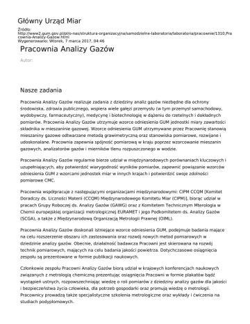 Główny Urząd Miar Źródło: http://www2.gum.gov.pl/pl/o-nas/struktura-organizacyjna/samodzielne-laboratoria/laboratoria/pracownie/1310,Pra cownia-Analizy-Gazow.html Wygenerowano: Wtorek, 7 marca 2017, 04:46 Pracownia Analizy Gazów Autor: Nasze zadania Pracownia Analizy Gazów realizuje zadania z dziedziny analiz gazów niezbędne dla ochrony środowiska, zdrowia publicznego, wspiera wiele gałęzi przemysłu (w tym przemysł samochodowy, wydobywczy, farmaceutyczny), medycynę i biotechnologię w dążeniu do rzetelnych i dokładnych pomiarów. Pracownia Analizy Gazów utrzymuje wzorce odniesienia GUM jednostki miary zawartości składnika w mieszaninie gazowej. Wzorce odniesienia GUM utrzymywane przez Pracownię stanowią mieszaniny gazowe odtwarzane metodą grawimetryczną oraz stanowiska pomiarowe, rozwijane i udoskonalane. Pracownia zapewnia spójność pomiarową w kraju poprzez wzorcowanie mieszanin gazowych, analizatorów gazów i mierników tlenu rozpuszczonego w wodzie. Pracownia Analizy Gazów regularnie bierze udział w międzynarodowych porównaniach kluczowych i uzupełniających, aby potwierdzić wiarygodność wyników pomiarów, zapewnić powiązanie wzorców odniesienia GUM z wzorcami jednostek miar w innych krajach i potwierdzić swoje zdolności pomiarowe CMC. Pracownia współpracuje z następującymi organizacjami międzynarodowymi: CIPM CCQM [Komitet Doradczy ds. Liczności Materii (CCQM) Międzynarodowego Komitetu Miar (CIPM)], biorąc udział w pracach Grupy Roboczej ds. Analizy Gazów (GAWG) oraz z Komitetem Technicznym Mterologia w Chemii europejskiej organizacji metrologicznej EURAMET i jego Podkomitetem ds. Analizy Gazów (SCGA), a także z Międzynarodową Organizacją Metrologii Prawnej (OIML). Pracownia Analizy Gazów doskonali istniejące wzorce odniesienia GUM, podejmuje badania mające na celu rozszerzenie obszaru ich zastosowania oraz rozwój nowych metod pomiarowych w dziedzinie analizy gazów. Obecnie, działalność badawcza Pracowni jest skierowana na rozwój technik pomiarowych, mających na celu badania jakości powietrza. Dotychczasowe osiągnięcia zespołu są prezentowane w formie publikacji naukowych. Członkowie zespołu Pracowni Analizy Gazów biorą udział w krajowych konferencjach naukowych związanych z metrologią chemiczną prezentując osiągnięcia Pracowni w formie plakatów bądź wystąpień ustnych, rozpowszechniając wiedzę o roli pomiarów z dziedziny analizy gazów dla jakości i bezpieczeństwa życia człowieka, dla potrzeb gospodarki oraz promują wiedzę o metrologii. Pracownicy prowadzą także specjalistyczne szkolenia metrologiczne oraz wykłady i ćwiczenia na studiach podyplomowych. Kontakt do pracowni
