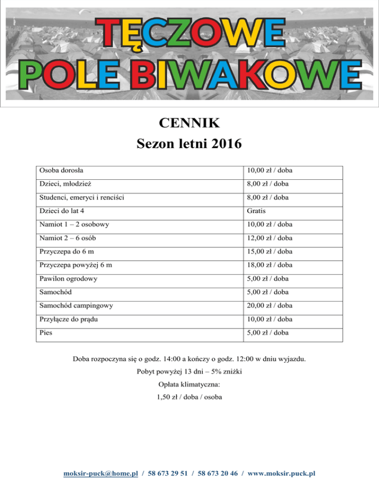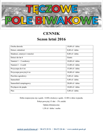 CENNIK Sezon letni 2016 Osoba dorosła 10,00 zł / doba Dzieci, młodzież 8,00 zł / doba Studenci, emeryci i renciści 8,00 zł / doba Dzieci do lat 4 Gratis Namiot 1 – 2 osobowy 10,00 zł / doba Namiot 2 – 6 osób 12,00 zł / doba Przyczepa do 6 m 15,00 zł / doba Przyczepa powyżej 6 m 18,00 zł / doba Pawilon ogrodowy 5,00 zł / doba Samochód 5,00 zł / doba Samochód campingowy 20,00 zł / doba Przyłącze do prądu 10,00 zł / doba Pies 5,00 zł / doba Doba rozpoczyna się o godz. 14:00 a kończy o godz. 12:00 w dniu wyjazdu. Pobyt powyżej 13 dni – 5% zniżki Opłata klimatyczna: 1,50 zł / doba / osoba [email protected] / 58 673 29 51 / 58 673 20 46 / www.moksir.puck.pl