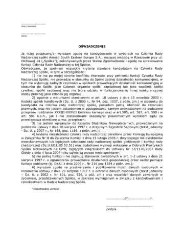 ………………………… imię i nazwisko ………………………… adres OŚWIADCZENIE Ja niżej podpisany/a* wyrażam zgodę na kandydowanie w wyborach na Członka Rady Nadzorczej spółki Asseco South Eastern Europe S.A., mającej siedzibę w Rzeszowie przy ul. Olchowej 14 („Spółka”), dokonywanych przez Walne Zgromadzenie i zgodę na sprawowanie funkcji Członka Rady Nadzorczej w tej Spółce. Oświadczam, że spełniam wszystkie kryteria stawiane kandydatom na Członka Rady Nadzorczej Spółki, w tym w szczególności: 1) nie ma po mojej stronie konfliktu interesów przy pełnieniu funkcji Członka Rady Nadzorczej Spółki; nie prowadzę w stosunku do Spółki żadnej działalności konkurencyjnej, w tym nie wykonuję żadnych czynności w spółkach prowadzących działalność konkurencyjną w stosunku do Spółki jako Członek organów spółki kapitałowej lub jako wspólnik spółki cywilnej, spółki osobowej oraz nie biorę udziału w funkcjonowaniu innej konkurencyjnej osoby prawnej jako członek jej organu; 2) zgodnie z warunkami określonymi w art. 18 ustawy z dnia 15 września 2000 r. Kodeks spółek handlowych (Dz. U. z 2000 r., Nr 94, poz. 1037, z późn. zm.) w stosunku do kandydata na członka rady nadzorczej spółki, posiadam pełną zdolność do czynności prawnych, oraz nie jestem oskarżonym w postępowaniu karnym prowadzonym na podstawie przepisów rozdziałów XXXIII-XXXVII Kodeksu karnego oraz w art.585, art. 587, art. 590 i w art. 591 k.s.h., jak i nie zostałem/am* skazany/a* prawomocnym wyrokiem sądu za przestępstwa określone w ww. przepisach; 3) nie jestem wpisany/a* do Rejestru Dłużników Niewypłacalnych, prowadzonym na podstawie ustawy z dnia 20 sierpnia 1997 r. o Krajowym Rejestrze Sądowym (tekst jednolity - Dz. U. z 2007 r., Nr 168, poz. 1186, z późn. zm.); 4) kryteria niezależności członka rady nadzorczej określone przez Komisję Europejską w Załączniku Nr II do Zalecenia Komisji z dnia 15 lutego 2005 r. dotyczącego roli dyrektorów niewykonawczych lub będących członkami rady nadzorczej spółek giełdowych i komisji rady (nadzorczej) (Dz.U.UE.L.05.52.51) oraz dodatkowe wymogi wskazane w Dobrych Praktykach Spółek Notowanych na GPW, będących załącznikiem do Uchwały Nr 12/1170/2007 Rady Giełdy z dnia 4 lipca 2007 roku są/nie są przeze mnie spełniane*; 5) nie pełnię funkcji i nie zajmuję stanowisk określonych w art. 1-2 ustawy z dnia 21 sierpnia 1997 r. o ograniczeniu prowadzenia działalności gospodarczej przez osoby pełniące funkcje publiczne (tj. Dz.U. z dnia 2006 r., Nr 216 poz.1584 z późn. zm.); 6) wyrażam zgodę na przetwarzanie i publikowanie moich danych osobowych w rozumieniu ustawy z dnia 29 sierpnia 1997 r. o ochronie danych osobowych (tekst jednolity – Dz. U. z 2002 r. Nr 101, poz. 926, z póź. zm.) oraz wszelkich danych zawartych w życiorysie, przedstawionych Spółce, w zakresie wymaganym w związku z kandydowaniem i członkostwem w Radzie Nadzorczej Spółki. *niepotrzebne skreślić …………………,dn……………………..r. …………………….………………………... podpis