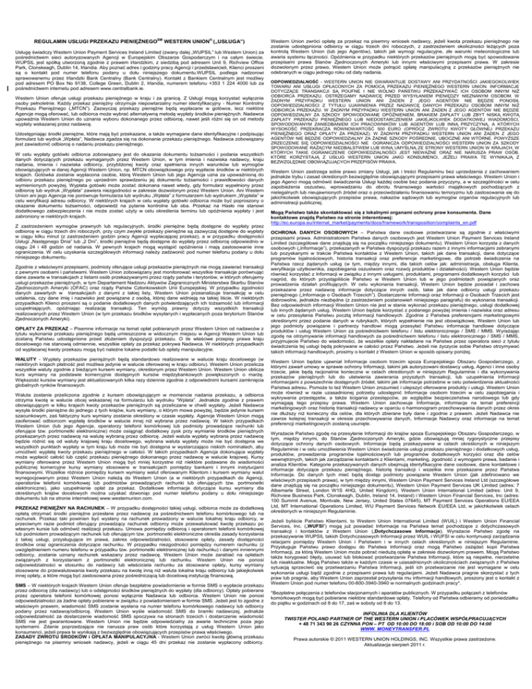 REGULAMIN USŁUGI PRZEKAZU PIENIĘśNEGOSM WESTERN UNION® („USŁUGA”) Usługę świadczy Western Union Payment Services Ireland Limited (zwany dalej „WUPSIL” lub Western Union) za pośrednictwem sieci autoryzowanych Agencji w Europejskim Obszarze Gospodarczym i na całym świecie. WUPSIL jest spółką utworzoną zgodnie z prawem irlandzkim, z siedzibą pod adresem Unit 9, Richview Office Park, Clonskeagh, Dublin 14, Irlandia. Aby poznać adres i godziny pracy Agencji i przedstawicieli, Klienci proszeni są o kontakt pod numer telefonu podany u dołu niniejszego dokumentu.WUPSIL podlega nadzorowi sprawowanemu przez Irlandzki Bank Centralny (Bank Centralny). Kontakt z Bankiem Centralnym jest moŜliwy pod adresem PO Box No 9138, College Green, Dublin 2, Irlandia, numerem telefonu +353 1 224 4000 lub za pośrednictwem internetu pod adresem www.centralbank.ie. Western Union oferuje usługi przekazu pienięŜnego w kraju i za granicą. Z Usługi mogą korzystać wyłącznie osoby pełnoletnie. KaŜdy przekaz pienięŜny otrzymuje niepowtarzalny numer identyfikacyjny - Numer Kontrolny Przekazu PienięŜnego („MTCN”). Zazwyczaj przekazy pienięŜne będą wypłacane w gotówce, lecz niektóre Agencje mogą oferować, lub odbiorca moŜe wybrać alternatywną metodę wypłaty środków pienięŜnych. Nadawca upowaŜnia Western Union do uznania wyboru dokonanego przez odbiorcę, nawet jeśli róŜni się on od metody wypłaty wskazanej przez nadawcę. Udostępniając środki pienięŜne, które mają być przekazane, a takŜe wymagane dane identyfikacyjne i podpisując formularz lub wydruk „Wpłata”, Nadawca zgadza się na dokonanie przekazu pienięŜnego. Nadawca zobowiązany jest zawiadomić odbiorcę o nadaniu przekazu pienięŜnego. W celu wypłaty gotówki odbiorca zobowiązany jest do okazania dokumentu toŜsamości i podania wszystkich danych dotyczących przekazu wymaganych przez Western Union, w tym imienia i nazwiska nadawcy, kraju nadania, imienia i nazwiska odbiorcy, przybliŜonej kwoty oraz spełnienia innych warunków lub wymogów obowiązujących w danej Agencji Western Union, np. MTCN obowiązkowego przy wypłacie środków w niektórych krajach. Gotówka zostanie wypłacona osobie, którą Western Union lub jego Agencja uzna za upowaŜnioną do odbioru przekazu pienięŜnego po uprzednim sprawdzeniu jej dokumentu toŜsamości i prawidłowości danych wymienionych powyŜej. Wypłata gotówki moŜe zostać dokonana nawet wtedy, gdy formularz wypełniony przez odbiorcę lub wydruk „Wypłata” zawiera niezgodności w zakresie dozwolonym przez Western Union. Ani Western Union ani jego Agencja nie porównuje formularza lub wydruku „Wpłata” z formularzem lub wydrukiem „Wypłata” w celu weryfikacji adresu odbiorcy. W niektórych krajach w celu wypłaty gotówki odbiorca moŜe być poproszony o okazanie dokumentu toŜsamości, odpowiedź na pytanie kontrolne lub oba. Przekaz na Hasło nie stanowi dodatkowego zabezpieczenia i nie moŜe zostać uŜyty w celu określenia terminu lub opóźnienia wypłaty i jest zabroniony w niektórych krajach. Z zastrzeŜeniem wymogów prawnych lub regulacyjnych, środki pienięŜne będą dostępne do wypłaty przez odbiorcę w ciągu trzech dni roboczych, przy czym zwykłe przekazy pienięŜne są zazwyczaj dostępne do wypłaty w ciągu kilku minut (z zastrzeŜeniem godzin pracy Agencji wypłacającej przekaz), a w przypadku dostępności Usługi „Następnego Dnia” lub „2 Dni”, środki pienięŜne będą dostępne do wypłaty przez odbiorcę odpowiednio w ciągu 24 i 48 godzin od nadania. W pewnych krajach mogą wystąpić opóźnienia i mają zastosowanie inne ograniczenia. W celu uzyskania szczegółowych informacji naleŜy zadzwonić pod numer telefonu podany u dołu niniejszego dokumentu. Zgodnie z właściwymi przepisami, podmioty oferujące usługi przekazów pienięŜnych nie mogą zawierać transakcji z pewnymi osobami i państwami. Western Union zobowiązany jest monitorować wszystkie transakcje porównując dane zawarte w transakcjach z listami osób przekazywanymi przez rządy państw i terytoriów, w których oferujemy usługi przekazów pienięŜnych, w tym Departament Nadzoru Aktywów Zagranicznych Ministerstwa Skarbu Stanów Zjednoczonych Ameryki (OFAC) oraz rządy Państw Członkowskich Unii Europejskiej. W przypadku zgodności danych zawartych w transakcjach z danymi z takiej listy, Western Union przeanalizuje transakcję w celu ustalenia, czy dane imię i nazwisko jest powiązane z osobą, której dane widnieją na takiej liście. W niektórych przypadkach Klienci proszeni są o podanie dodatkowych danych potwierdzających ich toŜsamość lub informacji uzupełniających, opóźniając realizację transakcji. Ten wymóg prawny dotyczy wszystkich transakcji realizowanych przez Western Union (w tym przekazu środków wysyłanych i wypłacanych poza terytorium Stanów Zjednoczonych Ameryki). OPŁATY ZA PRZEKAZ – Pisemne informacje na temat opłat pobieranych przez Western Union od nadawców z tytułu wykonania przekazu pienięŜnego będą umieszczone w widocznym miejscu w Agencji Western Union lub zostaną Państwu udostępnione przed złoŜeniem dyspozycji przekazu. O ile właściwe przepisy prawa kraju docelowego nie stanowią odmiennie, wszystkie opłaty za przekaz pokrywa Nadawca. W niektórych przypadkach od wypłacanej kwoty przekazu mogą być naleŜne lokalne podatki lub opłaty manipulacyjne. WALUTY - Wypłaty przekazów pienięŜnych będą standardowo realizowane w walucie kraju docelowego (w niektórych krajach płatność jest moŜliwa jedynie w walucie oferowanej w kraju odbioru). Western Union przelicza wszystkie waluty zgodnie z bieŜącym kursem wymiany, określonym przez Western Union. Western Union oblicza kurs wymiany na podstawie komercyjnie dostępnych kursów międzybankowych powiększonych o marŜę. Większość kursów wymiany jest aktualizowanych kilka razy dziennie zgodni
