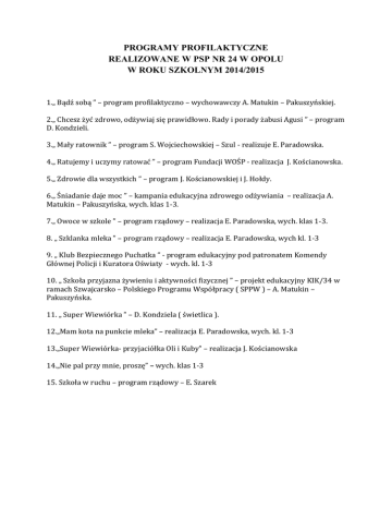 PROGRAMY PROFILAKTYCZNE REALIZOWANE W PSP NR 24 W OPOLU W ROKU SZKOLNYM 2014/2015 1.„ Bądź sobą ” – program profilaktyczno – wychowawczy A. Matukin – Pakuszyńskiej. 2.„ Chcesz żyć zdrowo, odżywiaj się prawidłowo. Rady i porady żabusi Agusi ” – program D. Kondzieli. 3.„ Mały ratownik ” – program S. Wojciechowskiej – Szul - realizuje E. Paradowska. 4.„ Ratujemy i uczymy ratować ” – program Fundacji WOŚP - realizacja J. Kościanowska. 5.„ Zdrowie dla wszystkich ” – program J. Kościanowskiej i J. Hołdy. 6.„ Śniadanie daje moc ” – kampania edukacyjna zdrowego odżywiania – realizacja A. Matukin – Pakuszyńska, wych. klas 1-3. 7.„ Owoce w szkole ” – program rządowy – realizacja E. Paradowska, wych. klas 1-3. 8. „ Szklanka mleka ” – program rządowy – realizacja E. Paradowska, wych kl. 1-3 9. „ Klub Bezpiecznego Puchatka ” - program edukacyjny pod patronatem Komendy Głównej Policji i Kuratora Oświaty - wych. kl. 1-3 10. „ Szkoła przyjazna żywieniu i aktywności fizycznej ” – projekt edukacyjny KIK/34 w ramach Szwajcarsko – Polskiego Programu Współpracy ( SPPW ) – A. Matukin – Pakuszyńska. 11. „ Super Wiewiórka ” – D. Kondziela ( świetlica ). 12.„Mam kota na punkcie mleka” – realizacja E. Paradowska, wych. kl. 1-3 13.„Super Wiewiórka- przyjaciółka Oli i Kuby” – realizacja J. Kościanowska 14.„Nie pal przy mnie, proszę” – wych. klas 1-3 15. Szkoła w ruchu – program rządowy – E. Szarek