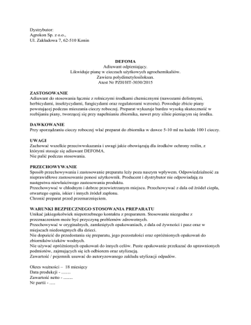 Dystrybutor: Agrokon Sp. z o.o., Ul. Zakładowa 7, 62-510 Konin DEFOMA Adiuwant odpieniający. Likwiduje pianę w cieczach użytkowych agrochemikaliów. Zawiera polydimetylosiloksan. Atest Nr PZH/HT-3030/2015 ZASTOSOWANIE Adiuwant do stosowania łącznie z rolniczymi środkami chemicznymi (nawozami dolistnymi, herbicydami, insektycydami, fungicydami oraz regulatorami wzrostu). Powoduje zbicie piany powstającej podczas mieszania cieczy roboczej. Preparat wykazuje bardzo wysoką skuteczność w rozbijaniu piany, tworzącej się przy napełnianiu zbiornika, nawet przy silnie pieniącym się środku. DAWKOWANIE Przy sporządzaniu cieczy roboczej wlać preparat do zbiornika w dawce 5-10 ml na każde 100 l cieczy. UWAGI Zachować wszelkie przeciwwskazania i uwagi jakie obowiązują dla środków ochrony roślin, z którymi stosuje się adiuwant DEFOMA. Nie palić podczas stosowania. PRZECHOWYWANIE Sposób przechowywania i zastosowanie preparatu leży poza naszym wpływem. Odpowiedzialność za nieprawidłowe zastosowanie ponosi użytkownik. Producent i dystrybutor nie odpowiadają za następstwa niewłaściwego zastosowania produktu. Przechowywać w chłodnym i dobrze przewietrzanym miejscu. Przechowywać z dala od źródeł ciepła, otwartego ognia, iskier i innych źródeł zapłonu. Chronić preparat przed przemarznięciem. WARUNKI BEZPIECZNEGO STOSOWANIA PREPARATU Unikać jakiegokolwiek niepotrzebnego kontaktu z preparatem. Stosowanie niezgodne z przeznaczeniem może być przyczyną problemów zdrowotnych. Przechowywać w oryginalnych, zamkniętych opakowaniach, z dala od żywności i pasz oraz w miejscach niedostępnych dla dzieci. Nie dopuścić do przedostania się preparatu, jego pozostałości oraz opróżnionych opakowań do zbiorników/cieków wodnych. Nie używać opróżnionych opakowań do innych celów. Puste opakowanie przekazać do uprawnionych podmiotów, zajmujących się ich odbiorem oraz utylizacją. Zawartość / pojemnik usuwać do autoryzowanego zakładu utylizacji odpadów. Okres ważności – 18 miesięcy Data produkcji - ........ Zawartość netto - ........ Nr partii - .....