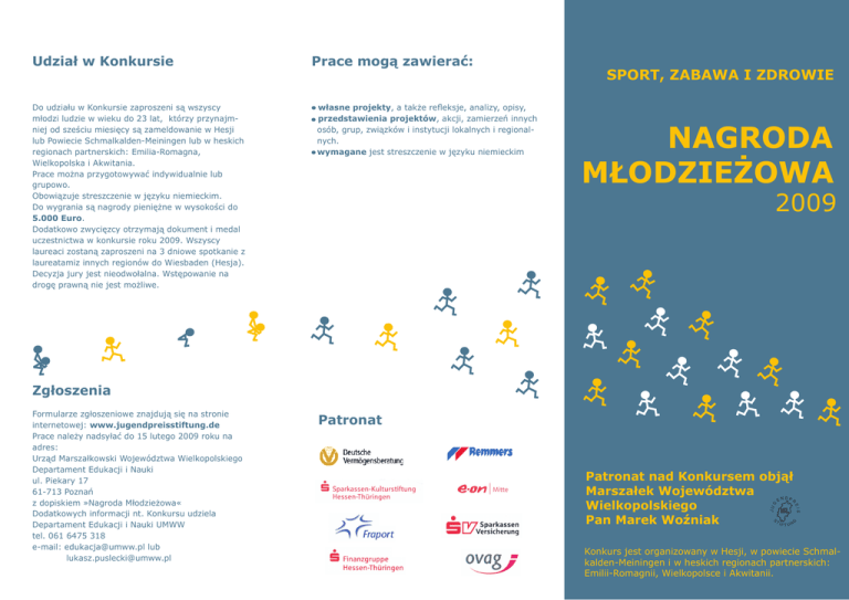 Udział w Konkursie Prace mogą zawierać: Do udziału w Konkursie zaproszeni są wszyscy młodzi ludzie w wieku do 23 lat, którzy przynajmniej od sześciu miesięcy są zameldowanie w Hesji lub Powiecie Schmalkalden-Meiningen lub w heskich regionach partnerskich: Emilia-Romagna, Wielkopolska i Akwitania. Prace można przygotowywać indywidualnie lub grupowo. Obowiązuje streszczenie w języku niemieckim. Do wygrania są nagrody pieniężne w wysokości do 5.000 Euro. Dodatkowo zwycięzcy otrzymają dokument i medal uczestnictwa w konkursie roku 2009. Wszyscy laureaci zostaną zaproszeni na 3 dniowe spotkanie z laureatamiz innych regionów do Wiesbaden (Hesja). Decyzja jury jest nieodwołalna. Wstępowanie na drogę prawną nie jest możliwe. - własne projekty, a także refleksje, analizy, opisy, - przedstawienia projektów, akcji, zamierzeń innych osób, grup, związków i instytucji lokalnych i regionalnych. wymagane jest streszczenie w języku niemieckim SPORT, ZABAWA I ZDROWIE NAGRODA MŁODZIEŻOWA 2009 Zgłoszenia Patronat EIS TI DP G EN R JUG Patronat nad Konkursem objął Marszałek Województwa Wielkopolskiego Pan Marek Woźniak S Formularze zgłoszeniowe znajdują się na stronie internetowej: www.jugendpreisstiftung.de Prace należy nadsyłać do 15 lutego 2009 roku na adres: Urząd Marszałkowski Województwa Wielkopolskiego Departament Edukacji i Nauki ul. Piekary 17 61-713 Poznań z dopiskiem »Nagroda Młodzieżowa« Dodatkowych informacji nt. Konkursu udziela Departament Edukacji i Nauki UMWW tel. 061 6475 318 e-mail: [email protected] lub [email protected] FTUN Konkurs jest organizowany w Hesji, w powiecie Schmalkalden-Meiningen i w heskich regionach partnerskich: Emilii-Romagnii, Wielkopolsce i Akwitanii. Jakie znaczenie ma sport i zabawa - teraz i w przyszłości? Fascynacja sportem i zabawą odzwierciedla społeczeństwo Hesji i jej regionów partnerskich w Europie. Z upływem czasu i biegiem zdarzeń historycznych, sport i zabawa zyskały na znaczeniu. Czym obecnie jest sport i zabawa dla dzieci i młodzieży, a czym będzie jutro? Czy zainteresowanie nimi, jest kluczem do odkrycia swojej wewnętrznej siły? Co uczyniły miejskie władze dla wspierania fascynacji sportem i zabawą? Czy wśród młodzieży, duch olimpijski nie pozostaje tylko w cieniu, nie został zapomniany? »Rodzice biegają, dzieci pozostają w przykucku«. Lekarze i specjaliści do spraw sportu biją na alarm: Nasze dzieci i młodzież będą chorować. Brak fizycznej aktywności i potrzebnej dawki ruchu, może stać się przyczyną wielu problemów zdrowotnych wśród młodych ludzi. Poza tym brakuje odpowiednich naturalnych warunków, do tego, aby móc rozładować swoją potrzebę ruchu i aby zredukować agresję. Czy ta perspektywa z punktu widzenia młodzieży jest prawidłowa? Jakie miejsca, obszary do uprawiania sportu jako hobby lub zawodowo, ma młodzież obecnie do dyspozycji? Jaki rodzaj sportu faworyzuje? Jak wygląda kartografia twojej miejscowości pod względem uprawianych sportów? Czy miejskie władze i związki propagują sport? Jakie zamierzenia, projekty, kroki dla poprawy lub utrzymania swojej kondycji fizycznej i zachowania dobrego zdrowia, przedsięwzięła też młodzież? Jakie pomysły wprowadziła już życie, by móc ulepszyć obszar, na którym żyje i się rozwija. Temat może ukazywać różne problemy. Pomocne w tym mogą być następujące aspekty: Zamierzenia: Próbujemy ukazać, w jaki sposób można nakłonić do aktywnego rozwoju wszelkich umiejętności i zdolności sportowych, aktywnie wprowadzić je w życie i przekazywać dalej. Opis sposobów, które zachęcą do uprawiania sportu. Imprezy okazjonalne, które można by stworzyć dla dzieci i młodzieży, mieszkających w danym regionie, które byłyby specjalną okazją, przeżyciem jednoczącym daną społeczności poprzez sport, a także mogłyby prowadzić również do wzrostu poczucia własnej wartości. Przykłady integracji poprzez sport i zabawę w swoim lokalnym społeczeństwie. Pytanie o priorytety w sporcie i zabawie: udział i zwycięstwo, jakie znaczenie i jak ważne są olimpijskie zasady? Akcje przeprowadzane w związkach sportowych i grupach przeciwko spożywaniu środków odurzających (narkotyki), kroki przedsięwzięte w tym kierunku. Koncepcje i pomysły »sport to zdrowie«: Przykłady, propozycje, akcje przeprowadzane przez władze miejskie, związki sportowe, zakłady pracy, kasy chorych, itd. Wyobraź sobie, że jesteś wykładowcą pewnej gru py propagującej sport dla zdrowia: co ustanowiłbyś głównym środkiem swojej pracy? W jakiej formie można realizować projekt? Możliwe są wszystkie formy prezentacji tematu: praca pisemna, fotoreportaże, nagranie radiowe, video, filmy na CD lub DVD,(max 30 min z pisem nym streszczeniem), format nie powinien przekraczać wielkości A3. Sporządzona praca nie może zostać opublikowana w żadnym piśmie naukowym. Dopiero po przyznaniu nagrody uzyskuje ona prawo do pierwszego jej opublikowania. Nadesłane prace przechodzą na własność Fundacji Nagrody Młodzieżowej. Fundacja zastrzega sobie prawo do publikacji prac. Dalsze ich upublicznianie wymaga zgody fundacji.