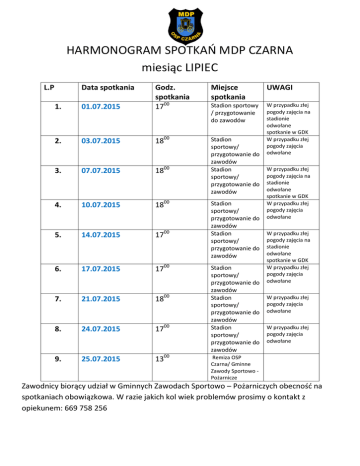 HARMONOGRAM SPOTKAŃ MDP CZARNA miesiąc LIPIEC L.P Data spotkania 1. 01.07.2015 Godz. spotkania 1700 2. 03.07.2015 1800 3. 07.07.2015 1800 4. 10.07.2015 1800 5. 14.07.2015 1700 6. 17.07.2015 1700 7. 21.07.2015 1800 8. 24.07.2015 1700 9. 25.07.2015 1300 Miejsce spotkania UWAGI Stadion sportowy / przygotowanie do zawodów Stadion sportowy/ przygotowanie do zawodów Stadion sportowy/ przygotowanie do zawodów W przypadku złej pogody zajęcia na stadionie odwołane spotkanie w GDK W przypadku złej pogody zajęcia odwołane Stadion sportowy/ przygotowanie do zawodów Stadion sportowy/ przygotowanie do zawodów Stadion sportowy/ przygotowanie do zawodów Stadion sportowy/ przygotowanie do zawodów Stadion sportowy/ przygotowanie do zawodów W przypadku złej pogody zajęcia na stadionie odwołane spotkanie w GDK W przypadku złej pogody zajęcia odwołane W przypadku złej pogody zajęcia na stadionie odwołane spotkanie w GDK W przypadku złej pogody zajęcia odwołane W przypadku złej pogody zajęcia odwołane W przypadku złej pogody zajęcia odwołane Remiza OSP Czarna/ Gminne Zawody Sportowo Pożarnicze Zawodnicy biorący udział w Gminnych Zawodach Sportowo – Pożarniczych obecność na spotkaniach obowiązkowa. W razie jakich kol wiek problemów prosimy o kontakt z opiekunem: 669 758 256