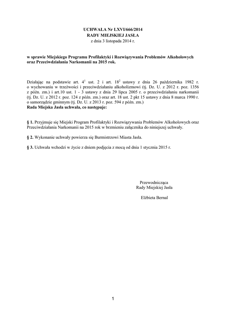 UCHWAŁA Nr LXVI/666/2014 RADY MIEJSKIEJ JASŁA z dnia 3 listopada 2014 r. w sprawie Miejskiego Programu Profilaktyki i Rozwiązywania Problemów Alkoholowych oraz Przeciwdziałania Narkomanii na 2015 rok. Działając na podstawie art. 41 ust. 2 i art. 182 ustawy z dnia 26 października 1982 r. o wychowaniu w trzeźwości i przeciwdziałaniu alkoholizmowi (tj. Dz. U. z 2012 r. poz. 1356 z późn. zm.) i art.10 ust. 1 - 3 ustawy z dnia 29 lipca 2005 r. o przeciwdziałaniu narkomanii (tj. Dz. U. z 2012 r. poz. 124 z późn. zm.) oraz art. 18 ust. 2 pkt 15 ustawy z dnia 8 marca 1990 r. o samorządzie gminnym (tj. Dz. U. z 2013 r. poz. 594 z późn. zm.) Rada Miejska Jasła uchwala, co następuje: § 1. Przyjmuje się Miejski Program Profilaktyki i Rozwiązywania Problemów Alkoholowych oraz Przeciwdziałania Narkomanii na 2015 rok w brzmieniu załącznika do niniejszej uchwały. § 2. Wykonanie uchwały powierza się Burmistrzowi Miasta Jasła. § 3. Uchwała wchodzi w życie z dniem podjęcia z mocą od dnia 1 stycznia 2015 r. Przewodnicząca Rady Miejskiej Jasła Elżbieta Bernal 1 Załącznik do Uchwały Nr LXVI/666/2014 Rady Miejskiej Jasła z dnia 3 listopada 2014 r. Urząd Miasta w Jaśle Miejski Program Profilaktyki i Rozwiązywania Problemów Alkoholowych oraz Przeciwdziałania Narkomanii na 2015 rok 2 I. WPROWADZENIE Miejski Program Profilaktyki i Rozwiązywania Problemów Alkoholowych oraz Przeciwdziałania Narkomanii na rok 2015 określa działania Miasta Jasła w zakresie profilaktyki oraz minimalizacji szkód społecznych i indywidualnych wynikających z nadużywania alkoholu i środków psychoaktywnych. Program jest kontynuacją zadań realizowanych w latach ubiegłych. Jest skierowany do mieszkańców miasta Jasła, którzy w życiu prywatnym lub zawodowym spotykają się z problemem nadużywania alkoholu i narkotyków oraz ich konsekwencjami, a także do wszystkich osób zainteresowanych tą problematyką. Charakteryzuje go wielopłaszczyznowe podejście do problemu, które jest niezbędne w przeciwdziałaniu i rozwiązywaniu problemów uzależnień. W zależności od zmieniających się potrzeb lokalnych, Program mając charakter dokumentu otwartego, podlega stosownym modyfikacjom. Podstawa prawna i merytoryczna programu Miejski Program Profilaktyki i Rozwiązywania Problemów Alkoholowych oraz Przeciwdziałania Narkomanii na 2015 rok opracowano na podstawie: 1. ustawy z dnia 26 października 1982 r. o wychowaniu w trzeźwości i przeciwdziałaniu alkoholizmowi (Dz. U. z 2012 r. poz. 1356 z późn. zm.). 2. ustawy z dnia 29 lipca 2005 r. o przeciwdziałaniu narkomanii (Dz. U. z 2012 r. poz. 124 z późn. zm.). 3. ustawy z dnia 12 marca 2004 r. o pomocy społecznej (Dz. U. z 2013 r. poz. 182 z późn. zm.) 4. ustawy z dnia 24 kwietnia 2003 r. o działalności pożytku publicznego i o wolontariacie (Dz. U. z 2010 r. Nr 234, poz. 1536 z późn. zm.). 5. ustawy z dnia 27 sierpnia 2009 r. o finansach publicznych (Dz. U. z 2013 r. poz. 885 z późń. zm.). 6. ustawy z dnia 29 stycznia 2004 r. Prawo zamówień publicznych (Dz. U. z 2013 r. poz. 907). 7. ustawy z dnia 15 kwietnia 2011 r. o działalności leczniczej (Dz. U. z 2013 r. poz. 217). 8. ustawy z dnia 19 sierpnia 1994 r. o ochronie zdrowia psychicznego (Dz. U. z 2011 r. Nr 231 poz. 1375 z późn. zm.). 9. ustawy z dnia 29 lipca 2005 r. o przeciwdziałaniu przemocy w rodzinie (Dz.U. z 2005 r. Nr 180, poz. 1493 z późn. zm.). Miejski Program Profilaktyki i Rozwiązywania Problemów Alkoholowych oraz Przeciwdziałania Narkomanii jest skorelowany z następującymi Programami: 1. Narodowym Programem Profilaktyki i Rozwiązywania Problemów Alkoholowych, 2. Krajowym Programem Przeciwdziałania Narkomanii. II. Strategia Rozwiązywania Problemów Społecznych oraz Raport dotyczący występujących na terenie Miasta Jasła patologii społecznych. Strategia Rozwiązywania Problemów Społecznych opracowana dla Miasta Jasła na lata 2013 – 2018 oraz Raport opracowany przez Miejski Ośrodek Pomocy Społecznej przedstawia następujące konkluzje w zakresie patologii społecznych: 1. Rośnie społeczna świadomość o problemie alkoholowym i otwarcie na szukanie fachowej pomocy. 2. Obserwuje się systematyczny wzrost ilości osób podejmujących dobrowolne leczenie odwykowe w Poradni Leczenia Uzależnień (w 2013 r. prawie co trzecia osoba decydowała się na dobrowolne poddanie się leczeniu w zakładzie lecznictwa 3 3. 4. 5. 6. 7. 8. odwykowego w stosunku do ogólnej liczby osób zgłoszonych do MKRPA, zaś w 2012 r. – jedynie co szósta).1 Ograniczenie dostępu do substancji psychoaktywnych, w tym alkoholu oraz edukacja publiczna w zakresie szkodliwości ich stosowania w ujęciu interdyscyplinarnym może istotnie zmniejszyć skalę zjawiska alkoholizmu. Zjawisko zażywania narkotyków jest zauważalne wśród młodych mieszkańców Jasła. Najpopularniejszym trunkiem wśród wszystkich (niezależnie od wieku) konsumentów alkoholu w Jaśle jest piwo. Młodzież jasielska najczęściej pije napoje alkoholowe w cudzych domach w celu poprawienia sobie nastroju oraz zaimponowania rówieśnikom. W zakresie ocen dostępności napojów alkoholowych odnotować trzeba powolną, ale konsekwentną pozytywną tendencję zmniejszania się odsetka uczniów określających swój dostęp, jako bardzo łatwy. Obniżenie wieku inicjacji alkoholowej i innych substancji psychoaktywnych wśród młodzieży (przypada na okres 12-15 lat). Na podstawie danych przedstawionych w Strategii nasuwają się następujące wnioski: 1. Kontynuacja realizacji projektu „Centrum Profilaktyki, Terapii i Wsparcia Rodzin w Jaśle” – udzielanie rodzinom, w których występują problemy alkoholowe bezpłatnej pomocy psychospołecznej i prawnej oraz ochrony przed przemocą w rodzinie. 2. Na stałym poziomie utrzymuje się liczba szkół podstawowych i gimnazjalnych realizujących programy profilaktyczne. Młodzież oczekuje ciekawych, efektywnych form prowadzonych
