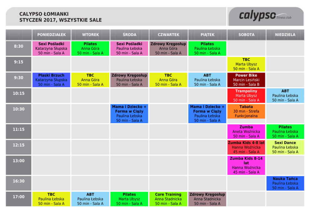 CALYPSO ŁOMIANKI STYCZEŃ 2017, WSZYSTKIE SALE 8:30 PONIEDZIAŁEK WTOREK ŚRODA CZWARTEK PIĄTEK Sexi Pośladki Katarzyna Słupska 50 min - Sala A Pilates Anna Góra 50 min - Sala A Sexi Pośladki Paulina Łebska 50 min - Sala A Zdrowy Kręgosłup Anna Góra 50 min - Sala A Pilates Paulina Łebska 50 min - Sala A Płaski Brzuch Katarzyna Słupska 50 min - Sala A TBC Anna Góra 50 min - Sala A Zdrowy Kręgosłup Paulina Łebska 50 min - Sala A TBC Anna Góra 50 min - Sala A ABT Paulina Łebska 50 min - Sala A Power Bike Marcin Lesiński 50 min - Sala B Trampoliny Marta Ubysz 50 min - Sala A 10:15 Mama i Dziecko + Forma w Ciąży Paulina Łebska 50 min - Sala A 10:30 Mama i Dziecko + Forma w Ciąży Paulina Łebska 50 min - Sala A 11:15 12:15 ABT Paulina Łebska 50 min - Sala A Tabata 30 min - Strefa Funkcjonalna Zumba Aneta Woźnicka 50 min - Sala A Pilates Paulina Łebska 50 min - Sala A Zumba Kids 4-8 lat Hanna Woźnicka 45 min - Sala A Sexi Dance Paulina Łebska 50 min - Sala A Zumba Kids 8-14 lat Hanna Woźnicka 45 min - Sala A 13:00 Nauka Tańca Paulina Łebska 50 min - Sala A 16:30 17:00 NIEDZIELA TBC Marta Ubysz 50 min - Sala A 9:15 9:30 SOBOTA TBC Paulina Łebska 50 min - Sala A ABT Paulina Łebska 50 min - Sala A Pilates Marta Ubysz 50 min - Sala A Core Training Anna Stadnicka 50 min - Sala A Zdrowy Kręgosłup Anna Stadnicka 50 min - Sala A 18:00 18:45 19:00 19:30 Trampoliny Paulina Łebska 50 min - Sala A Pump Piotr Końko 50 min - Sala A Trampoliny Marta Ubysz 50 min - Sala A Sexi Pośladki Anna Stadnicka 50 min - Sala A Fit Ball Anna Stadnicka 50 min - Sala A Power Bike Dominika Szwed 50 min - Sala B Power Bike Wojciech Walkiewicz 50 min - Sala B Power Bike Ewa Demczuk 60 min - Sala B Power Bike Wojciech Walkiewicz 50 min - Sala B Power Bike Marcin Lesiński 50 min - Sala B Zumba Aneta Woźnicka 50 min - Sala A Trampoliny Piotr Końko 50 min - Sala A TBC Marta Ubysz 50 min - Sala A Pilates Anna Stadnicka 50 min - Sala A Zumba Aneta Woźnicka 50 min - Sala A Express Brzuch 30 min - Strefa Funkcjonalna Express Brzuch 30 min - Strefa Funkcjonalna Express Brzuch 30 min - Strefa Funkcjonalna Express Brzuch 30 min - Strefa Funkcjonalna Express Brzuch 30 min - Strefa Funkcjonalna Power Bike Wojciech Walkiewicz 50 min - Sala B Power Bike Marcin Lesiński 50 min - Sala B Power Bike Wojciech Walkiewicz 50 min - Sala B 19:45 20:00 21:00 Body Shape Aleksandra Pokora 50 min - Sala A Pilates Roll Piotr Końko 50 min - Sala A Zumba Aneta Woźnicka 50 min - Sala A Aerobox Urszula Żmichowska 50 min - Sala A Latino Paulina Łebska 50 min - Sala A Cross Training Kamil Anuszkiewicz 50 min - Strefa Funkcjonalna Trening narciarski 30 min - Strefa Funkcjonalna Cross Training Kamil Anuszkiewicz 50 min - Strefa Funkcjonalna Trening narciarski 30 min - Strefa Funkcjonalna Cross Training Kamil Anuszkiewicz 50 min - Strefa Funkcjonalna Płaski Brzuch Aleksandra Pokora 50 min - Sala A Joga Kamila Klimas 50 min - Sala A Stretching Aneta Woźnicka 50 min - Sala A Zdrowy Kręgosłup Urszula Żmichowska 50 min - Sala A Joga Kamila Klimas 50 min - Sala A