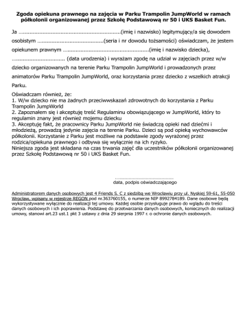 Zgoda opiekuna prawnego na zajęcia w Parku Trampolin JumpWorld w ramach półkolonii organizowanej przez Szkołę Podstawową nr 50 i UKS Basket Fun. Ja …............................................................(imię i nazwisko) legitymujący/a się dowodem osobistym …......................................(seria i nr dowodu tożsamości) oświadczam, że jestem opiekunem prawnym …..................................................(imię i nazwisko dziecka), ….............................. (data urodzenia) i wyrażam zgodę na udział w zajęciach przez w/w dziecko organizowanych na terenie Parku Trampolin JumpWorld i prowadzonych przez animatorów Parku Trampolin JumpWorld, oraz korzystania przez dziecko z wszelkich atrakcji Parku. Oświadczam również, że: 1. W/w dziecko nie ma żadnych przeciwwskazań zdrowotnych do korzystania z Parku Trampolin JumpWorld 2. Zapoznałem się i akceptuję treść Regulaminu obowiązującego w JumpWorld, który to regulamin znany jest również mojemu dziecku 3. Akceptuję fakt, że pracownicy Parku JumpWorld nie świadczą opieki nad dziećmi i młodzieżą, prowadzą jedynie zajęcia na terenie Parku. Dzieci są pod opieką wychowawców półkolonii. Korzystanie z Parku jest możliwe na podstawie zgody wyrażonej przez rodzica/opiekuna prawnego i odbywa się wyłącznie na ich ryzyko. Niniejsza zgoda jest składana na czas trwania zajęć dla uczestników półkolonii organizowanej przez Szkołę Podstawową nr 50 i UKS Basket Fun. …......................................... data, podpis oświadczającego Administratorem danych osobowych jest 4 Friends S. C z siedzibą we Wrocławiu przy ul. Nyskiej 59-61, 55-050 Wrocław, wpisany w rejestrze REGON pod nr.363760155, o numerze NIP 8992784189. Dane osobowe będą wykorzystywane wyłącznie do realizacji tej umowy. Każdej osobie przysługuje prawo do wglądu do treści danych osobowych i ich poprawienia. Podstawę do przetwarzania danych osobowych, koniecznych do realizacji umowy, stanowi art.23 ust.1 pkt 3 ustawy z dnia 29 sierpnia 1997 r. o ochronie danych osobowych.