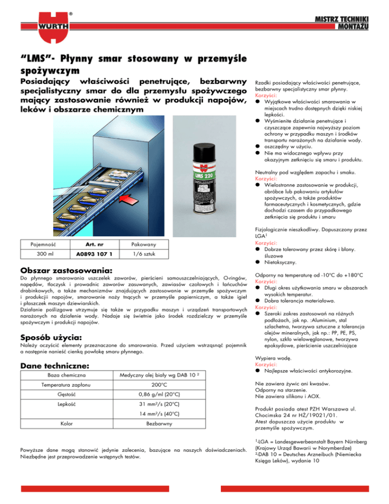 “LMS”- Płynny smar stosowany w przemyśle spożywczym Posiadający właściwości penetrujące, bezbarwny specjalistyczny smar do dla przemysłu spożywczego mający zastosowanie również w produkcji napojów, leków i obszarze chemicznym Rzadki posiadający właściwości penetrujące, bezbarwny specjalistyczny smar płynny. Korzyści: ● Wyjątkowe właściwości smarowania w miejscach trudno dostępnych dzięki niskiej lepkości. ● Wyśmienite działanie penetrujące i czyszczące zapewnia najwyższy poziom ochrony w przypadku maszyn i środków transportu narażonych na działanie wody. ● oszczędny w użyciu. ● Nie ma widocznego wpływu przy okazyjnym zetknięciu się smaru i produktu. Neutralny pod względem zapachu i smaku. Korzyści: ● Wielostronne zastosowanie w produkcji, obróbce lub pakowaniu artykułów spożywczych, a także produktów farmaceutycznych i kosmetycznych, gdzie dochodzi czasem do przypadkowego zetknięcia się produktu i smaru Art. nr Pakowany A0893 107 1 1/6 sztuk Pojemność 300 ml Obszar zastosowania: Do płynnego smarowania uszczelek zaworów, pierścieni samouszczelniających, O-ringów, napędów, tłoczysk i prowadnic zaworów zasuwanych, zawiasów czołowych i łańcuchów drabinkowych, a także mechanizmów znajdujących zastosowanie w przemyśle spożywczym i produkcjii napojów, smarowanie noży tnących w przemyśle papierniczym, a także igieł i płaszczek maszyn dziewiarskich. Działanie poślizgowe utrzymuje się także w przypadku maszyn i urządzeń transportowych narażonych na działenie wody. Nadaje się świetnie jako środek rozdzielczy w przemyśle spożywczym i produkcji napojów. Sposób użycia: Należy oczyścić elementy przeznaczone do smarowania. Przed użyciem wstrząsnąć pojemnik a następnie nanieść cienką powłokę smaru płynnego. Dane techniczne: Baza chemiczna Medyczny olej biały wg DAB 10 ² Temperatura zapłonu 200°C Gęstość 0,86 g/ml (20°C) Lepkość 31 mm²/s (20°C) 14 mm²/s (40°C) Kolor Bezbarwny Fizjologicznie nieszkodliwy. Dopuszczony przez LGA1 Korzyści: ● Dobrze tolerowany przez skórę i błony. śluzowe ● Nietoksyczny. Odporny na temperaturę od -10°C do +180°C Korzyści: ● Długi okres użytkowania smaru w obszarach wysokich temperatur. ● Dobra tolerancja materiałowa. Korzyści: ● Szeroki zakres zastosowań na różnych podłożach, jak np. :Aluminium, stal szlachetna, tworzywa sztuczne z tolerancja olejów mineralnych, jak np.: PP, PE, PS, nylon, szkło wielowęglanowe, tworzywa epoksydowe, pierścienie uszczelniające Wypiera wodę. Korzyści: ● Najlepsze właściwości antykorozyjne. Nie zawiera żywic ani kwasów. Odporny na starzenie. Nie zawiera silikonu i AOX. Produkt posiada atest PZH Warszawa ul. Chocimska 24 nr HŻ/19021/01. Atest dopuszcza użycie produktu w przemyśle spożywczym. 1-LGA Powyższe dane mogą stanowić jedynie zalecenia, bazujące na naszych doświadczeniach. Niezbędne jest przeprowadzenie wstępnych testów. = Landesgewerbeanstalt Bayern Nürnberg (Krajowy Urząd Bawarii w Norymberdze) ²-DAB 10 = Deutsches Arzneibuch (Niemiecka Księga Leków), wydanie 10