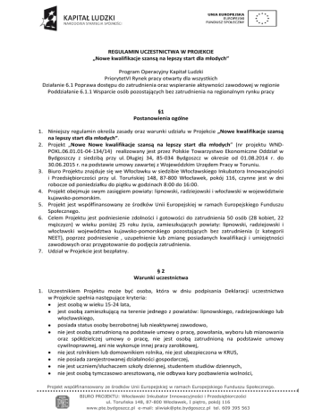 REGULAMIN UCZESTNICTWA W PROJEKCIE „Nowe kwalifikacje szansą na lepszy start dla młodych” Program Operacyjny Kapitał Ludzki PriorytetVI Rynek pracy otwarty dla wszystkich Działanie 6.1 Poprawa dostępu do zatrudnienia oraz wspieranie aktywności zawodowej w regionie Poddziałanie 6.1.1 Wsparcie osób pozostających bez zatrudnienia na regionalnym rynku pracy §1 Postanowienia ogólne 1. Niniejszy regulamin określa zasady oraz warunki udziału w Projekcie „Nowe kwalifikacje szansą na lepszy start dla młodych”. 2. Projekt „Nowe Nowe kwalifikacje szansą na lepszy start dla młodych” (nr projektu WNDPOKL.06.01.01-04-134/14) realizowany jest przez Polskie Towarzystwo Ekonomiczne Oddział w Bydgoszczy z siedzibą przy ul. Długiej 34, 85-034 Bydgoszcz w okresie od 01.08.2014 r. do 30.06.2015 r. na podstawie umowy zawartej z Wojewódzkim Urzędem Pracy w Toruniu. 3. Biuro Projektu znajduje się we Włocławku w siedzibie Włocławskiego Inkubatora Innowacyjności i Przedsiębiorczości przy ul. Toruoskiej 148, 87-800 Włocławek, pokój 116, czynne jest w dni robocze od poniedziałku do piątku w godzinach 8:00 do 16:00. 4. Projekt obejmuje swym zasięgiem powiaty: lipnowski, radziejowski i włocławski w województwie kujawsko-pomorskim. 5. Projekt jest współfinansowany ze środków Unii Europejskiej w ramach Europejskiego Funduszu Społecznego. 6. Celem Projektu jest podniesienie zdolności i gotowości do zatrudnienia 50 osób (28 kobiet, 22 mężczyzn) w wieku poniżej 25 roku życia, zamieszkujących powiaty: lipnowski, radziejowski i włocławski województwa kujawsko-pomorskiego pozostających bez zatrudnienia (z kategorii NEET), poprzez podniesienie , uzupełnienie lub zmianę posiadanych kwalifikacji i umiejętności zawodowych oraz przygotowanie do podjęcia zatrudnienia. 7. Udział w Projekcie jest bezpłatny. §2 Warunki uczestnictwa 1. Uczestnikiem Projektu może byd osoba, która w dniu podpisania Deklaracji uczestnictwa w Projekcie spełnia następujące kryteria: jest osobą w wieku 15-24 lata, jest osobą zamieszkującą na terenie jednego z powiatów: lipnowskiego, radziejowskiego lub włocławskiego, posiada status osoby bezrobotnej lub nieaktywnej zawodowo, nie jest osobą zatrudnioną na podstawie umowy o pracę, powołania, wyboru lub mianowania oraz spółdzielczej umowy o pracę, nie jest osobą zatrudnioną na podstawie umowy cywilnoprawnej, ani nie wykonuje innej pracy zarobkowej, nie jest rolnikiem lub domownikiem rolnika, nie jest ubezpieczona w KRUS, nie posiada zarejestrowanej działalności gospodarczej, nie jest uczniem/słuchaczem szkoły dziennej, studentem studiów dziennych, nie jest osobą tymczasowo aresztowaną, nie odbywa kary pozbawienia wolności, Projekt współfinansowany ze środków Unii Europejskiej w ramach Europejskiego Funduszu Społecznego. BIURO PROJEKTU: Włocławski Inkubator Innowacyjności i Przedsiębiorczości ul. Toruńska 148, 87-800 Włocławek, I piętro, pokój 116 www.pte.bydgoszcz.pl e-mail: [email protected] tel. 609 395 563 1 jestem osobą zdolną i gotową do podjęcia zatrudnienia w co najmniej połowie wymiaru czasu pracy. 2. W ramach projektu objętych wsparciem zostanie 50 osób (28 kobiet, 22 mężczyzn) w wieku 1524 lata, w tym: osoby bezrobotne (zarejestrowane w Powiatowych Urzędach Pracy) – 45 osób (27 K, 18M), osoby nieaktywne zawodowo – 5 osób (1K, 4M), osoby niepełnosprawne – 3 osoby (1K, 2M), osób z terenów wiejskich – 25 osób (14K, 11M) 3. Warunkiem uczestnictwa w Projekcie, po spełnieniu kryteriów określonych w § 2 p.1 niniejszego regulaminu, jest złożenie w Biurze Projektu (osobiście lub drogą pocztową) formularza rekrutacyjnego. Do formularza rekrutacyjnego należy dołączyd: zaświadczenie z Powiatowego Urzędu Pracy potwierdzające status osoby bezrobotnej (w tym długotrwale bezrobotnej) lub kserokopię decyzji o nadaniu statusu osoby bezrobotnej, kserokopię decyzji orzekającej o przyznaniu stopnia niepełnosprawności – w przypadku osoby niepełnosprawnej, oświadczenie o wyrażeniu zgody na przetwarzanie danych osobowych. §3 Zasady rekrutacji 1. Rekrutacja będzie prowadzona z zachowaniem zasady równości szans. 2. Rekrutacja prowadzona będzie w sposób ciągły, jednak nie dłużej niż do 30.09.2014 r. 3. W przypadku nie zebrania pełnych grup szkoleniowych Kierownik Projektu zastrzega sobie prawo wydłużenia terminu zakooczenia rekrutacji. 4. Zgłoszenia do udziału przyjmowane są we wszystkie dni pracujące tygodnia w godzinach od 8:00 do 15:00 (Włocławski Inkubator Innowacyjności i Przedsiębiorczości, ul. Toruoska 148, 87-800 Włocławek, I piętro, pokój 116; tel. 609 395 563; mail: [email protected]). 5. Złożone dokumenty zgłoszeniowe będą na bieżąco weryfikowane, a potencjalni uczestnicy będą niezwłocznie informowani o wyniku weryfikacji i ewentualnej konieczności poprawienia lub uzupełnienia dokumentów. 6. Po złożeniu kompletnej dokumentacji, poprawne zgłoszenia wprowadzane będą według daty ich wpływu do rejestru (baza danych w postaci tabeli MS Excel) utworzonej dla każdego rodzaju szkolenia. 7. W wyniku procesu rekrutacji zostanie utworzona lista podstawowa oraz lista rezerwowa. 8. W przypadku rezygnacji lub usunięcia Uczestnika z udziału w Projekcie zostanie on zastąpiony osobą z listy rezerwowej, spełniającą kryteria wskazane we wniosku. 9. Za moment przystąpienia Uczestnika do Projektu przyjmuje się chwilę podpisania deklaracji w Projekcie. §4 Kwalifikacja uczestników do Projektu 1. Zakwalifikowanie Uczestnika do Projektu zależy od: daty złożenia kompletu poprawnie wypełnionych dokumentów zgłoszeniowych i kserokopii dokumentów wymienionych w §2 p.3., tj. do 30.09.2014 r., przynależności do grup preferowanych, za które przyznawane będą punkty (zgodnie z poniższym podziałem): osoby niepełnosprawne – 1 pkt, osoby z terenów wiejskich – 1 pkt. Projekt współfinansowany ze środków U