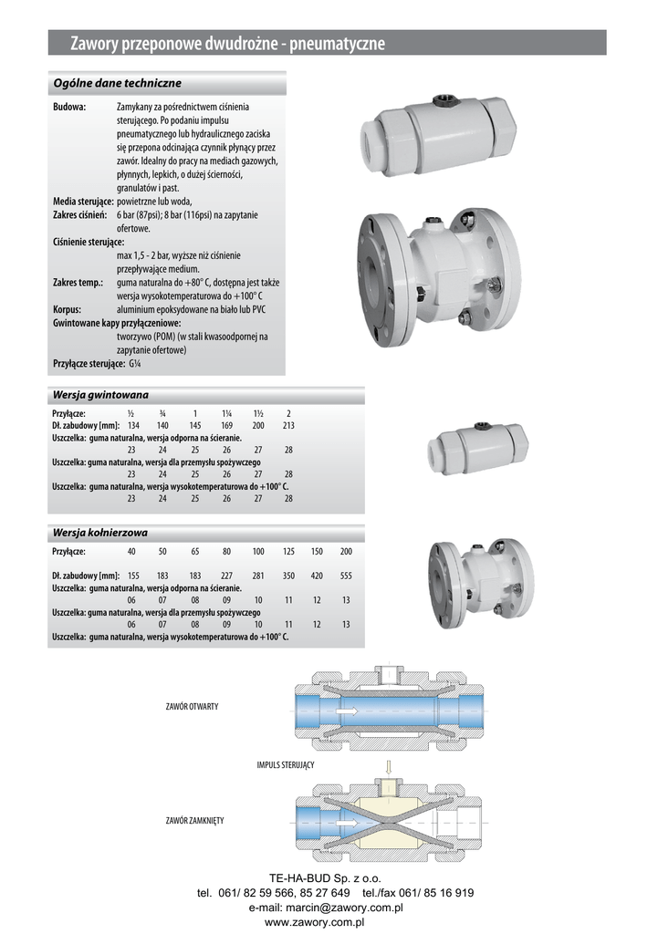 Zawory przeponowe dwudrożne - pneumatyczne Ogólne dane techniczne Zamykany za pośrednictwem ciśnienia sterującego. Po podaniu impulsu pneumatycznego lub hydraulicznego zaciska się przepona odcinająca czynnik płynący przez zawór. Idealny do pracy na mediach gazowych, płynnych, lepkich, o dużej ścierności, granulatów i past. Media sterujące: powietrzne lub woda, Zakres ciśnień: 6 bar (87psi); 8 bar (116psi) na zapytanie ofertowe. Ciśnienie sterujące: max 1,5 - 2 bar, wyższe niż ciśnienie przepływające medium. Zakres temp.: guma naturalna do +80° C, dostępna jest także wersja wysokotemperaturowa do +100° C Korpus: aluminium epoksydowane na biało lub PVC Gwintowane kapy przyłączeniowe: tworzywo (POM) (w stali kwasoodpornej na zapytanie ofertowe) Przyłącze sterujące: G¼ Budowa: Wersja gwintowana Przyłącze: ½ ¾ 1 1¼ 1½ 2 Dł. zabudowy [mm]: 134 140 145 169 200 213 Uszczelka: guma naturalna, wersja odporna na ścieranie. 23 24 25 26 27 28 Uszczelka: guma naturalna, wersja dla przemysłu spożywczego 23 24 25 26 27 28 Uszczelka: guma naturalna, wersja wysokotemperaturowa do +100° C. 23 24 25 26 27 28 Wersja kołnierzowa 125 150 200 Dł. zabudowy [mm]: 155 183 183 227 281 350 Uszczelka: guma naturalna, wersja odporna na ścieranie. 06 07 08 09 10 11 Uszczelka: guma naturalna, wersja dla przemysłu spożywczego 06 07 08 09 10 11 Uszczelka: guma naturalna, wersja wysokotemperaturowa do +100° C. 420 555 12 13 12 13 Przyłącze: 40 50 65 80 100 ZAWÓR OTWARTY IMPULS STERUJĄCY ZAWÓR ZAMKNIĘTY TE-HA-BUD Sp. z o.o. tel. 061/ 82 59 566, 85 27 649 tel./fax 061/ 85 16 919 e-mail: [email protected] www.zawory.com.pl otwor montazowy pilota sterujacego otwor montazowy pilota sterujacego kg1 kg2 6 0,4 - - 6 0,5 - G DN ØD L LF ØE ØM ØLk ØK ØF T A H PN 3/ 8 - 10 122 - 46 - - - - - G¼ - 6 ½ - 15 134 - 60 - - - - - G¼ - ¾ - 20 140 - 60 - - - - - G¼ 1 - 25 145 - 75 - - - - - G¼ - 6 0,6 - 1¼ - 32 169 - 85 - - - - - G¼ - 6 0,8 - 1½ 40 40 200 155 101 150 110 18 88 32 G¼ 63 6 1,6 3,2 2 50 50 213 183 120 165 125 18 102 30 G¼ 60 6 2,1 3,5 - 65 - - 183 - 185 145 18 122 32 G¼ 77 6 - 5,0 - 80 - - 227 - 200 160 18 133 32 G¼ 89 6 - 6,0 - 100 - - 281 - 220 180 18 158 35 G¼ 107 6 - 8,0 - 125 - - 350 - 250 210 18 184 39 G¼ 130,0 6 - 12,0 - 150 - - 420 - 286 240 22 212 43 G¼ 155,5 6 - 17,0 60 G3/8 201,0 4 - 35,0 49 G3/8 258,0 2 - 84,0 - 200 250 - - 555 - 610 1) = wersja gwintowana - korpus z PVC - 340 395 295 350 22 22 269 320 2) = wersja kołnierzowa TE-HA-BUD Sp. z o.o. tel. 061/ 82 59 566, 85 27 649 tel./fax 061/ 85 16 919 e-mail: [email protected] www.zawory.com.pl