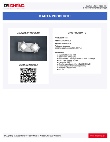 telefon: +48 61 4367 481 e-mail: [email protected] KARTA PRODUKTU ZDJĘCIE PRODUKTU OPIS PRODUKTU Producent Trio Nazwa GRENOBLE Symbol 278970206 Rekomendowana cena konsumencka 525.21 PLN ZOBACZ WIĘCEJ Parametry ● wysokość (mm): 150 ● szerokość (mm): 340 ● ilość źródeł / rodzaj trzonka: 2 x LED zintegr. ● max moc źródła: 4,5 W ● napięcie: 230 V ● źródło w zestawie: 2 x 4,5W LED SMD ● kolor lampy: chrom/transparentny ● materiał: metal/szkło ● IP: 20 DELighting ul.Budowlana 10 Psary Małe k. Wrześni, 62-300 Września www.delighting.pl