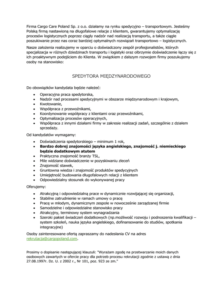 Firma Cargo Care Poland Sp. z o.o. działamy na rynku spedycyjno – transportowym. Jesteśmy Polską firmą nastawioną na długofalowe relacje z klientem, gwarantujemy optymalizację procesów logistycznych poprzez ciągły nadzór nad realizacją transportu, a także ciągłe poszukiwanie przez nas coraz bardziej optymalnych rozwiązań transportowo – logistycznych. Nasze założenia realizujemy w oparciu o doświadczony zespół profesjonalistów, których specjalizacja w różnych dziedzinach transportu i logistyki oraz olbrzymie doświadczenie łączy się z ich proaktywnym podejściem do Klienta. W związkiem z dalszym rozwojem firmy poszukujemy osoby na stanowisko: SPEDYTORA MIĘDZYNARODOWEGO Do obowiązków kandydata będzie należeć: • • • • • • • Operacyjna praca spedytorska, Nadzór nad procesami spedycyjnymi w obszarze międzynarodowym i krajowym, Kwotowanie, Współpraca z przewoźnikami, Koordynowanie współpracy z klientami oraz przewoźnikami, Optymalizacja procesów operacyjnych, Współpraca z innymi działami firmy w zakresie realizacji zadań, szczególnie z działem sprzedaży. Od kandydatów wymagamy: • • • • • • • • Doświadczenia spedytorskiego – minimum 1 rok, Bardzo dobrej znajomości języka angielskiego, znajomość j. niemieckiego będzie dodatkowym atutem Praktyczna znajomość branży TSL, Mile widziane doświadczenie w pozyskiwaniu zleceń Znajomość stawek, Gruntowna wiedza i znajomość produktów spedycyjnych Umiejętność budowania długofalowych relacji z klientem Odpowiedzialny stosunek do wykonywanej pracy Oferujemy: • • • • • • Atrakcyjną i odpowiedzialną prace w dynamicznie rozwijającej się organizacji, Stabilne zatrudnienie w ramach umowy o pracę Pracę w młodym, dynamicznym zespole w nowocześnie zarządzanej firmie Samodzielne i odpowiedzialne stanowisko pracy Atrakcyjny, terminowy system wynagradzania Szeroki pakiet świadczeń dodatkowych (np.możliwość rozwoju i podnoszenia kwalifikacji – system szkoleń, nauka języka angielskiego, dofinansowanie do studiów, spotkania integracyjne) Osoby zainteresowane ofertą zapraszamy do nadesłania CV na adres [email protected]. Prosimy o dopisanie następującej klauzuli: "Wyrażam zgodę na przetwarzanie moich danych osobowych zawartych w ofercie pracy dla potrzeb procesu rekrutacji zgodnie z ustawą z dnia 27.08.1997r. Dz. U. z 2002 r., Nr 101, poz. 923 ze zm."