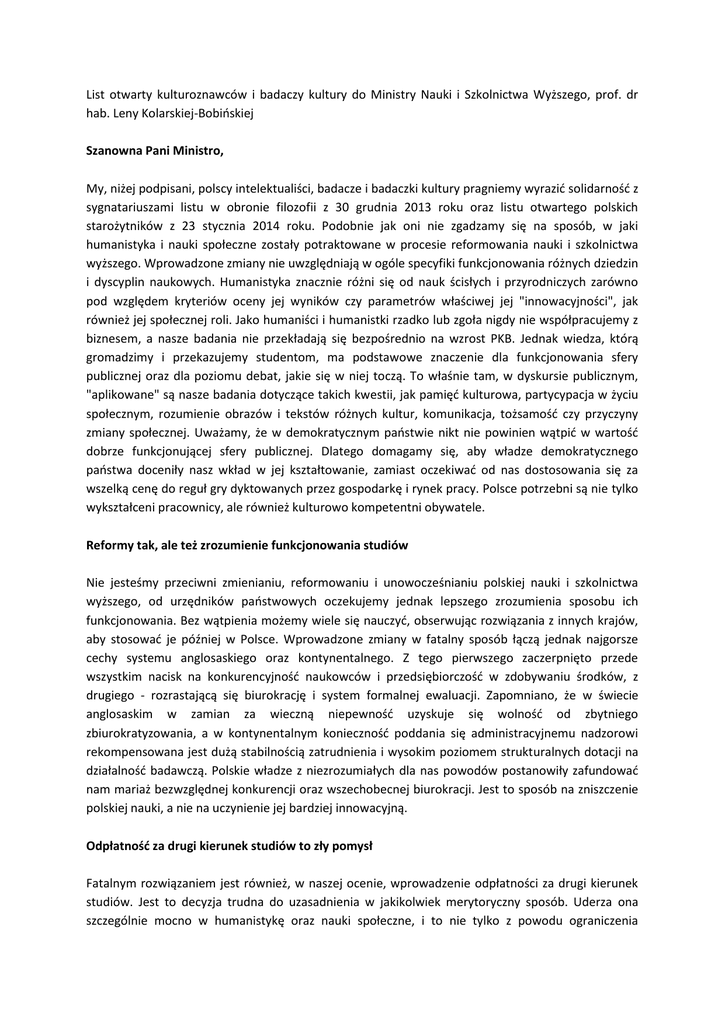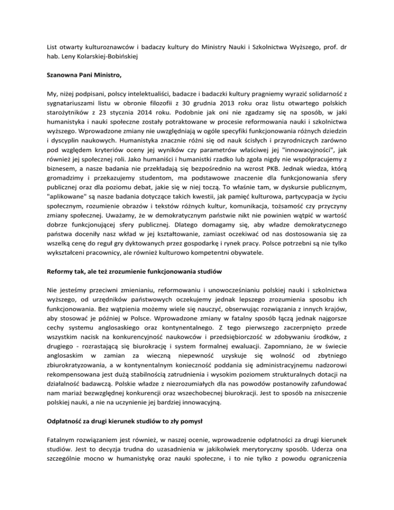 List otwarty kulturoznawców i badaczy kultury do Ministry Nauki i Szkolnictwa Wyższego, prof. dr hab. Leny Kolarskiej-Bobińskiej Szanowna Pani Ministro, My, niżej podpisani, polscy intelektualiści, badacze i badaczki kultury pragniemy wyrazić solidarność z sygnatariuszami listu w obronie filozofii z 30 grudnia 2013 roku oraz listu otwartego polskich starożytników z 23 stycznia 2014 roku. Podobnie jak oni nie zgadzamy się na sposób, w jaki humanistyka i nauki społeczne zostały potraktowane w procesie reformowania nauki i szkolnictwa wyższego. Wprowadzone zmiany nie uwzględniają w ogóle specyfiki funkcjonowania różnych dziedzin i dyscyplin naukowych. Humanistyka znacznie różni się od nauk ścisłych i przyrodniczych zarówno pod względem kryteriów oceny jej wyników czy parametrów właściwej jej "innowacyjności", jak również jej społecznej roli. Jako humaniści i humanistki rzadko lub zgoła nigdy nie współpracujemy z biznesem, a nasze badania nie przekładają się bezpośrednio na wzrost PKB. Jednak wiedza, którą gromadzimy i przekazujemy studentom, ma podstawowe znaczenie dla funkcjonowania sfery publicznej oraz dla poziomu debat, jakie się w niej toczą. To właśnie tam, w dyskursie publicznym, "aplikowane" są nasze badania dotyczące takich kwestii, jak pamięć kulturowa, partycypacja w życiu społecznym, rozumienie obrazów i tekstów różnych kultur, komunikacja, tożsamość czy przyczyny zmiany społecznej. Uważamy, że w demokratycznym państwie nikt nie powinien wątpić w wartość dobrze funkcjonującej sfery publicznej. Dlatego domagamy się, aby władze demokratycznego państwa doceniły nasz wkład w jej kształtowanie, zamiast oczekiwać od nas dostosowania się za wszelką cenę do reguł gry dyktowanych przez gospodarkę i rynek pracy. Polsce potrzebni są nie tylko wykształceni pracownicy, ale również kulturowo kompetentni obywatele. Reformy tak, ale też zrozumienie funkcjonowania studiów Nie jesteśmy przeciwni zmienianiu, reformowaniu i unowocześnianiu polskiej nauki i szkolnictwa wyższego, od urzędników państwowych oczekujemy jednak lepszego zrozumienia sposobu ich funkcjonowania. Bez wątpienia możemy wiele się nauczyć, obserwując rozwiązania z innych krajów, aby stosować je później w Polsce. Wprowadzone zmiany w fatalny sposób łączą jednak najgorsze cechy systemu anglosaskiego oraz kontynentalnego. Z tego pierwszego zaczerpnięto przede wszystkim nacisk na konkurencyjność naukowców i przedsiębiorczość w zdobywaniu środków, z drugiego - rozrastającą się biurokrację i system formalnej ewaluacji. Zapomniano, że w świecie anglosaskim w zamian za wieczną niepewność uzyskuje się wolność od zbytniego zbiurokratyzowania, a w kontynentalnym konieczność poddania się administracyjnemu nadzorowi rekompensowana jest dużą stabilnością zatrudnienia i wysokim poziomem strukturalnych dotacji na działalność badawczą. Polskie władze z niezrozumiałych dla nas powodów postanowiły zafundować nam mariaż bezwzględnej konkurencji oraz wszechobecnej biurokracji. Jest to sposób na zniszczenie polskiej nauki, a nie na uczynienie jej bardziej innowacyjną. Odpłatność za drugi kierunek studiów to zły pomysł Fatalnym rozwiązaniem jest również, w naszej ocenie, wprowadzenie odpłatności za drugi kierunek studiów. Jest to decyzja trudna do uzasadnienia w jakikolwiek merytoryczny sposób. Uderza ona szczególnie mocno w humanistykę oraz nauki społeczne, i to nie tylko z powodu ograniczenia napływu studentów. W tych obszarach wiedzy dominującym paradygmatem jest przekraczanie podziałów dyscyplinarnych na rzecz podejścia nazywanego inter-, multi-, trans- czy unidyscyplinarnym. Nakaz ograniczenia studiów do jednego kierunku pod sankcją kary pieniężnej tak bowiem w praktyce wygląda ten przepis - jest dla humanistyki i nauk społecznych wysoce szkodliwy, ponieważ godzi w ich najbardziej nowatorskie formy aktywności. Jest to szczególnie odczuwalne w przypadku badania kultury. Polskie kulturoznawstwo zarówno w warstwie metodologicznej, jak i instytucjonalnej, ma bogate i niejednorodne korzenie. Łączy przedstawicieli różnych specjalności i dyscyplin naukowych: antropologów, filozofów, filologów, teatrologów, socjologów, filmoznawców, historyków. Wspólny cel - badanie szeroko rozumianej kultury symbolicznej i materialnej - wymaga ciągłego poszukiwania nowych perspektyw naukowych umożliwiających zrozumienie różnorodnych zjawisk społecznych - od opery, poprzez sport, aż po gospodarkę. Wybitni XX-wieczni polscy badacze i badaczki kultury o światowej renomie - np. Stanisław Brzozowski, Bronisław Malinowski, Florian Znaniecki, Stefan Czarnowski, Maria Ossowska, Jerzy Grotowski czy Leszek Kołakowski - wywodzili się z różnych dziedzin humanistyki; to, co ich łączyło, to odrzucenie starych paradygmatów i otwarte podejście do badanych zagadnień. Polska humanistyka i nauki społeczne były interdyscyplinarne wiele dekad, zanim samo to pojęcie stało się popularne. W imię ich dalszego rozwoju domagamy się jak najszybszego odejścia od zakazu bezpłatnego studiowania więcej niż jednego kierunku, ponieważ przepis ten uderza w najbardziej ambitnych studentów i najbardziej nowatorskie inicjatywy naukowe. Podobnie jak koledzy i koleżanki zajmujący się filozofią oraz filologią klasyczną dostrzegamy zagrożenie, jakie odpłatność za studiowanie na drugim kierunku stanowi dla jednostek prowadzących studia humanistycznospołeczne. Jest dla nas niezrozumiałe, dlaczego władze państwowe wprowadzają regulacje równie szkodliwe dla państwowych uczelni w sytuacji, kiedy równocześnie uderza w nie niż demograficzny. Od władz tych oczekujemy działań przyczyniających się do ochrony dobra wspólnego, jakim jest darmowa edukacja oferowana przez publiczne szkoły wyższe. Zmienić sposób finansowania szkół wyższych Ostatnia kwestia, na któr