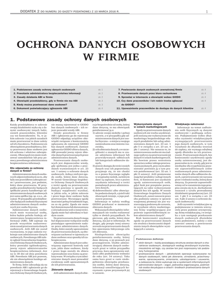 DODATEK 2 1 DO NUMERU 20 GAZETY PODATKOWEJ Z 10 MARCA 2016 R. OCHRONA DANYCH OSOBOWYCH W FIRMIE 1. Podstawowe zasady ochrony danych osobowych str. 1 7. Powierzenie danych osobowych zewnętrznej firmie str. 4 2. Powołanie administratora bezpieczeństwa informacji str. 2 8. Przetwarzanie danych przez biura rachunkowe str. 4 3. Zasady działania ABI w firmie str. 2 9. Sprzedaż w internecie a obowiązki wobec GIODO str. 4 4. Obowiązki przedsiębiorcy, gdy w firmie nie ma ABI str. 3 10. Czy dane pracowników i ich rodzin trzeba zgłaszać str. 4 5. Kiedy można przetwarzać dane osobowe? str. 3 6. Dokument poświadczający zgłoszenie ABI str. 4 do GIODO? 11. Upoważnienie pracowników do dostępu do danych klientów str. 4 1. Podstawowe zasady ochrony danych osobowych Każdy przedsiębiorca w zakresie swojej działalności styka się z danymi osobowymi innych ludzi, swoich pracowników, klientów czy też kontrahentów. To, w jakim zakresie i na jakich zasadach może przetwarzać te dane zależy od ich charakteru. Podstawowym obowiązkiem przedsiębiorcy, który przetwarza dane osobowe jest ich ochrona i właściwe zabezpieczenie. Obowiązek ten może realizować samodzielnie lub przy pomocy powołanego administratora bezpieczeństwa informacji. Kto odpowiada za ochronę danych w firmie? Administratorem danych osobowych odpowiedzialnym za to, aby były one prawidłowo zabezpieczone i przetwarzane, jest podmiot, który dane przetwarza. W przypadku przedsiębiorców będących spółkami prawa handlowego administratorem danych osobowych jest sama spółka (np. sp. z o.o., akcyjna). W przypadku przedsiębiorców będących osobami fizycznymi administratorem danych osobowych jest osoba fizyczna. Administrator danych osobowych może wyznaczyć osobę, która będzie pełniła funkcję administratora bezpieczeństwa informacji (ABI). ABI zajmuje się przede wszystkim nadzorowaniem zasad przetwarzania danych osobowych. Jeśli ABI nie został wyznaczony, to jego zadania wykonuje sam administrator danych osobowych. Powołanego ABI należy zgłosić Generalnemu Inspektorowi Ochrony Danych Osobowych, który prowadzi ogólnokrajowy, jawny rejestr administratorów bezpieczeństwa informacji. Jest na to 30 dni od dnia powołania ABI. Powołanie ABI jest prawem, ale nie obowiązkiem każdego administratora danych. Te firmy, które zdecydują się na powołanie ABI i zgłoszenie go do rejestracji u Generalnego Inspektora Ochrony Danych Osobowych, nie muszą rejestrować w GIODO baz danych osobowych – ich rejestr prowadzi wtedy ABI. Dzięki powołaniu w firmie ABI i zgłoszeniu go do rejestracji GIODO odpadają uciążliwe obowiązki związane z koniecznością zgłaszania do rejestracji GIODO baz danych osobowych. Zamiast zgłoszenia GIODO zbioru danych, ABI prowadzi jawny rejestr zbiorów danych przetwarzanych przez administratora danych. Przetwarzanie danych osobowych jest dopuszczalne wtedy, gdy spełniona jest jedna z przesłanek wymienionych w art. 23 ust. 1 ustawy o ochronie danych osobowych. Jedną z nich jest zgoda osoby, której dane dotyczą. W ocenie Generalnego Inspektora Ochrony Danych Osobowych z treści zgody na przetwarzanie danych powinno w sposób niebudzący wątpliwości wynikać, w jakim celu, w jakim zakresie i przez kogo dane osobowe będą przetwarzane. Wyrażający zgodę musi mieć pełną świadomość tego, na co się godzi. Zgoda nie może być domniemana lub dorozumiana z oświadczenia woli o innej treści. Zgoda może być odwołana w każdym czasie. Do przetwarzania danych mogą być dopuszczone wyłącznie osoby posiadające upoważnienie nadane przez administratora danych. Osoby, które zostały upoważnione do przetwarzania danych, są obowiązane zachować w tajemnicy te dane osobowe oraz sposoby ich zabezpieczenia. Administrator danych jest zobowiązany zapewnić kontrolę nad tym, jakie dane osobowe, kiedy i przez kogo zostały do zbioru wprowadzone oraz komu są przekazywane. W związku z tym administrator danych musi prowadzić ewidencję osób upoważnionych do ich przetwarzania. Zbieranie danych Jeśli administrator danych zbie- ra je bezpośrednio od osoby, której dane dotyczą, to ma obowiązek poinformować ją o: 1) adresie swojej siedziby i pełnej nazwie, a w przypadku gdy administratorem danych jest osoba fizyczna – o miejscu swojego zamieszkania oraz imieniu i nazwisku, 2) celu zbierania danych, a w szczególności o znanych mu w czasie udzielania informacji lub przewidywanych odbiorcach lub kategoriach odbiorców danych, 3) prawie dostępu do treści swoich danych oraz ich poprawiania; przyjmuje się, że nie chodzi tu o prawo fizycznego wglądu w oryginalny nośnik, na którym dane są zapisane, lecz o prawo uzyskania informacji o treści posiadanych przez administratora danych, 4) dobrowolności albo obowiązku podania danych, a jeżeli taki obowiązek istnieje, o jego podstawie prawnej. Informacje te należy według GIODO przekazać w momencie zbierania danych. Wskazanych obowiązków informacyjnych nie trzeba realizować tylko w dwóch przypadkach. Po pierwsze, gdy osoba, której dane dotyczą, ma już te informacje. Po drugie, gdy przepis innej ustawy zezwala na przetwarzanie danych bez ujawniania faktycznego celu ich zbierania. Niedopełnienie obowiązku poinformowania osoby, której dane dotyczą, o jej prawach jest przestępstwem. Osobie administrującej zbiorem danych osobowych grozi w takim przypadku grzywna, kara ograniczenia wolności albo pozbawienia wolności do roku (art. 54 ustawy). Taka sama kara grozi w razie niedopełnienia obowiązku przekazania osobie, której dane dotyczą, informacji umożliwiających korzystanie z praw przyznanych jej w ustawie. Wykorzystanie danych w celach marketingowych Zgody na przetwarzanie danych osobowych nie trzeba uzyskiwać, jeśli zostaną one wykorzystane do marketingu bezpośredniego własnych produktów lub usług administratora danych (art. 23 ust. 1 pkt 5 w związku z art. 23 ust. 4 pkt 1 usta